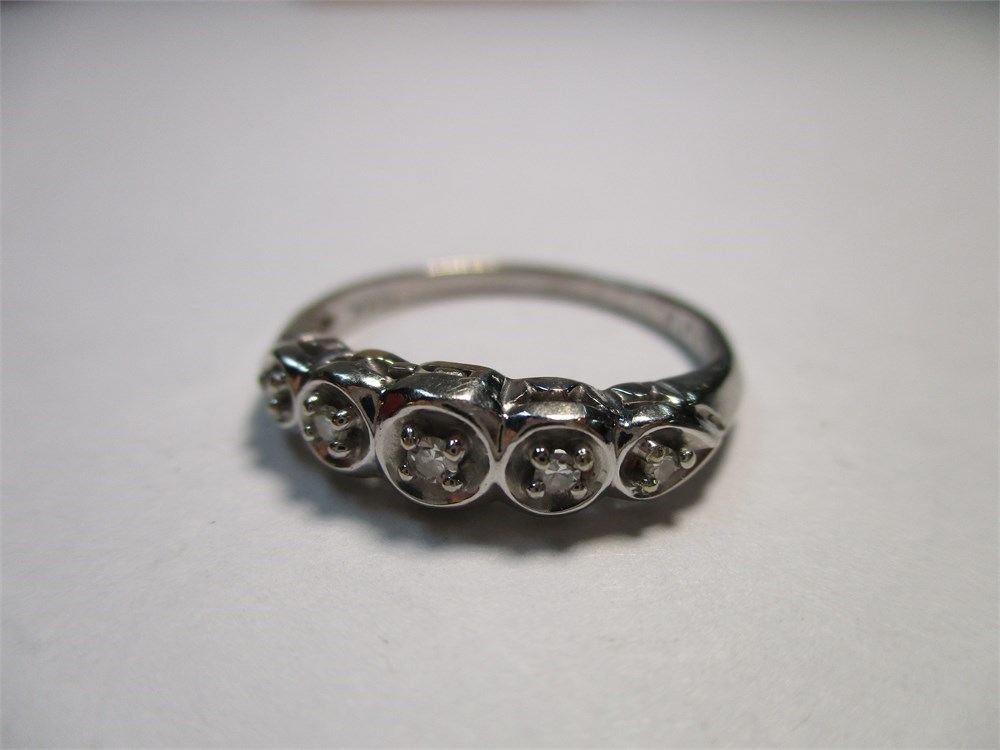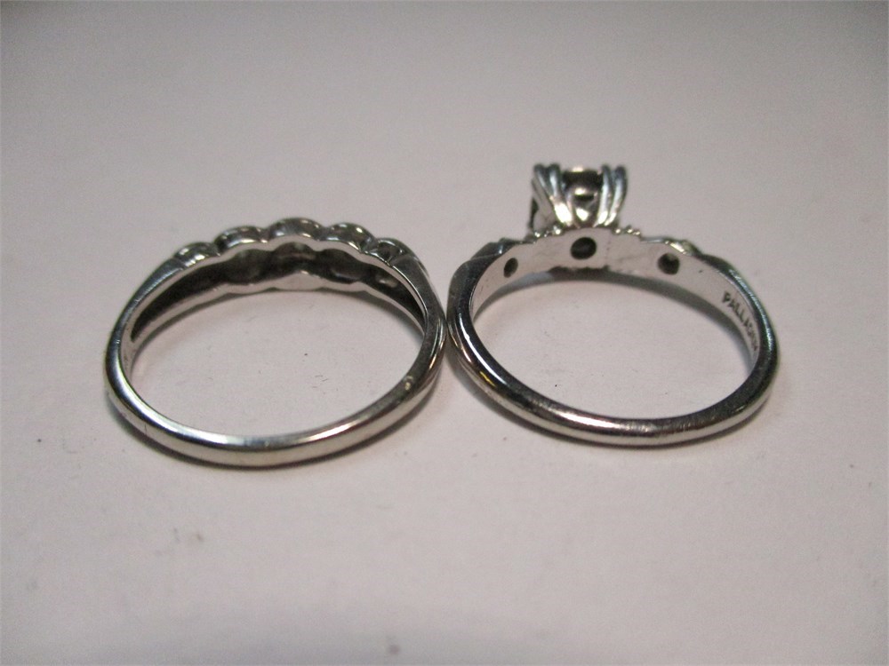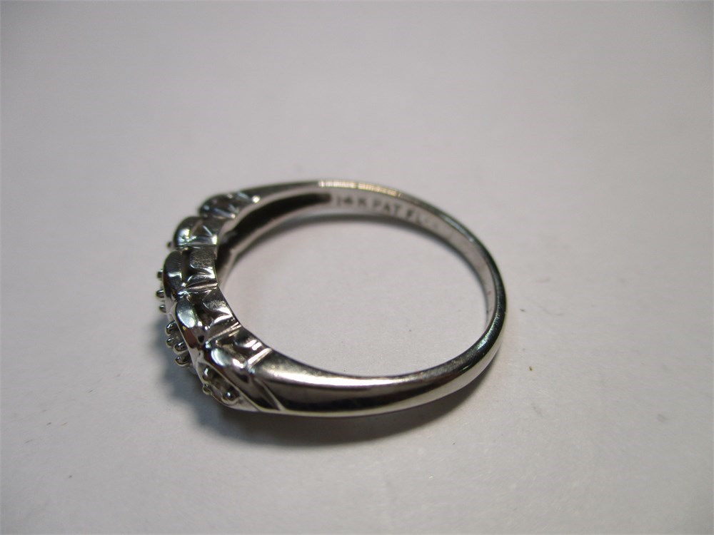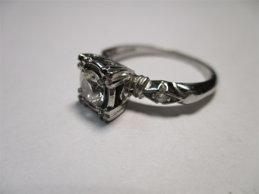 This is a lovely vintage Diamond & 14K White Gold and Palladium Engagement and Wedding Band set. The Wedding Band has 4 round, prong set, graduated diamonds and the Engagement Band has a round prong set stone in a high profile setting. 5.30 gtw.  It will fit a size 6.  It comes in the original box.