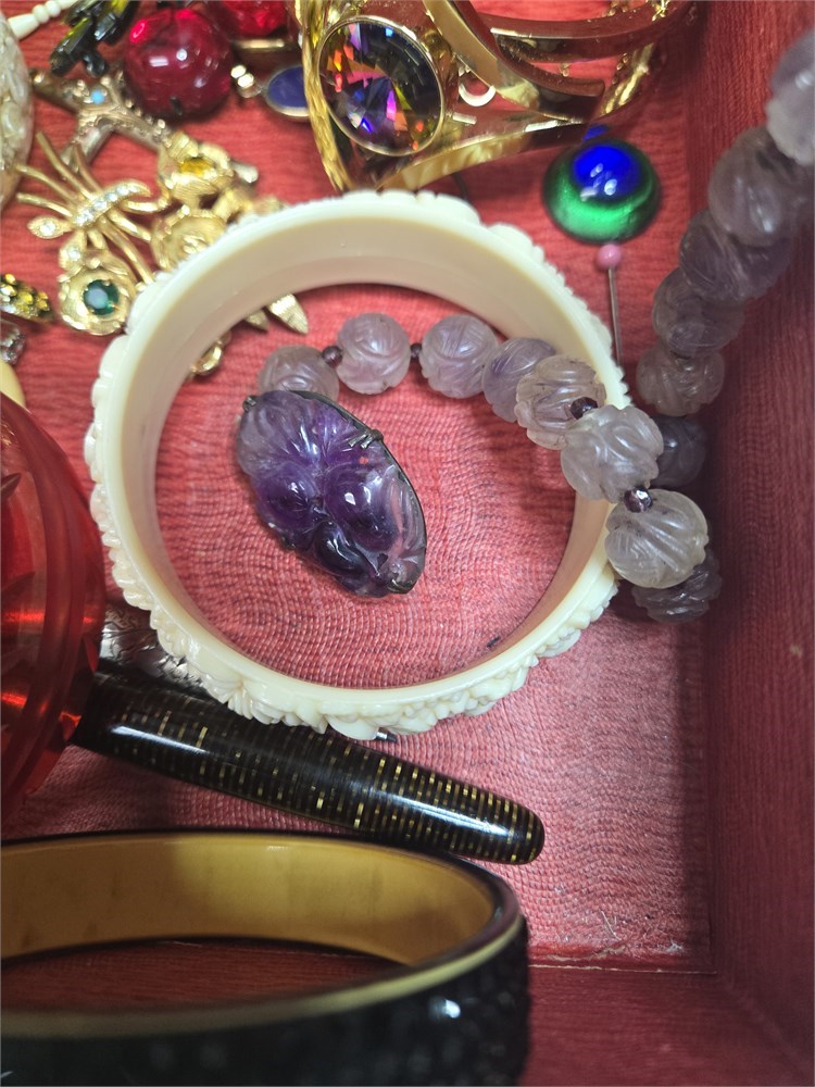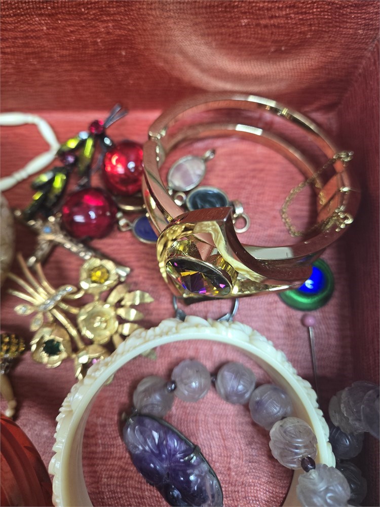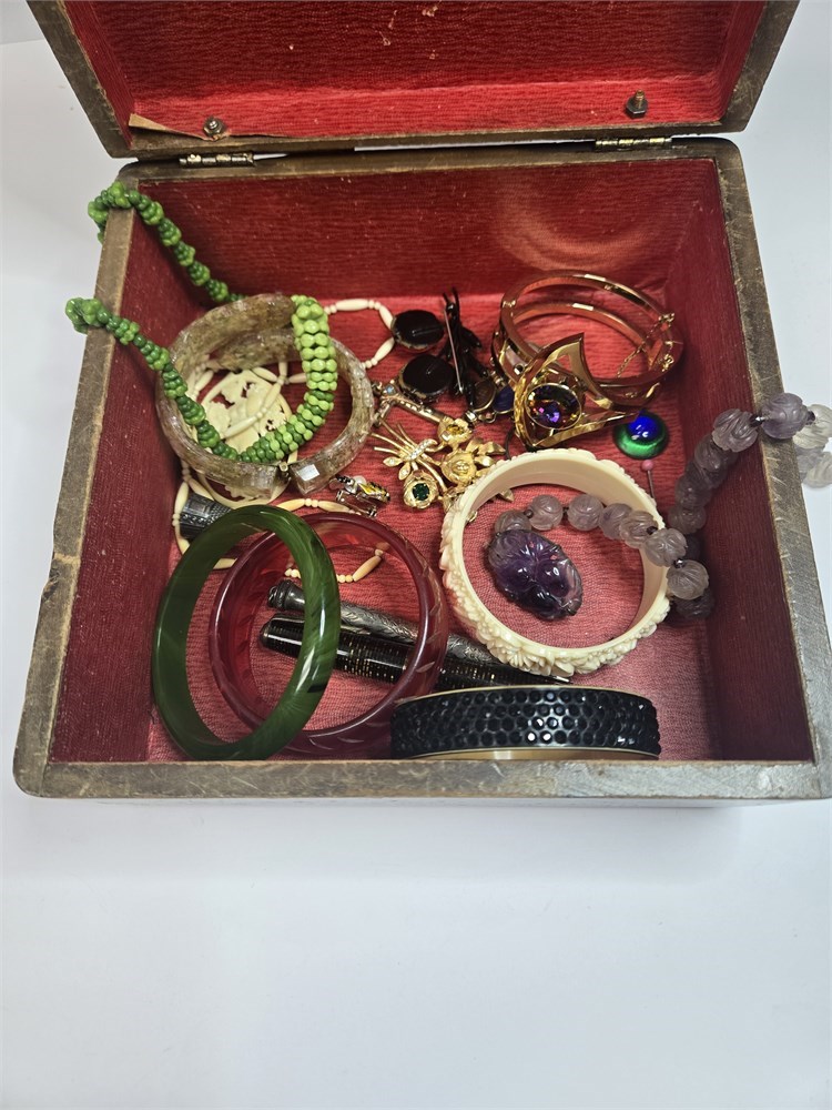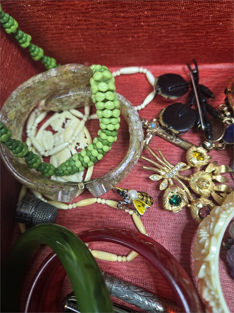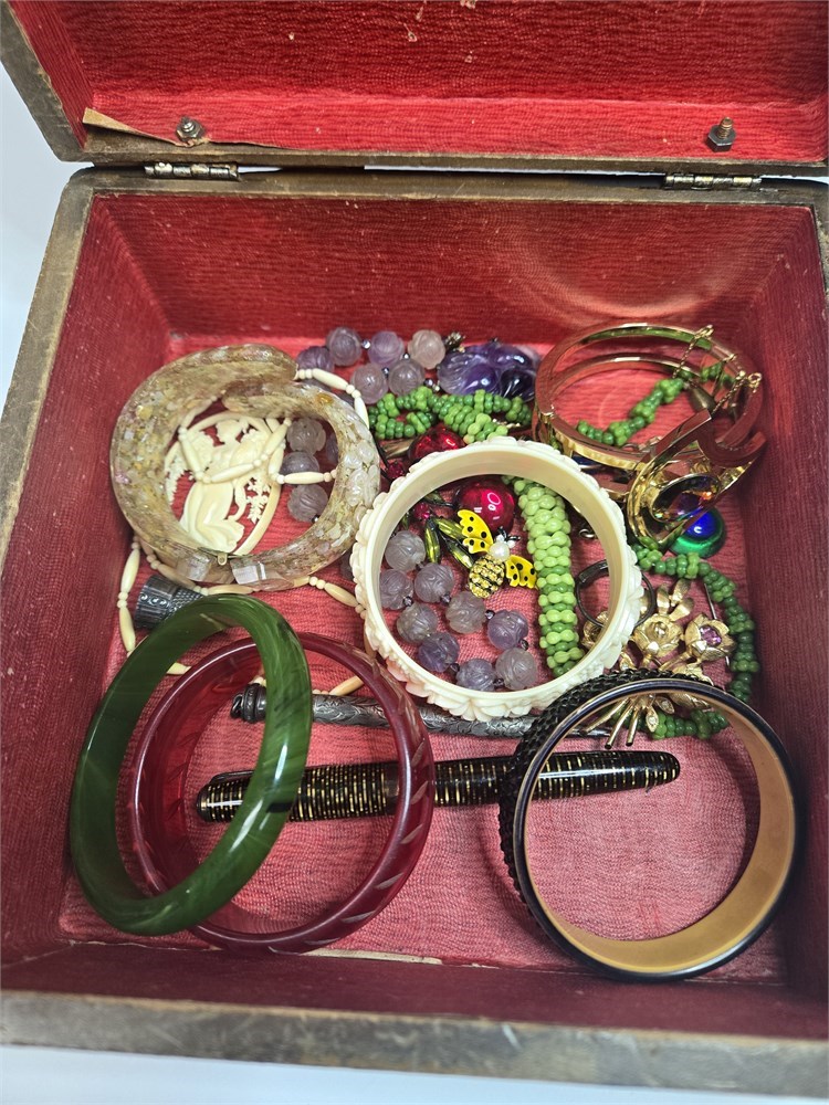 Nice lot of misc jewelry and other nice pieces. Box handle test bakelite (and bracelet) its worn but still nice.