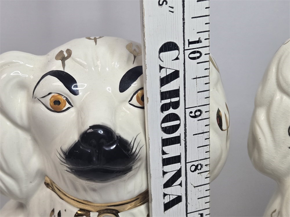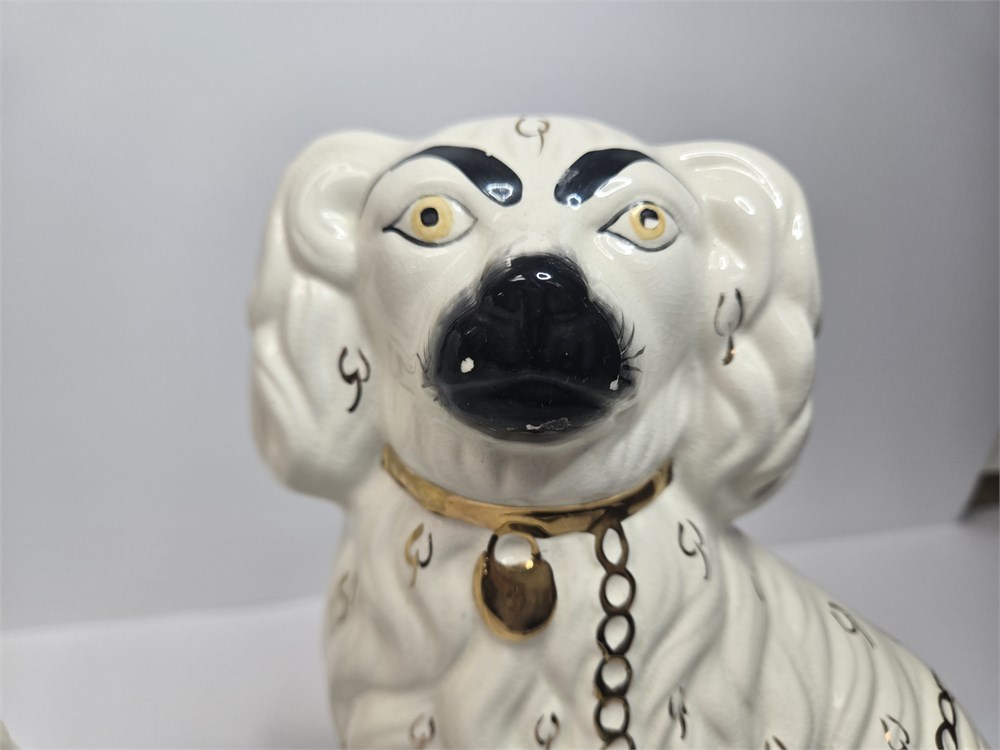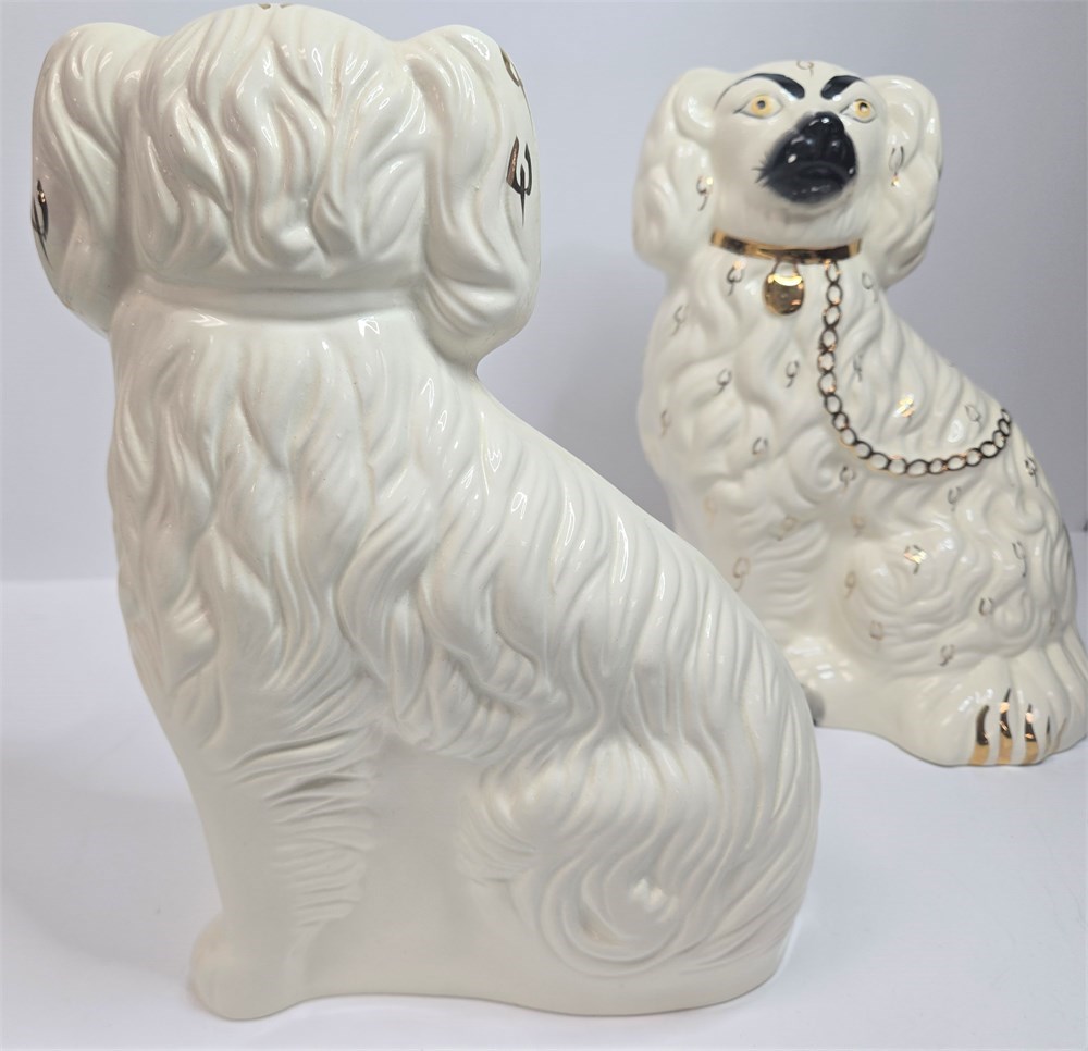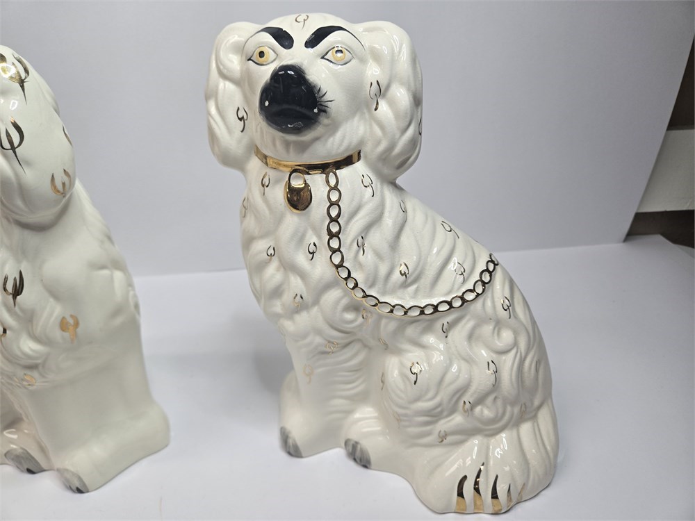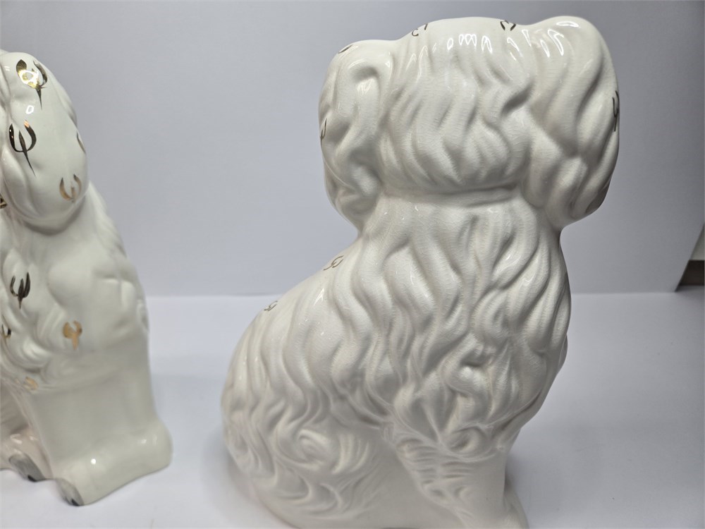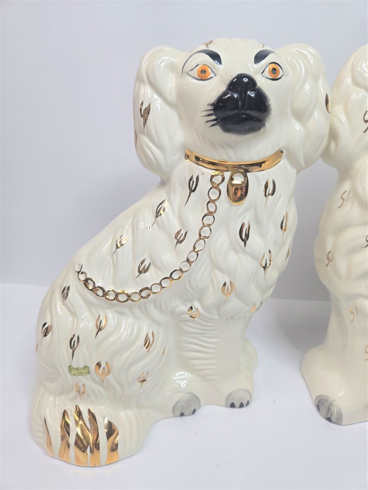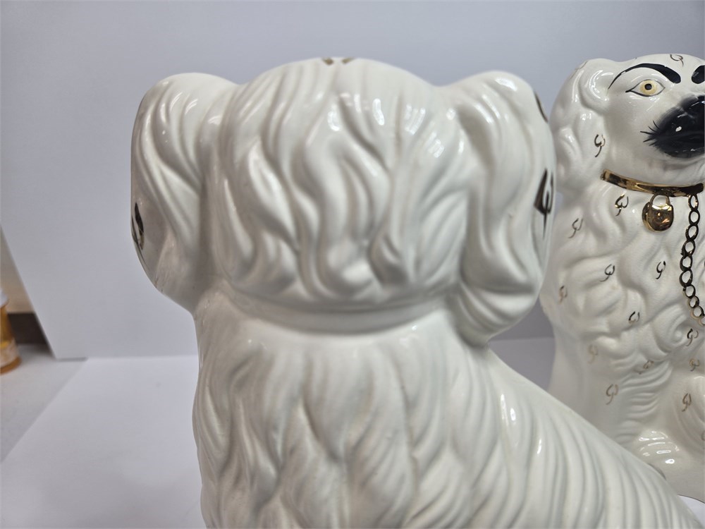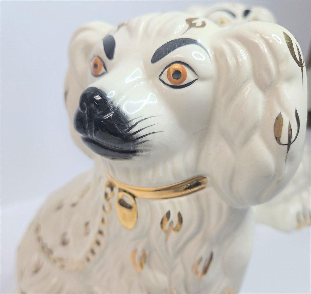 Charming matched pair of vintage ceramic Spaniel mantel dogs each standing approx. 10" tall.  Both figures feature glossy white glaze, hand-painted gilt locket and chain, black muzzle and eyebrows and classic Victorian-style detailing.  Bases are embossed Germany / England 1378-3 confirming mid-20th century production inspired by earlier Staffordshire originals.  No cracks or repairs noted.  Only a couple of paint flakes found on the nose of one.