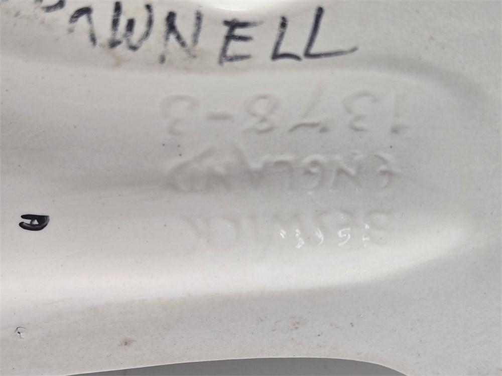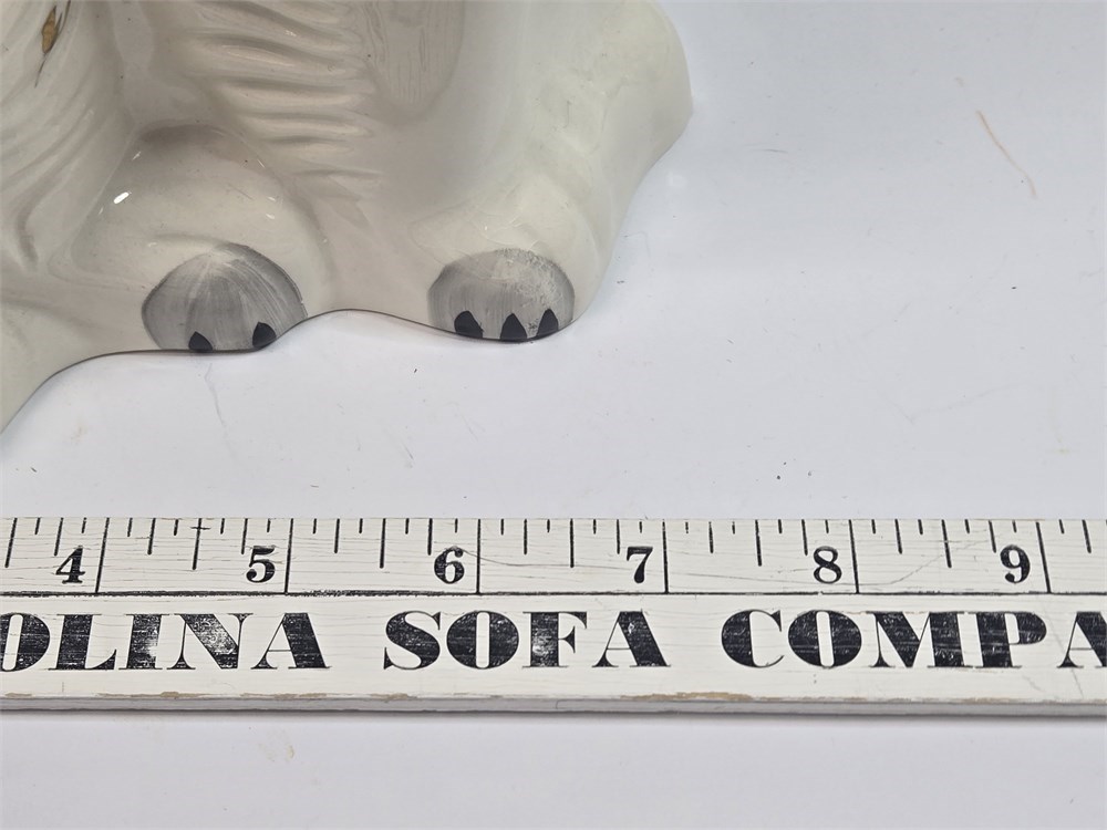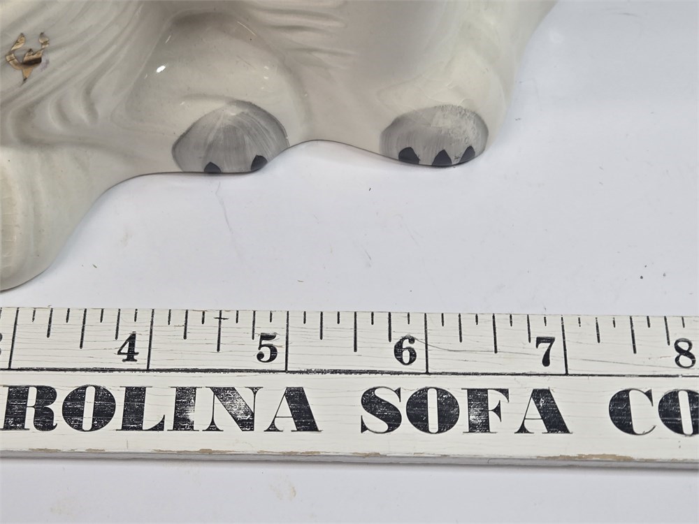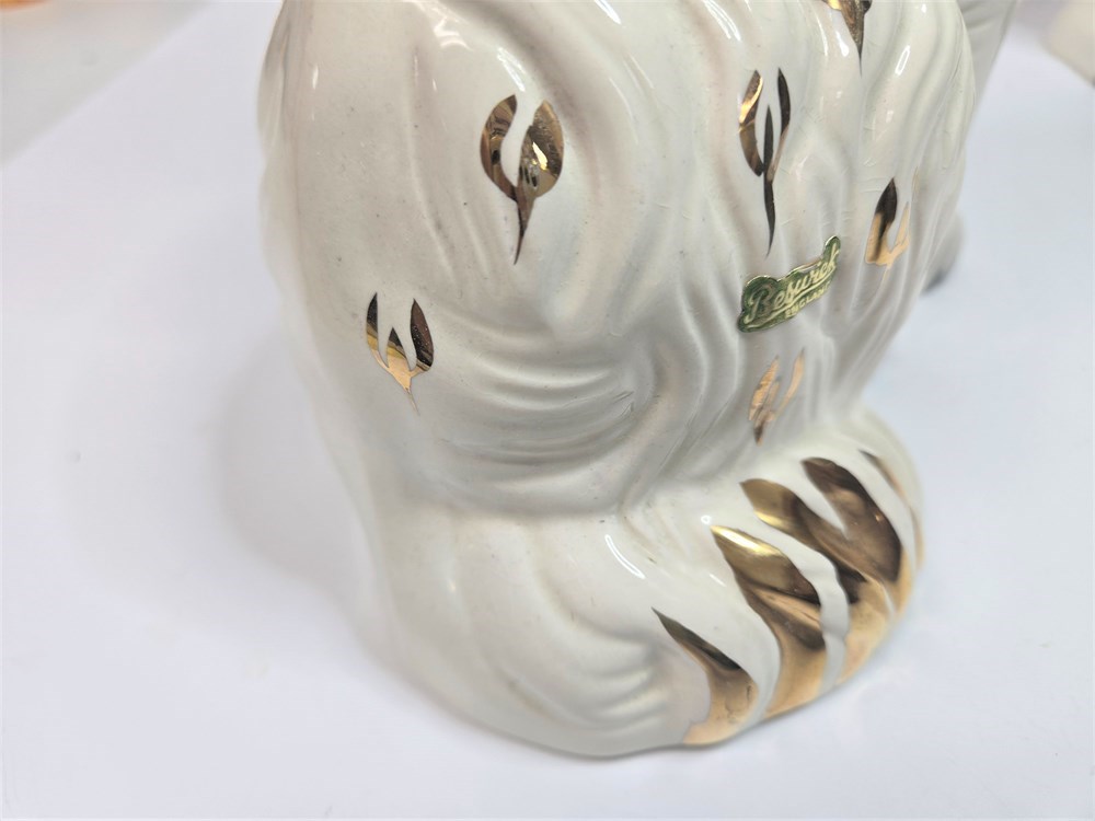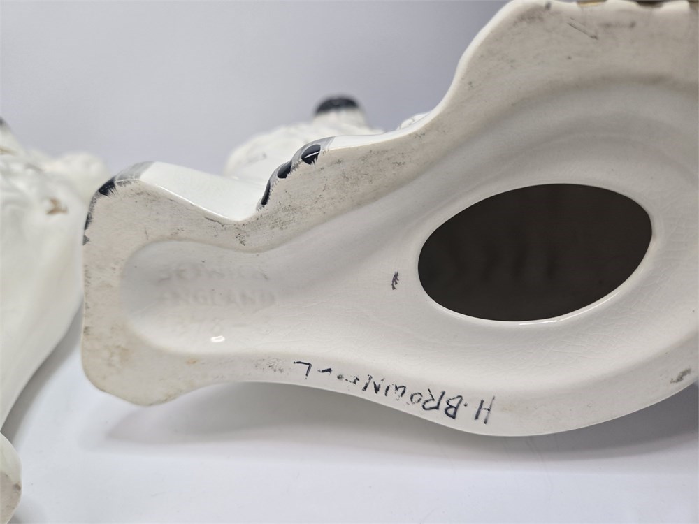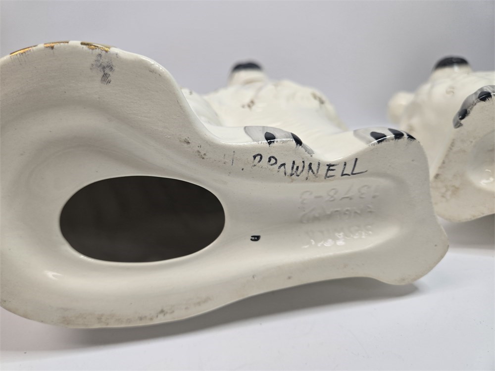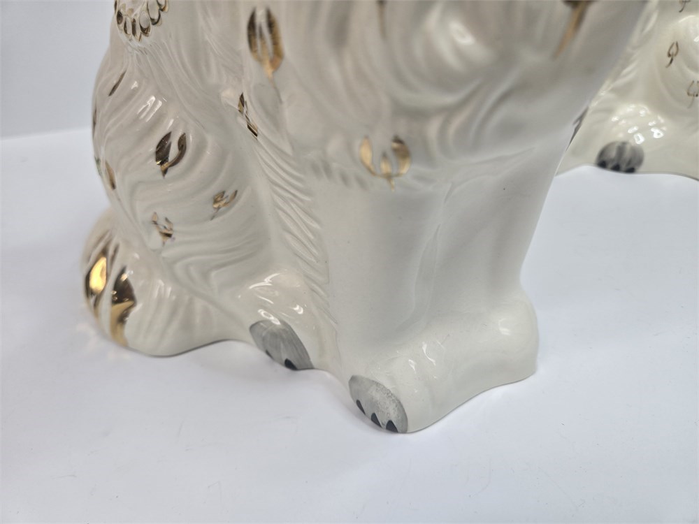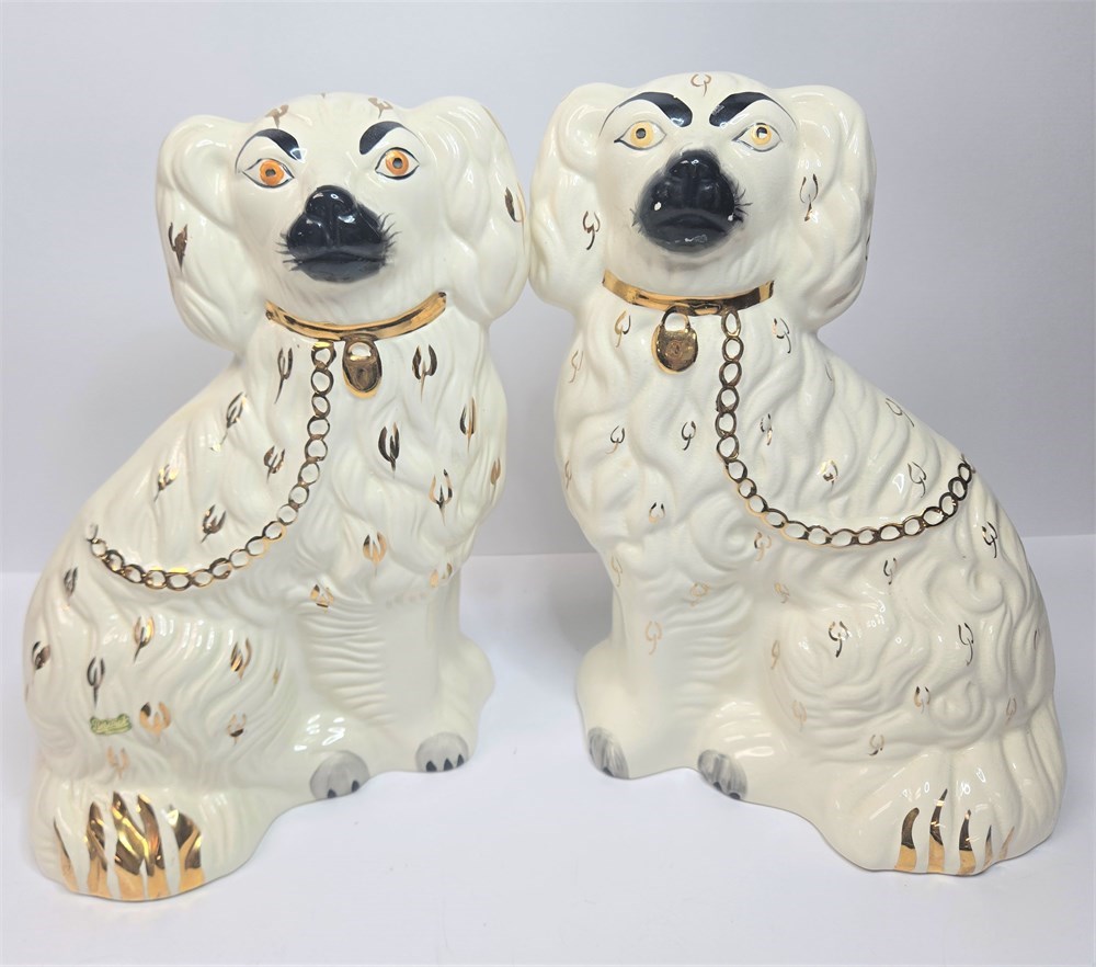 Charming matched pair of vintage ceramic Spaniel mantel dogs each standing approx. 10" tall.  Both figures feature glossy white glaze, hand-painted gilt locket and chain, black muzzle and eyebrows and classic Victorian-style detailing.  Bases are embossed Germany / England 1378-3 confirming mid-20th century production inspired by earlier Staffordshire originals.  No cracks or repairs noted.  Only a couple of paint flakes found on the nose of one.