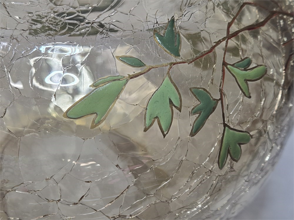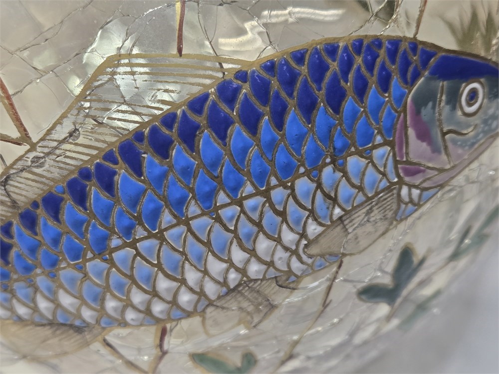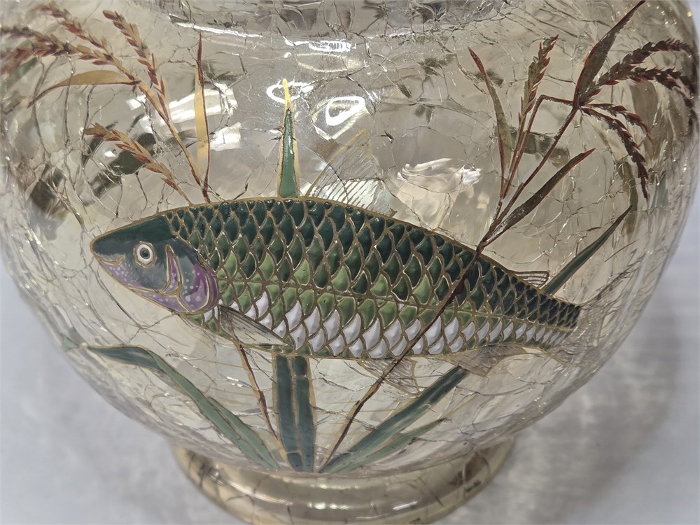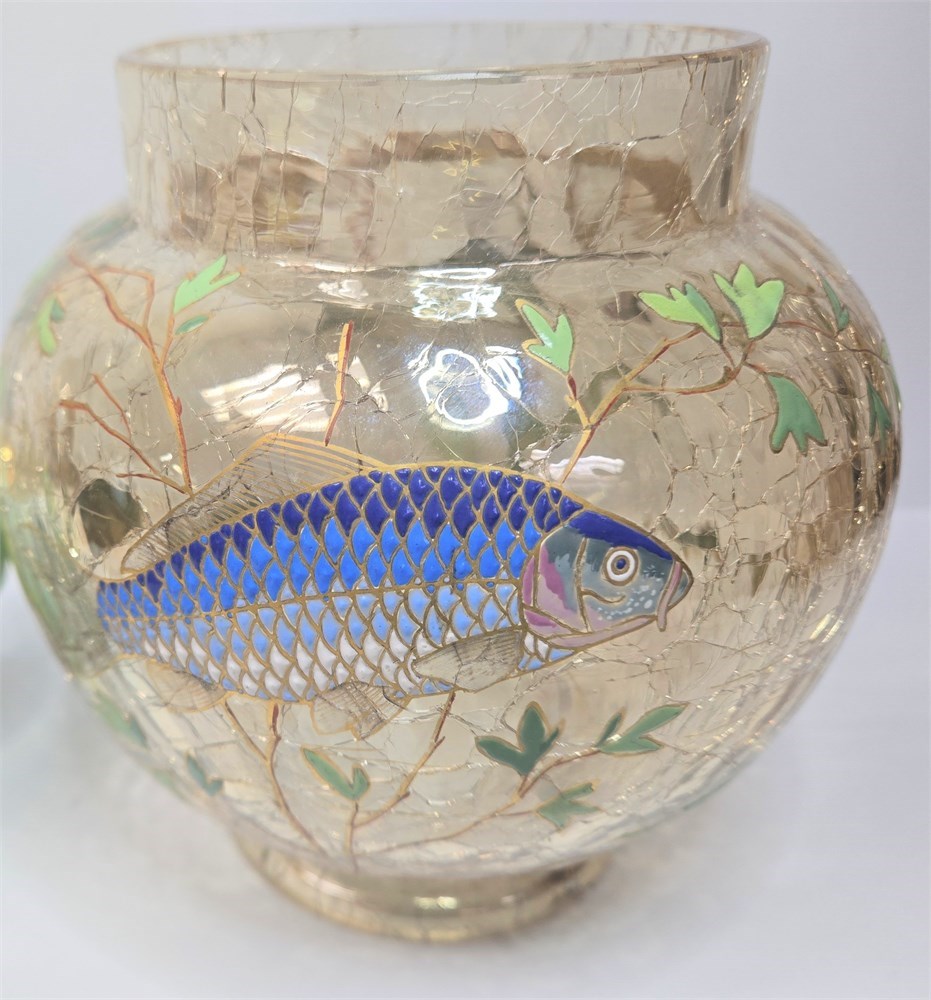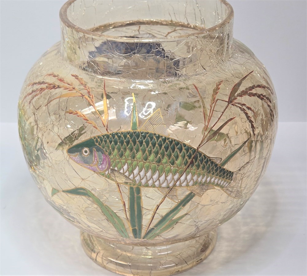 Mid 20th century Asian decorative vase likely Japanese or Chinese export.  Made with a crackle glass or crackle glaze porcelain which gives it a distinctive aged look.  It also has hand-painted enamel decorations of a green fish with gold detailing and reeds and aquatic plants. Lovely piece !