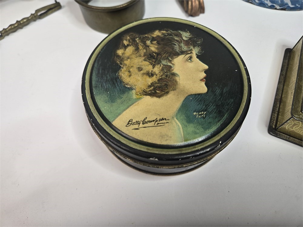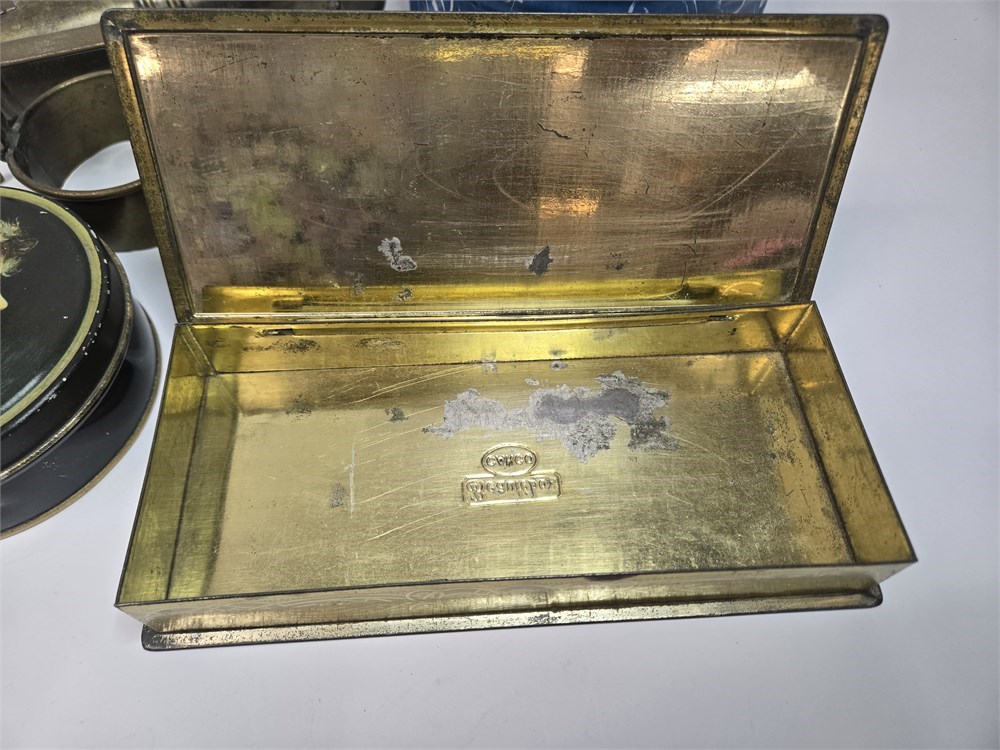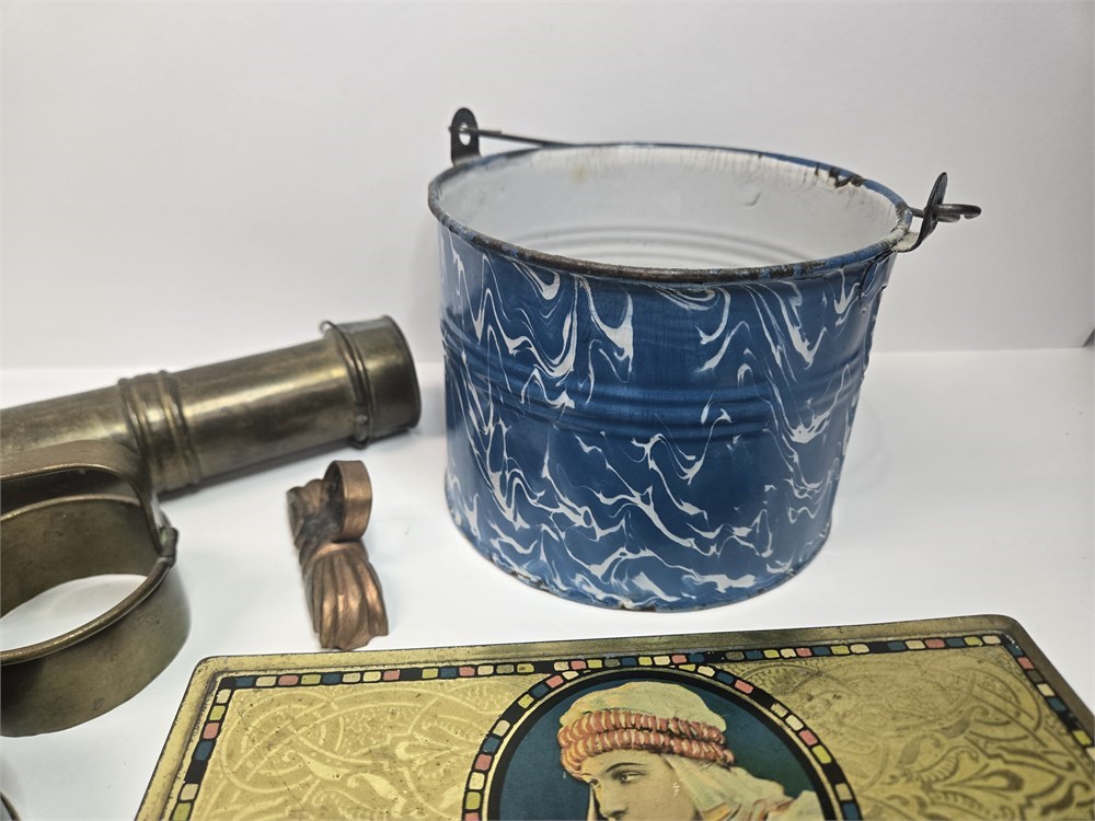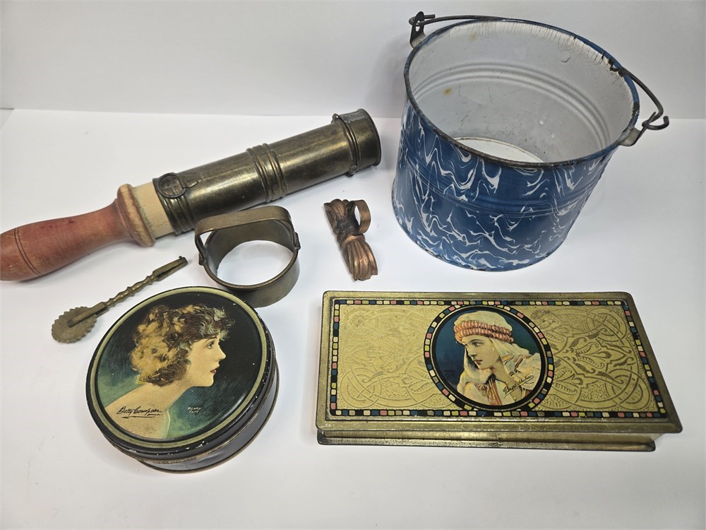 The lot consist of a great old tin pan, a very unique cookie mold, some wonderful tin boxes and other misc. pieces.  Great lot..