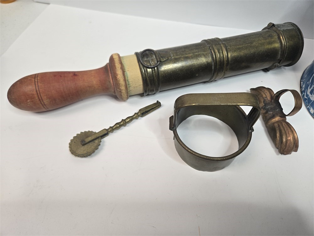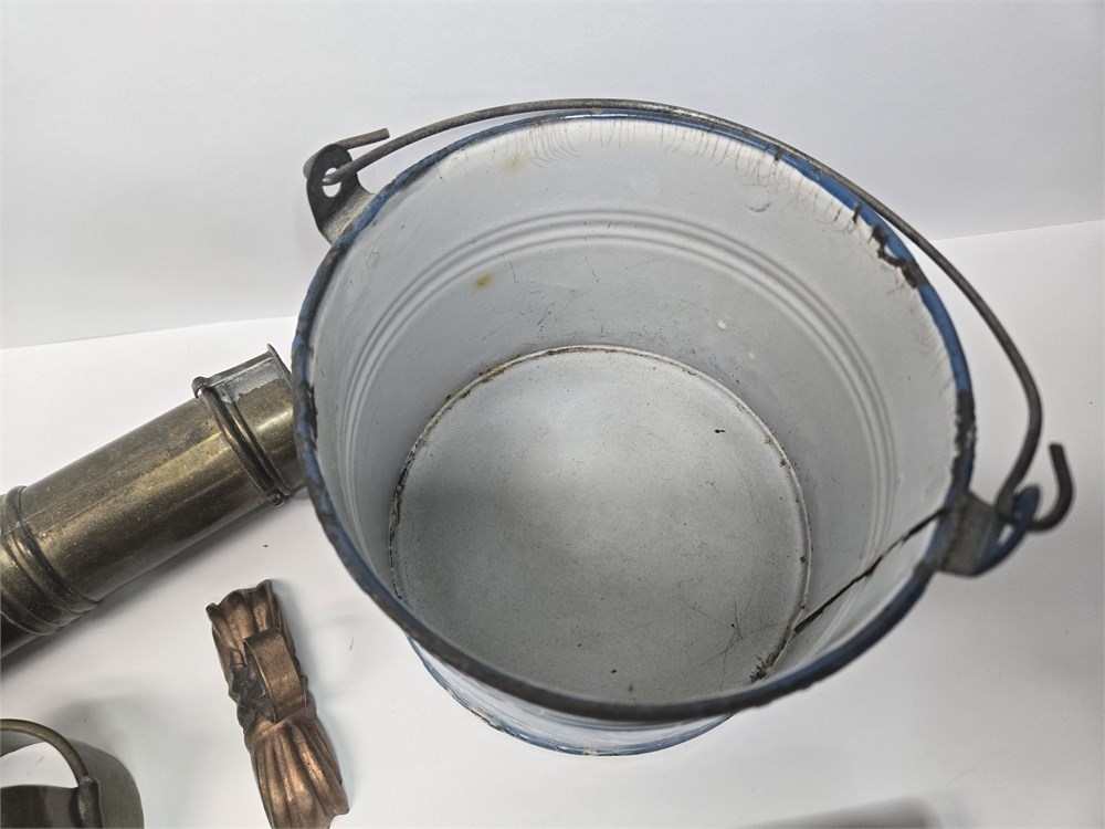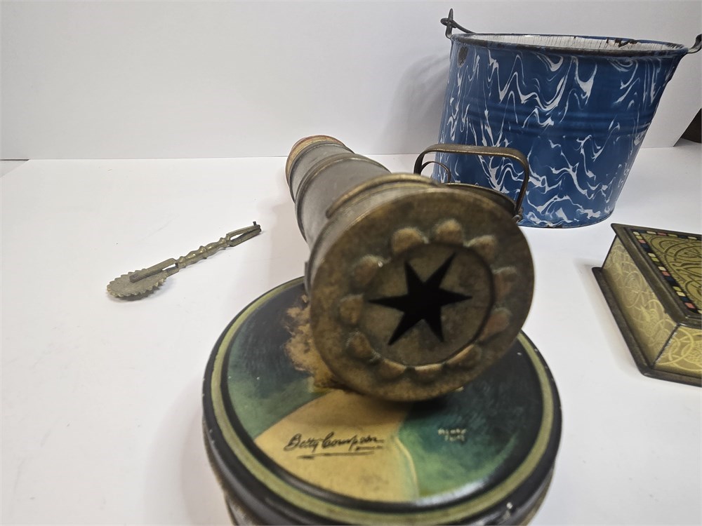 Box lot of antique tin ware, cookie press, and other misc kitchen items