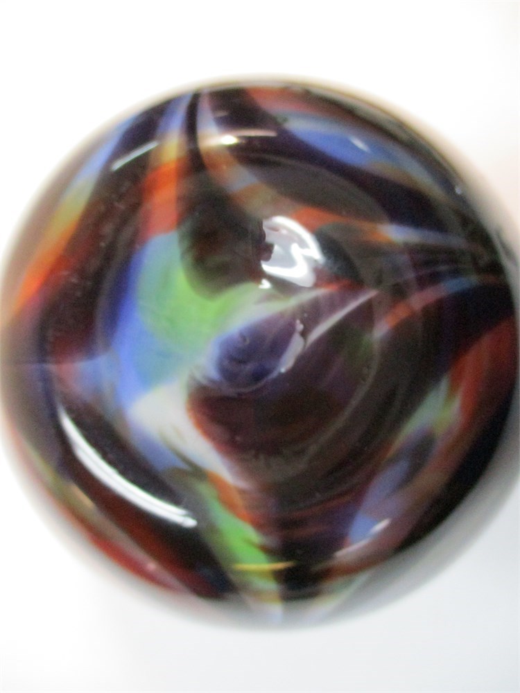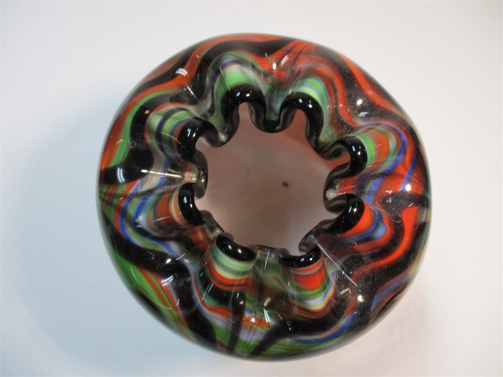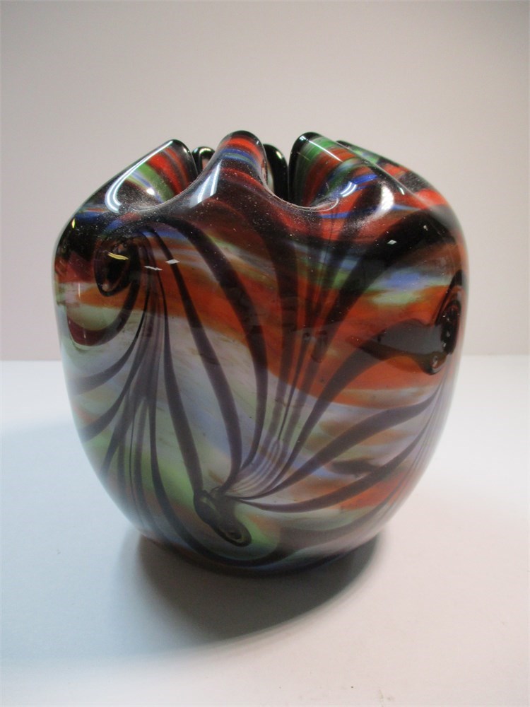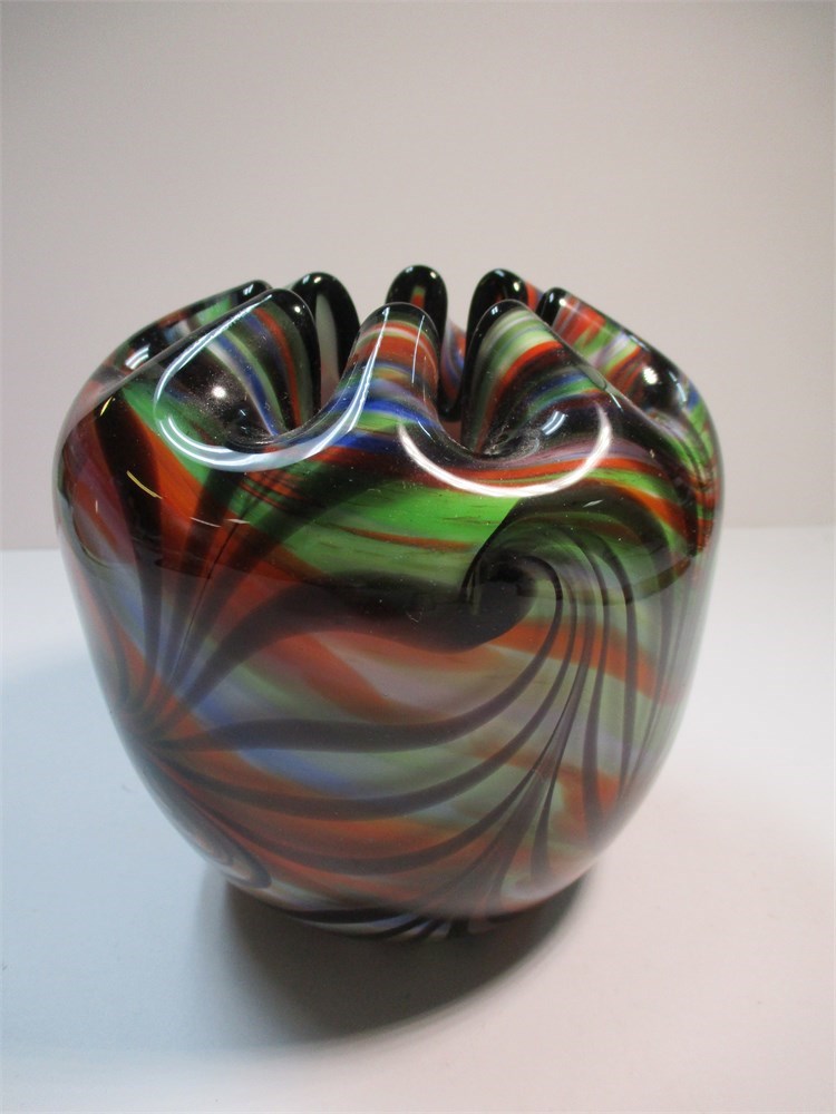 This this a lovely hand-blown art glass vase in a Murano style, featuring a ruffled top and swirling patterns of multiple colors including brown, greens, oranges and blues.  It measures 5" tall x 4.5" wide.  Lovely piece and signed.