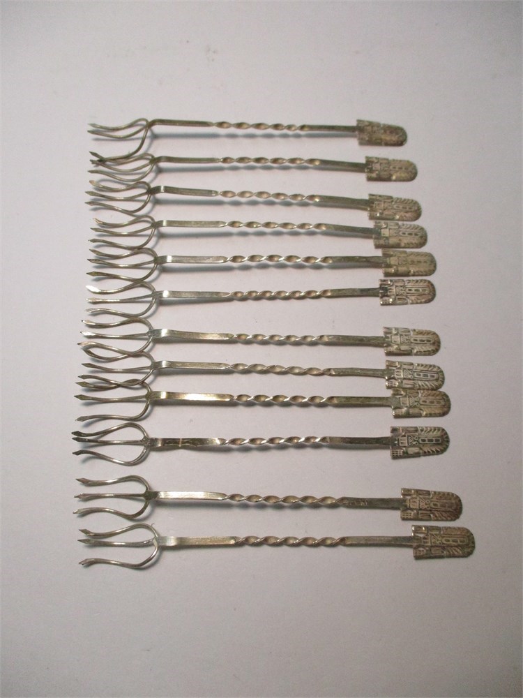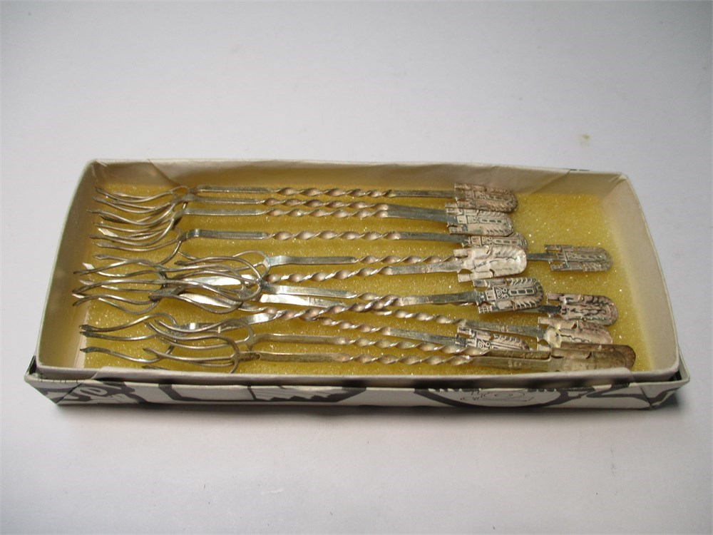 An adorable set of 12 Sterling Silver Hor d'oeuvre Forks in the original box!  Each fork measures 3.25" long.