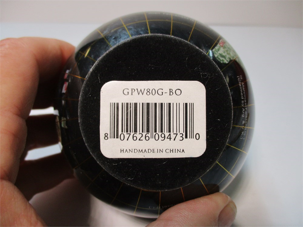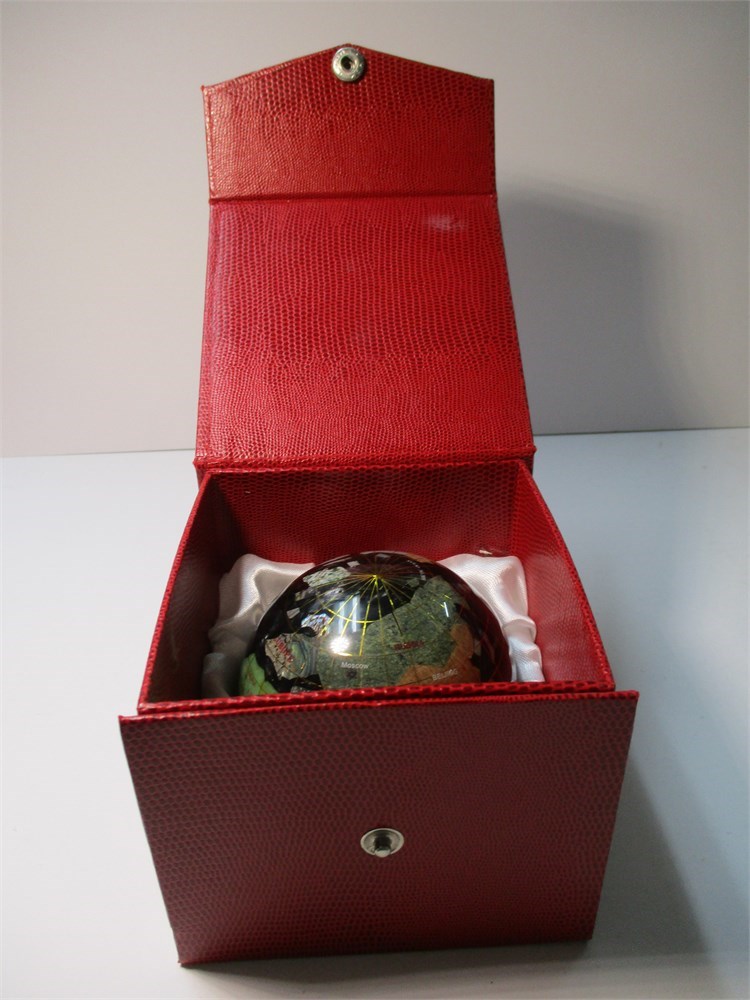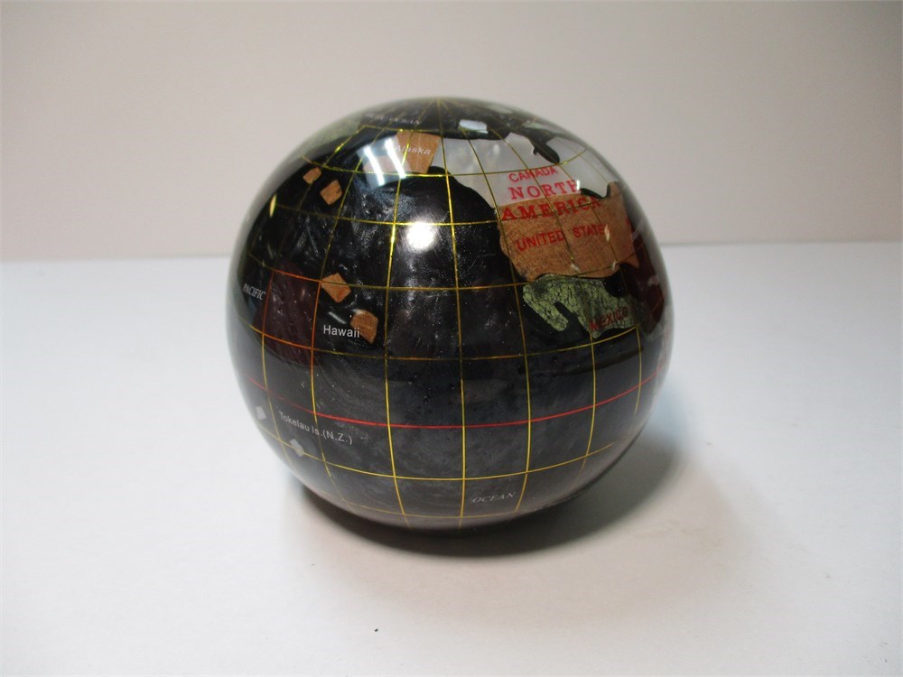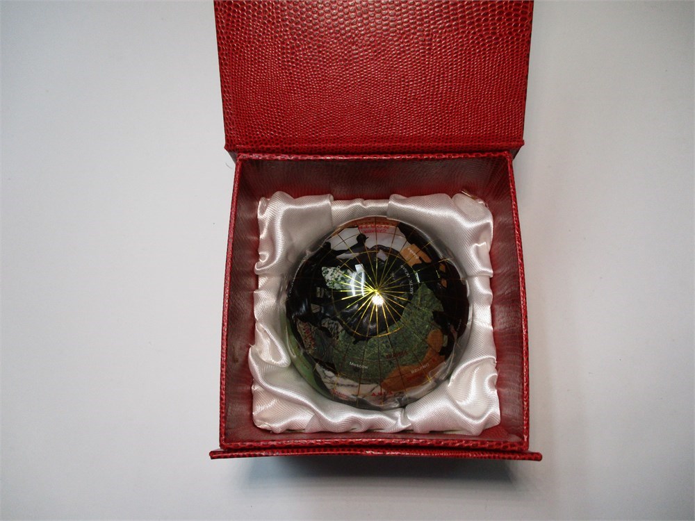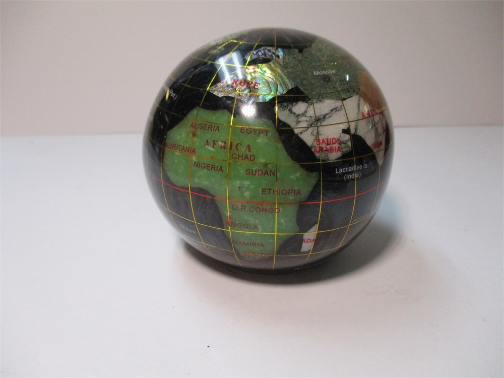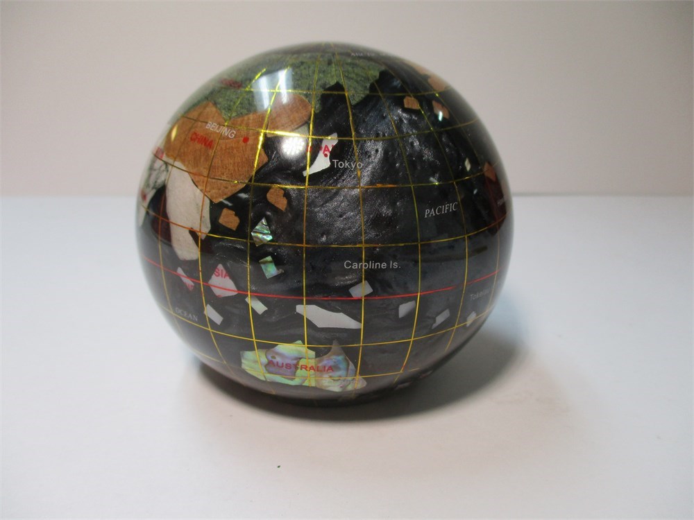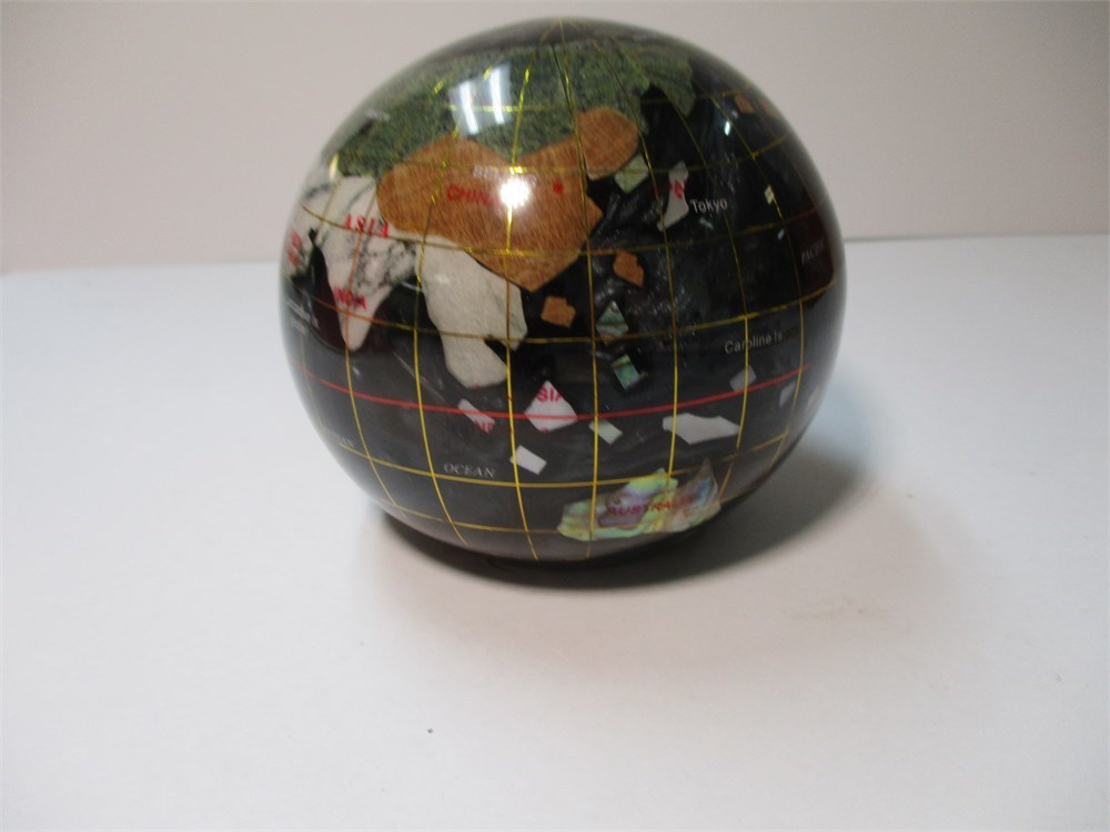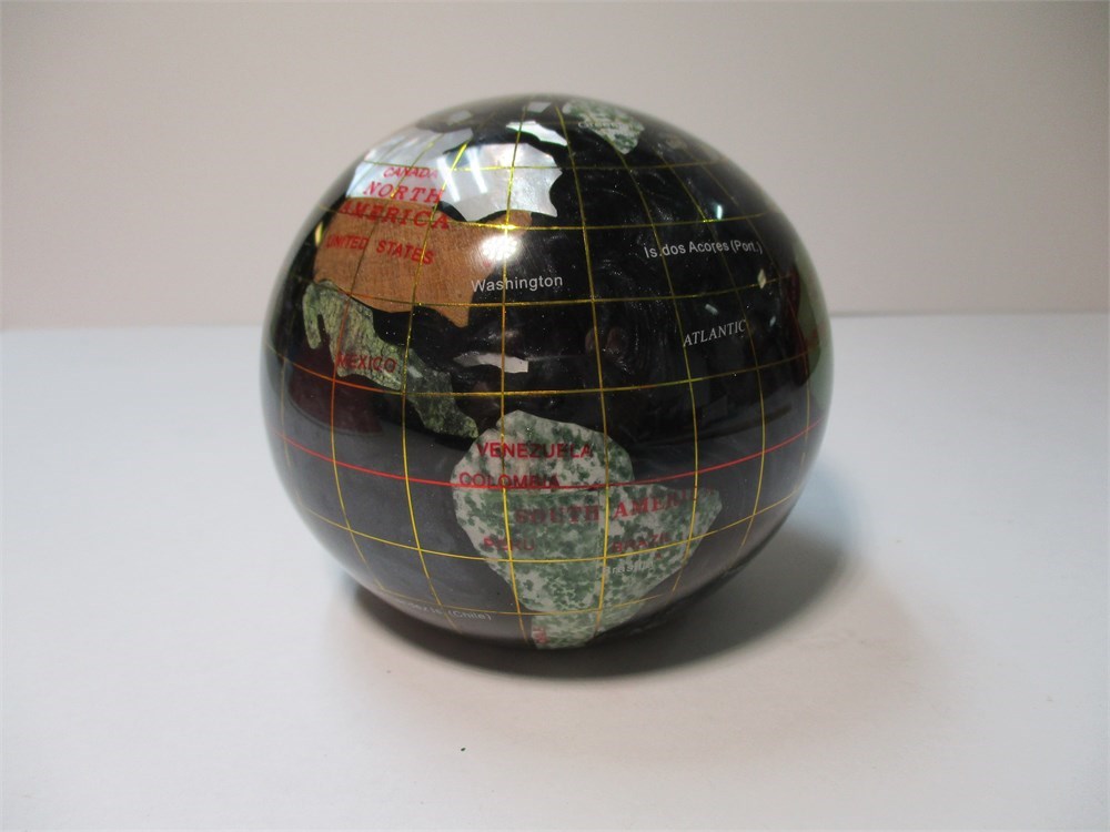 This is a like new 3" world globe paperweight that is hand-carved from jewelry-grade semi-precious gemstones with black opal opalite ocean.  Wonderful detail. Comes in the original box.