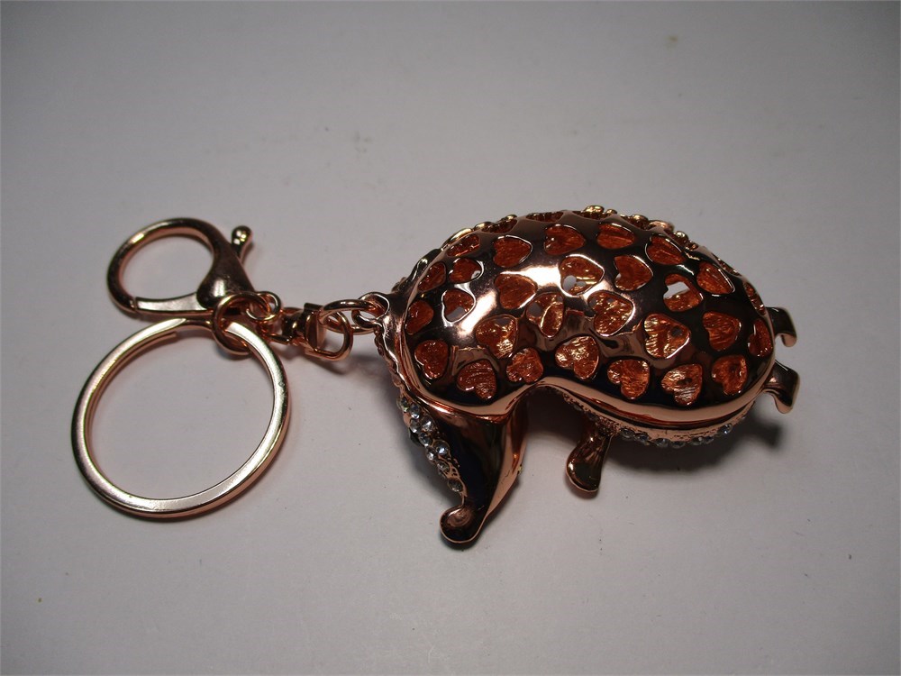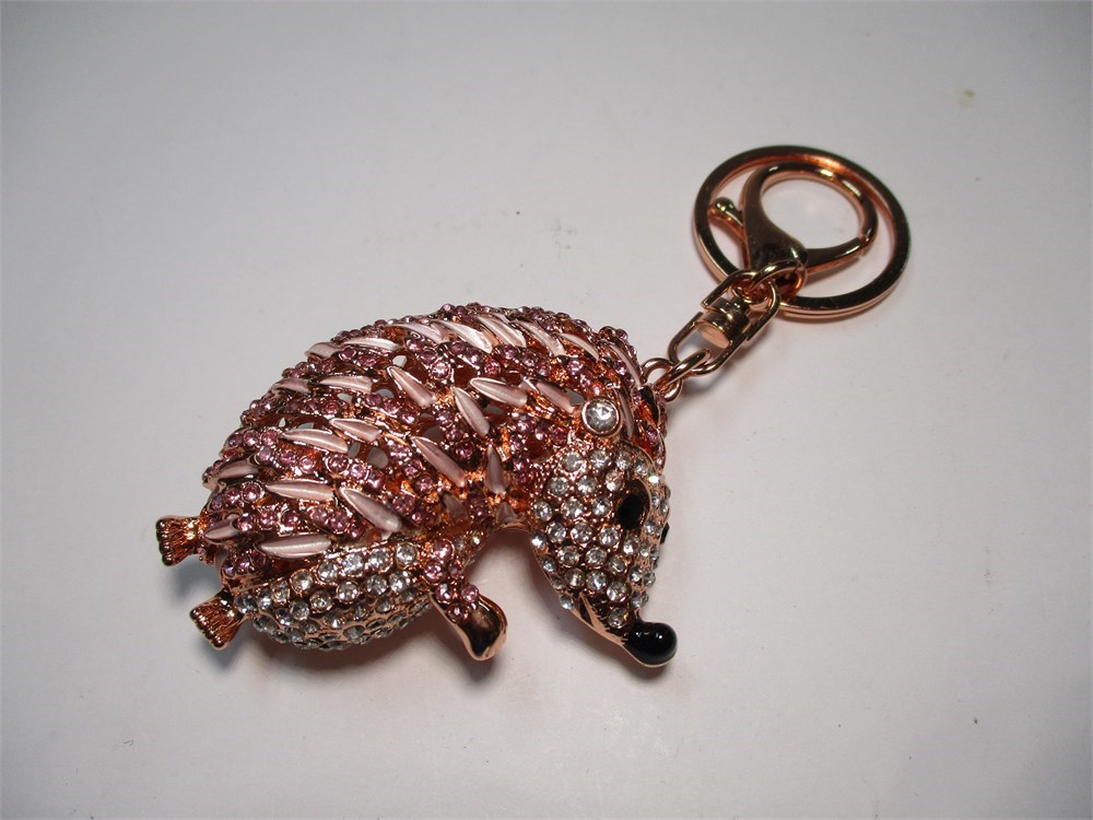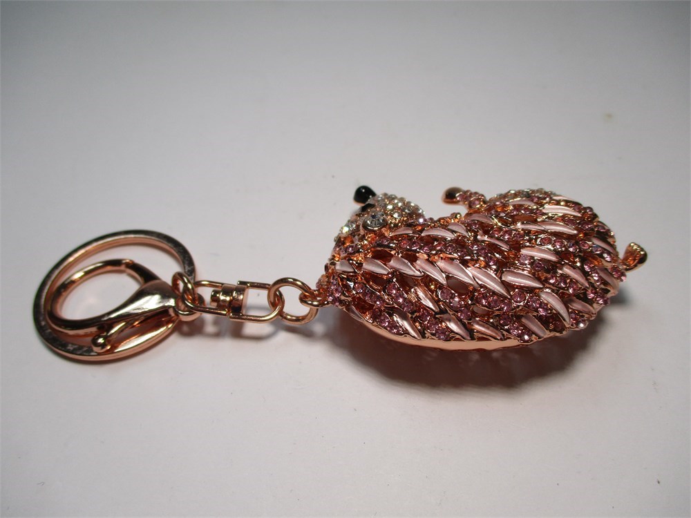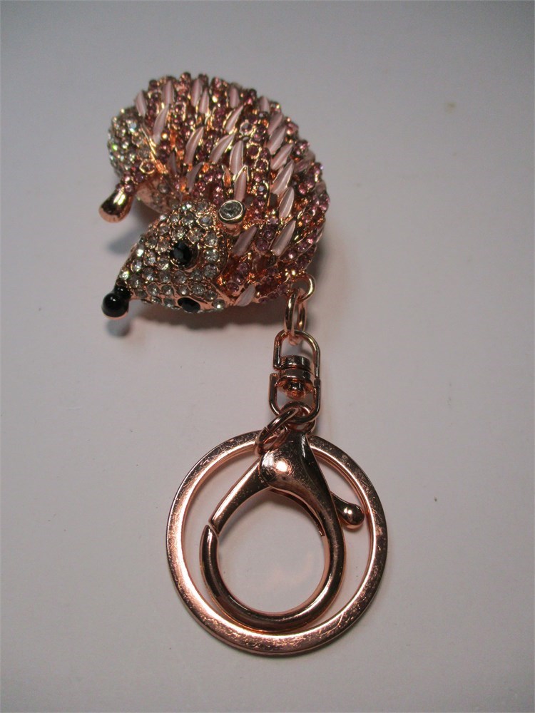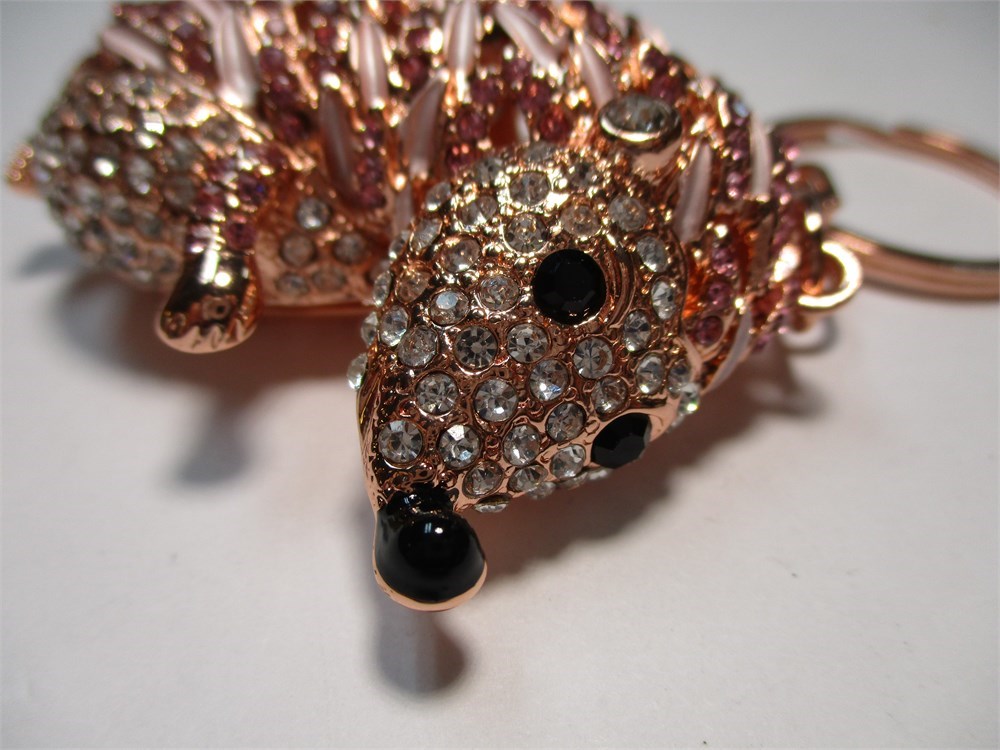 This is so cute....this very fun, rose gold-tone Hedgehog 2-ring Key Chain. It has pink, white and black rhinestones throughout the piece.  Very whimsical ! The Hedgehog measures 2.5" wide and 1" thick at its thickest part.