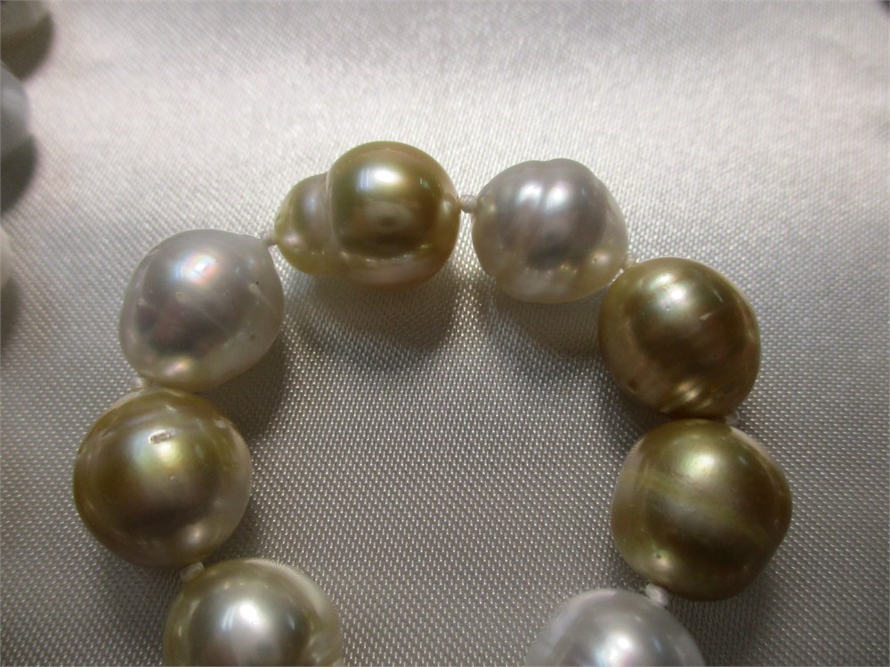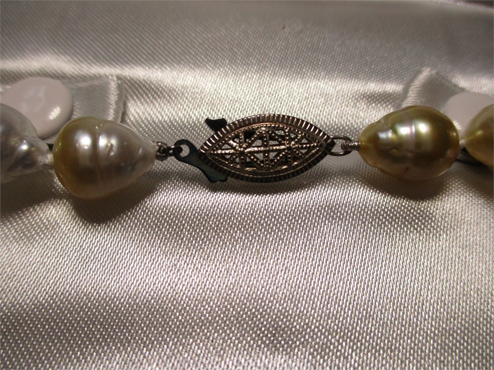 This is a gorgeous necklace !  A Beautiful Golden & White Cultured South Sea 9-12MM Pearl, Rhodium over Sterling 24 inch Necklace. It has alternating Golden and White Pearls and hand-knotted. Featuring a lovely Sterling Silver clasp.  It comes with its original presentation box and then boxed. This would make a stunning gift !  THINK CHRISTMAS !