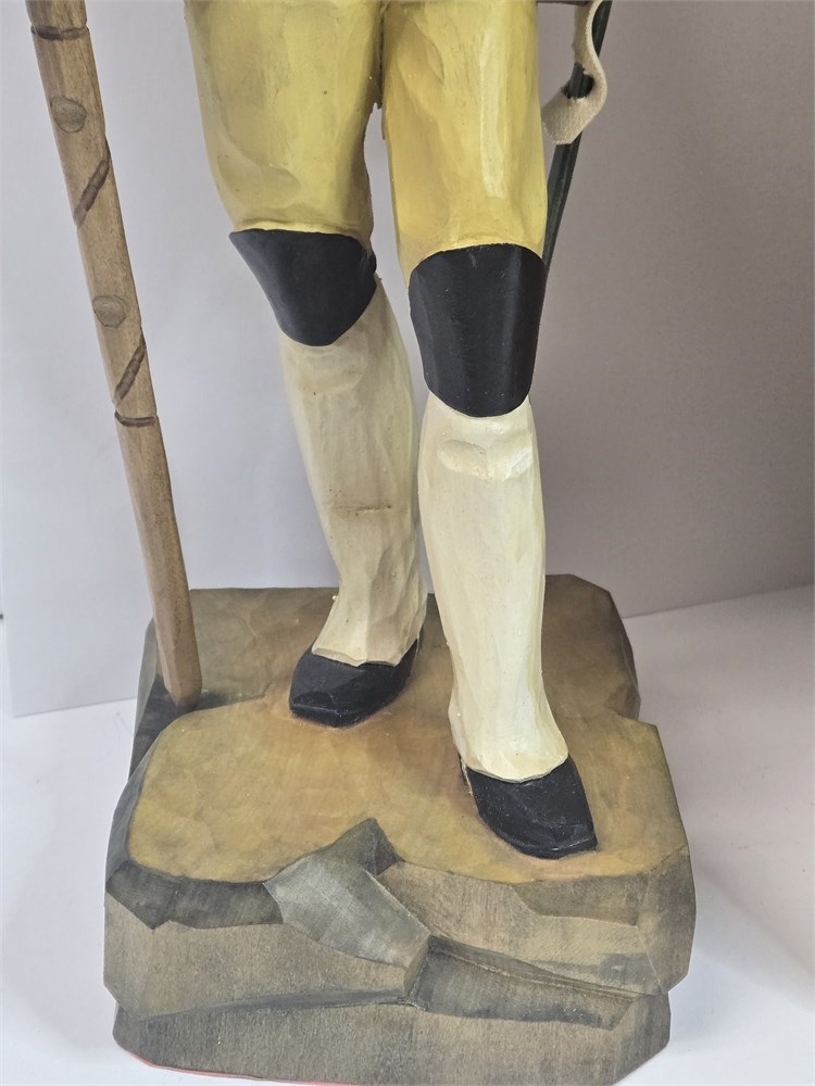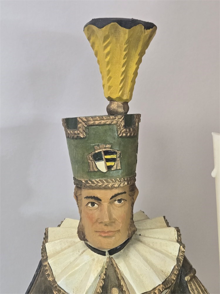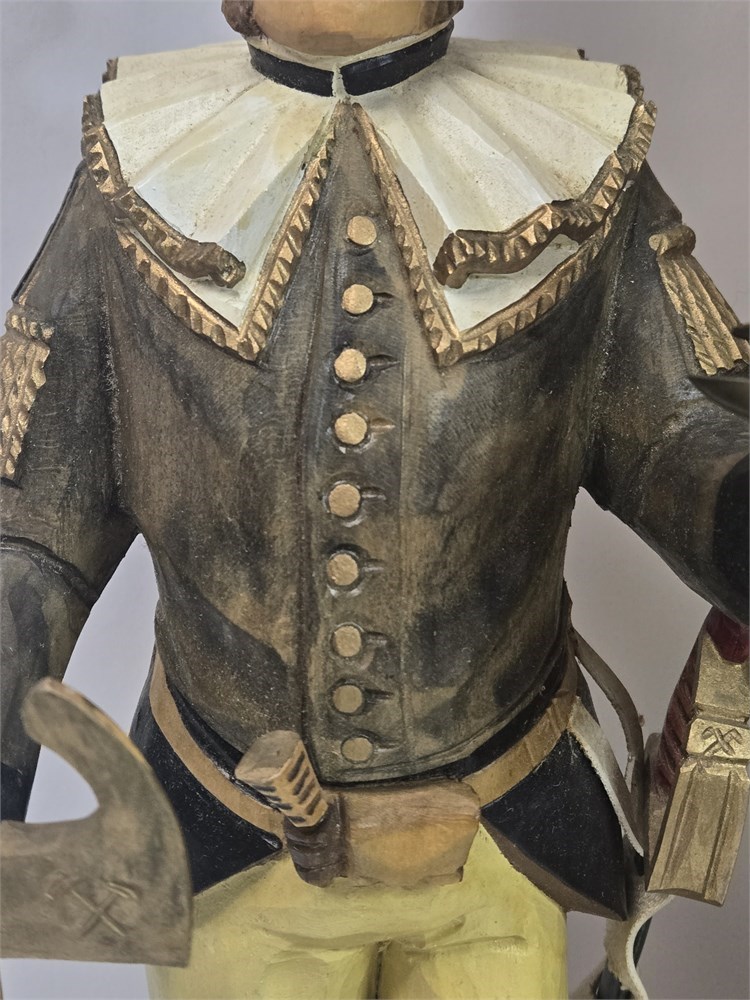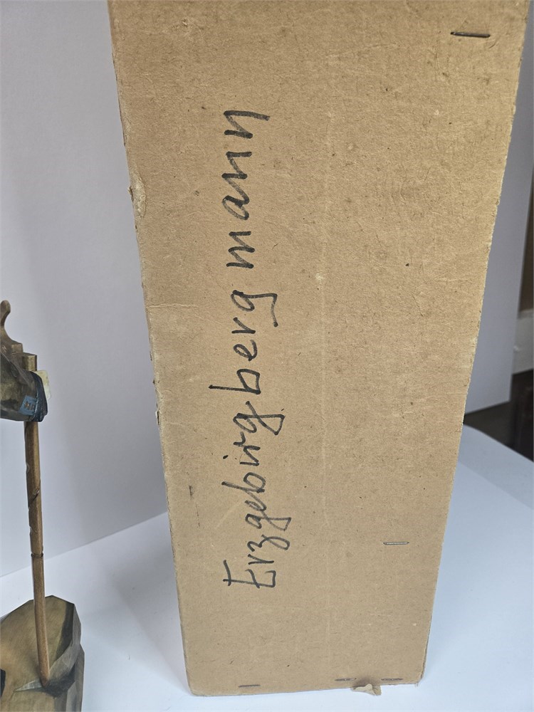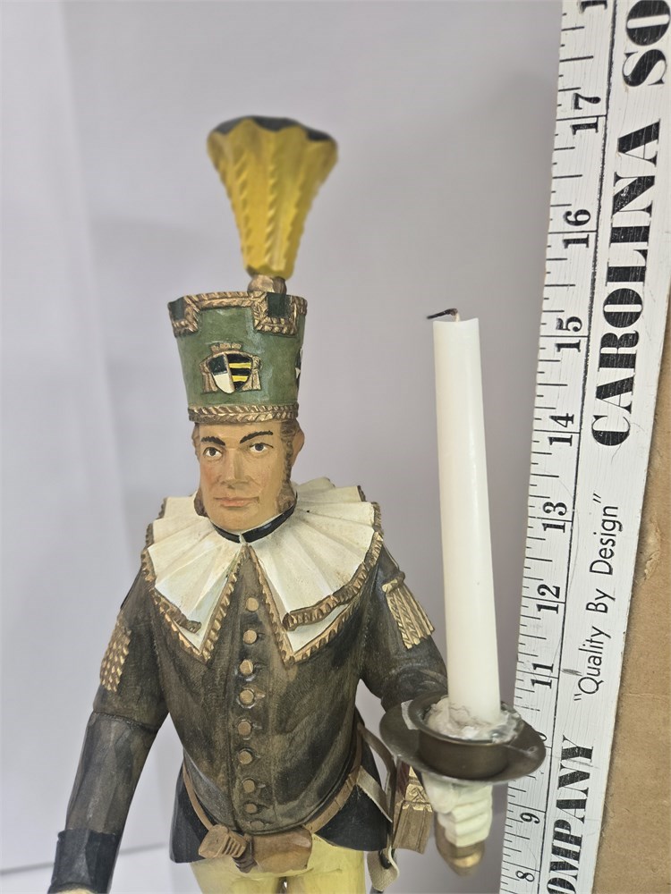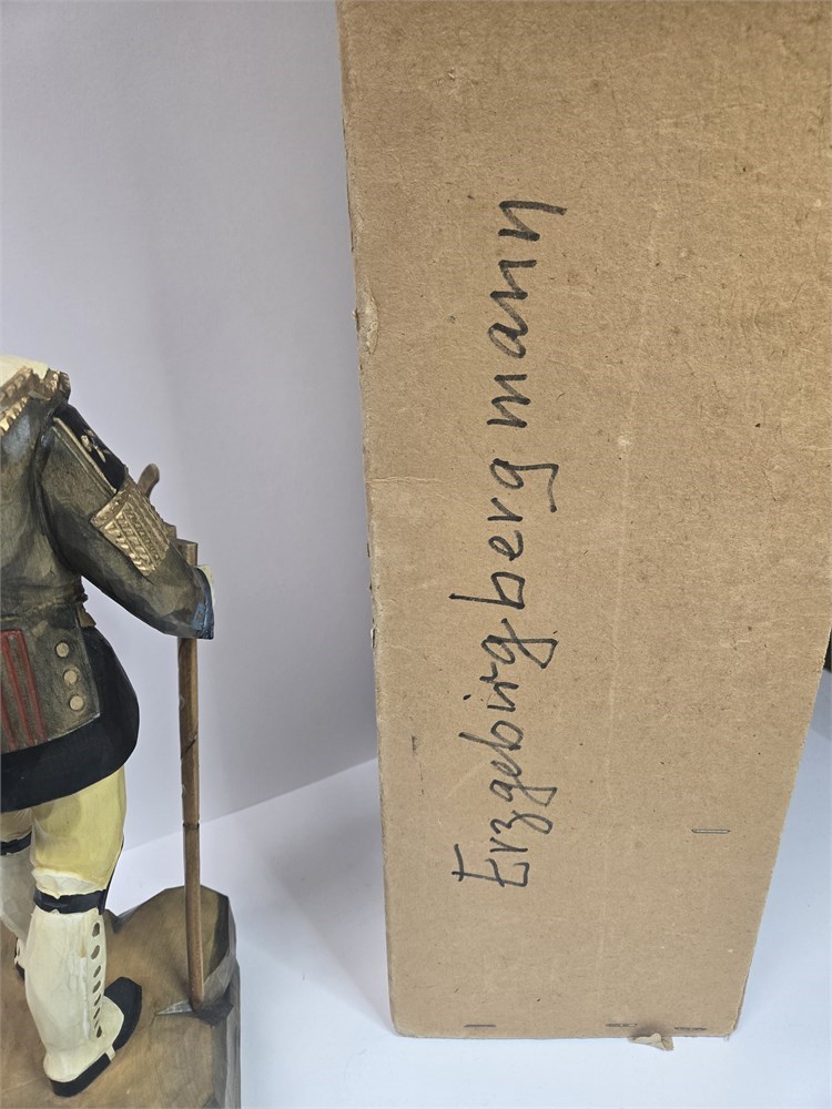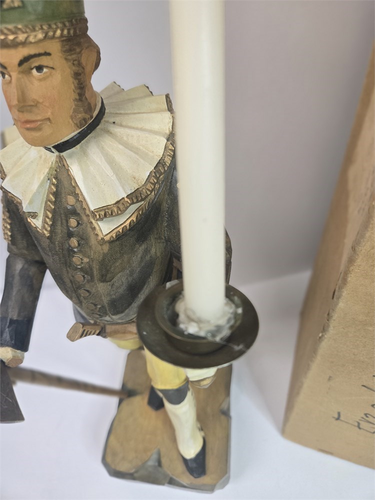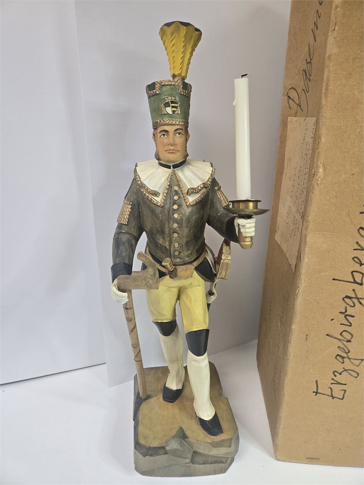 Large Bergmann Miner Carved Wood Candle Holder.  Has the original box but that's in poor condition. Has all necessary pieces. The candle holder might need to use a spot of glue.