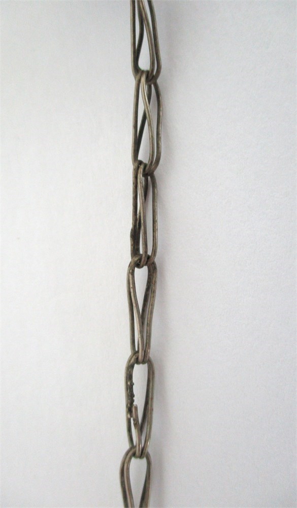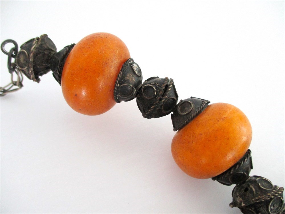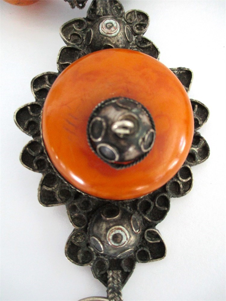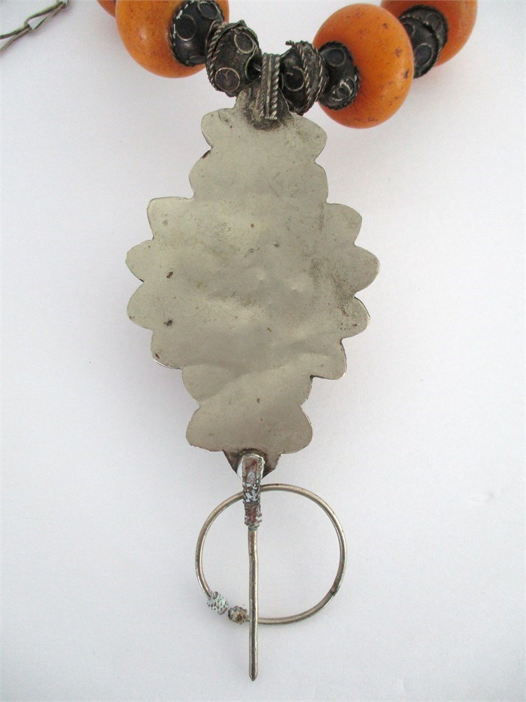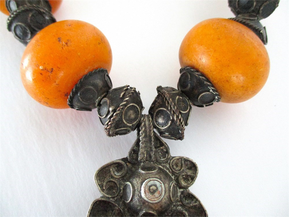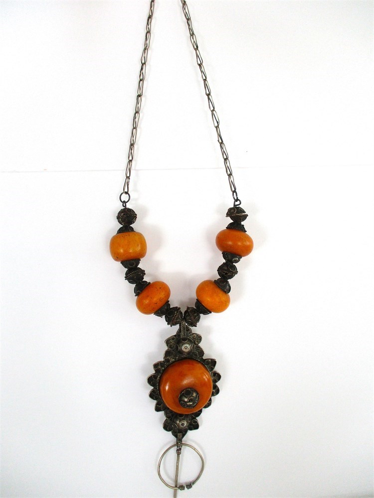 This wonderfully large vintage Hand-made Tribal Necklace features a very large Amber Cabochon Bakelite Bead in the center.  The other beads are faux amber.  The intricate metal work is a low grade silver decorated with stylized tribal granulation or filigree.  The lower ring element which resembles a key-ring style hanger seen in these amulets were used to hold charms or tools. It features a paper clip style chain.  This piece measures 18" in length.  This is a very unique and unusual piece.