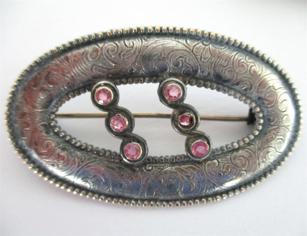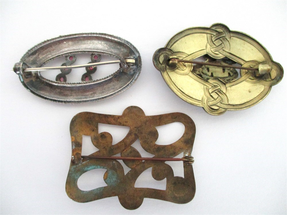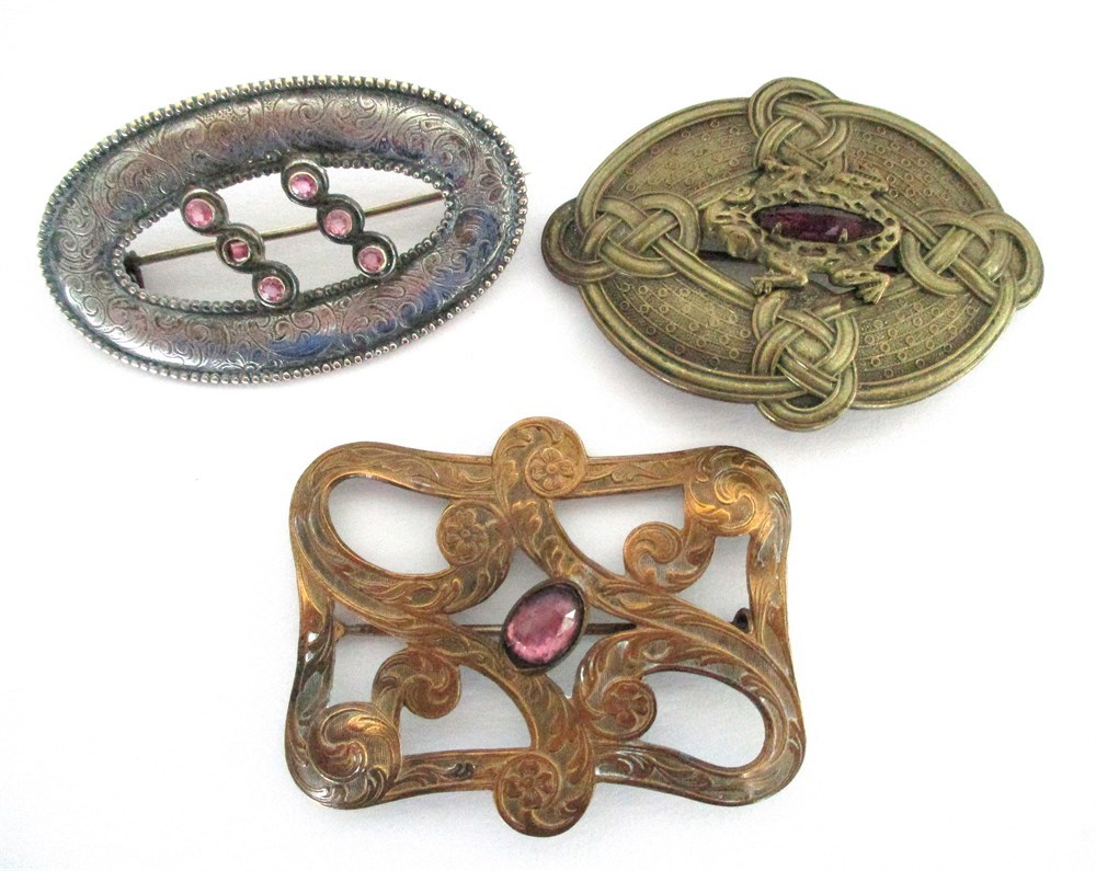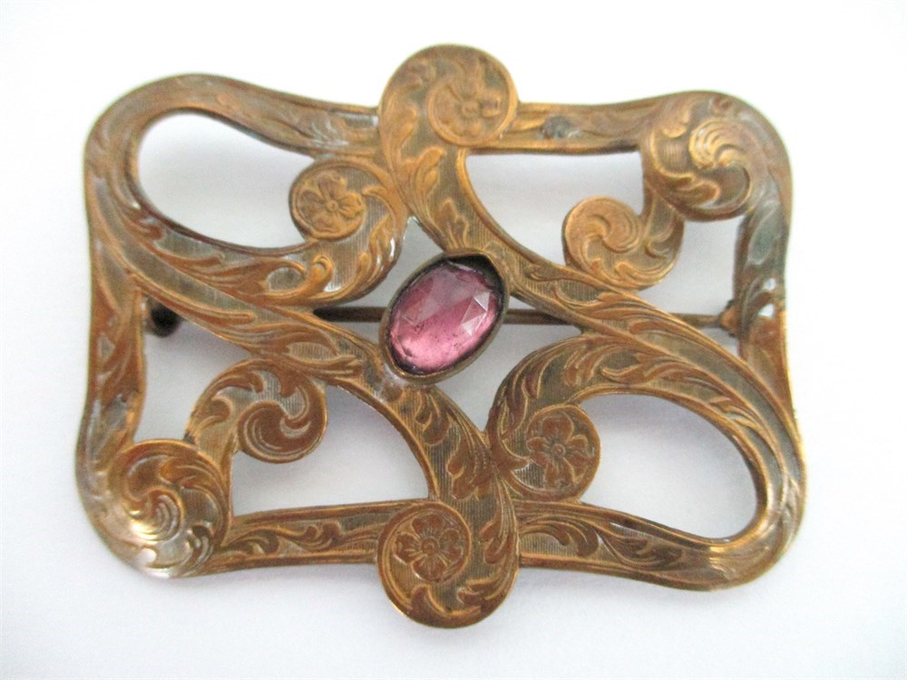 This Lot consists of 3 Victorian Brooch's.  The Bottom Brooch is an open work, Art Nouveau inspired Brass Brooch with flowing scrolls and floral motifs with an oval faceted purple stone.  It also features a "C" clasp, early 1900's.  It is in very nice antique condition with some mild verdigris on the back.  The Oval Silver-tone Brooch has engraved scrollwork around the border and center oval.  It has 6 round bezel set faceted pink glass stones on the diagonal in the center.  It has a "C" clasp closure, late Victorian piece.  The Brass Oval Celtic Knotwork Brooch has a three-dimensional frog figure in the center along with a oval faceted purple stone for the body.  It has a "C" clasp closure, late Victorian piece.