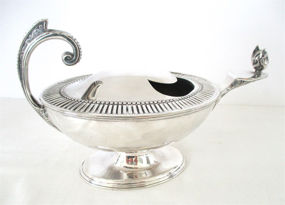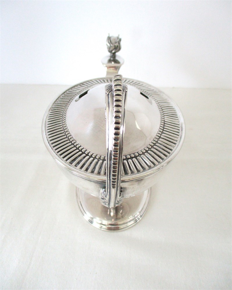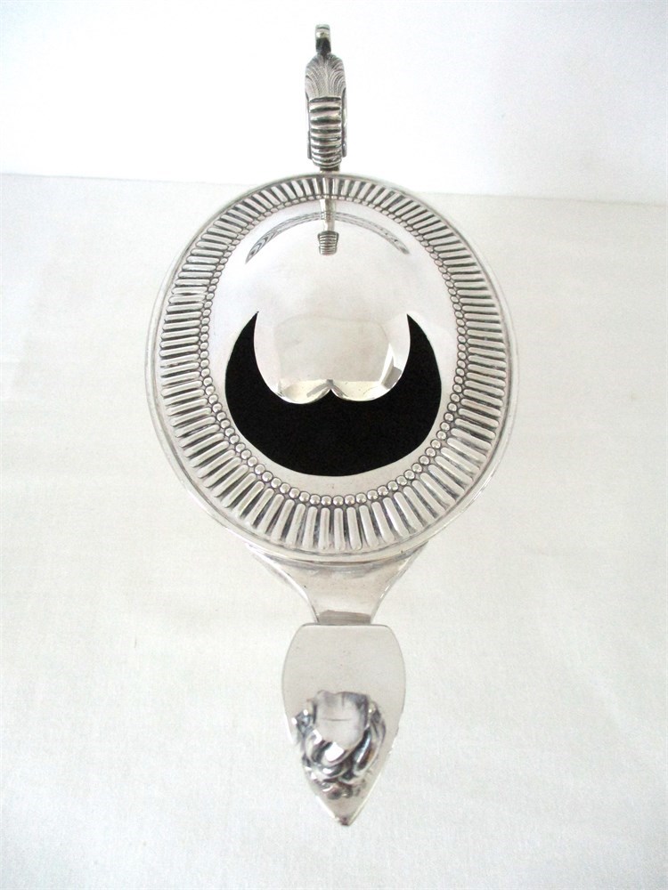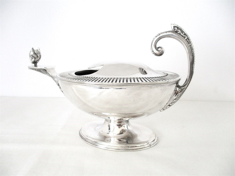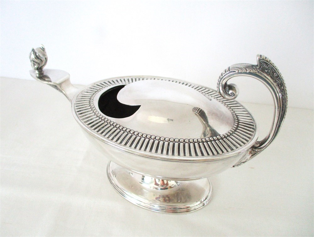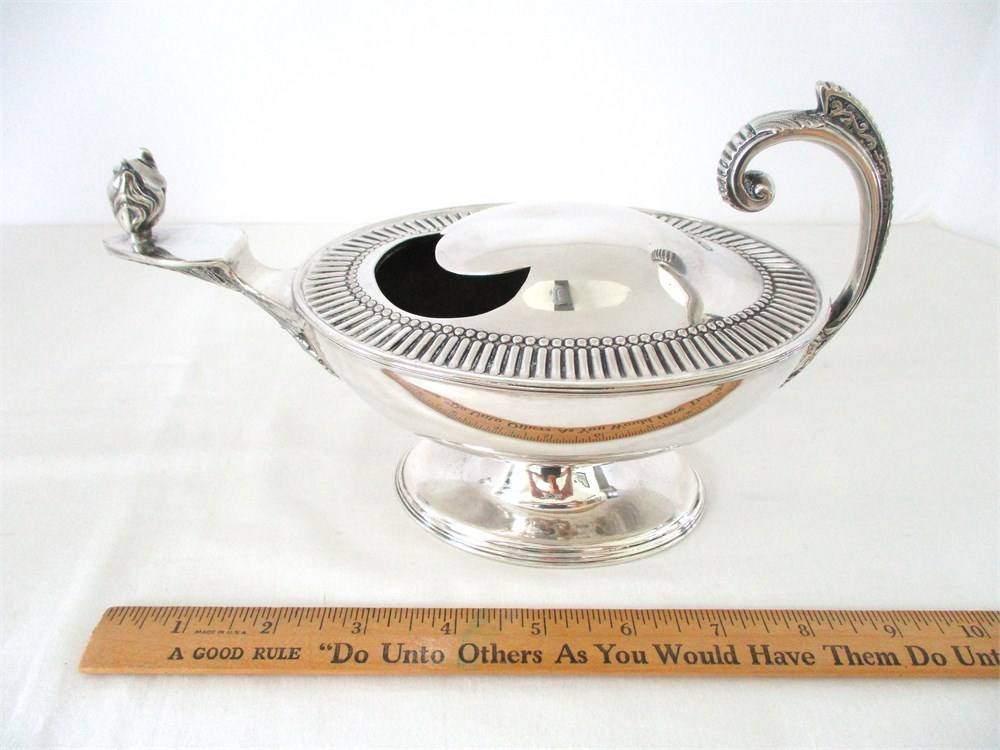 This is a Rare, English, Victorian, late 19th C, Silverplate Spoon Warmer. This Victorian-Era invention used to keep serving spoons warm at the table especially when kitchens were far from the dining area.  The Servers would pour hot water in the opening an place the spoon inside.  This piece reminds me of a Genie Lamp.  It is in amazing antique condition with wonderful detail.  These pieces are not easy to find especially in this condition and are highly collectible. The hallmark on the bottom reveals its history, crafted by Silversmiths Robert & Belk, Sheffield, England, 1864.  It has been tenderly loved for over 161 years.  It weighs over 1.4 pounds and measures 9" long, 3.5" tall x 4.5" wide.  It is in wonderful antique condition with only normal age related wear.  This is a winner!  There is a reserve price of $125.00 on this piece.