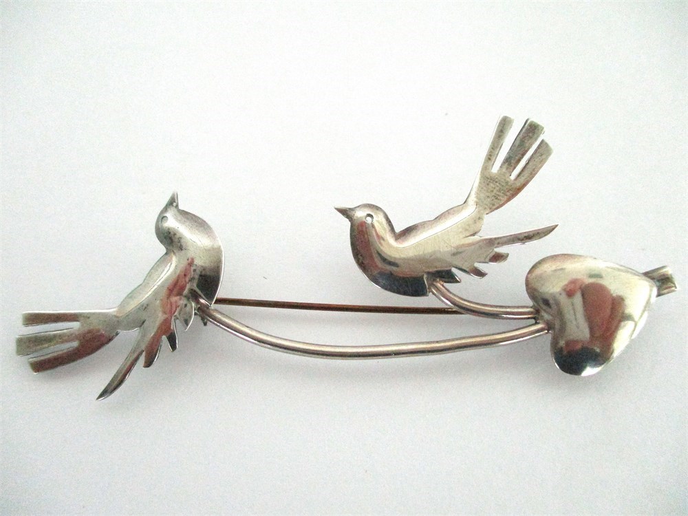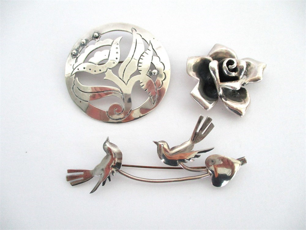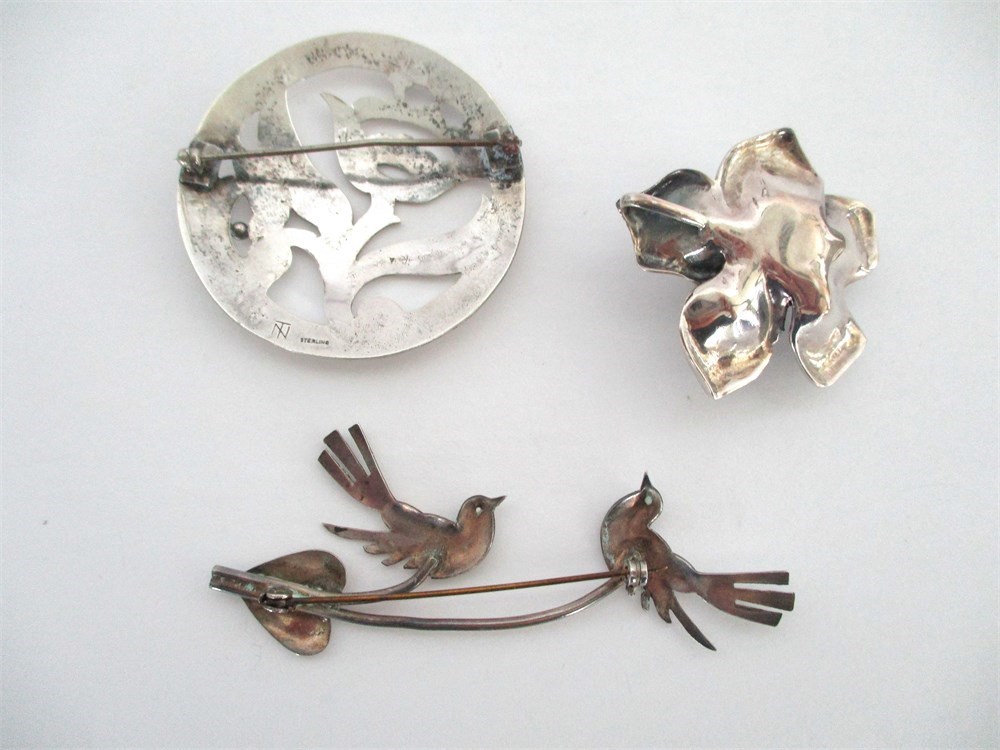 This is a wonderful collection of vintage Sterling Silver Brooches.  One is an adorable two Birds on a wire, a round Floral and a large Rose pendant.  All are in wonderful vintage condition.  All pieces are marked Sterling except the Birds, but has been tested.  The Birds measure 3" in length, the round Floral measures 2" in diameter and the Rose measures 1 5/8" x .75" tall.  A Total gram weight of 42.