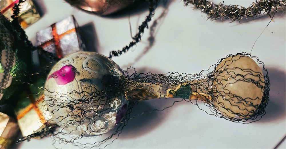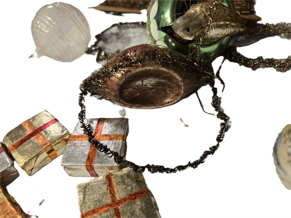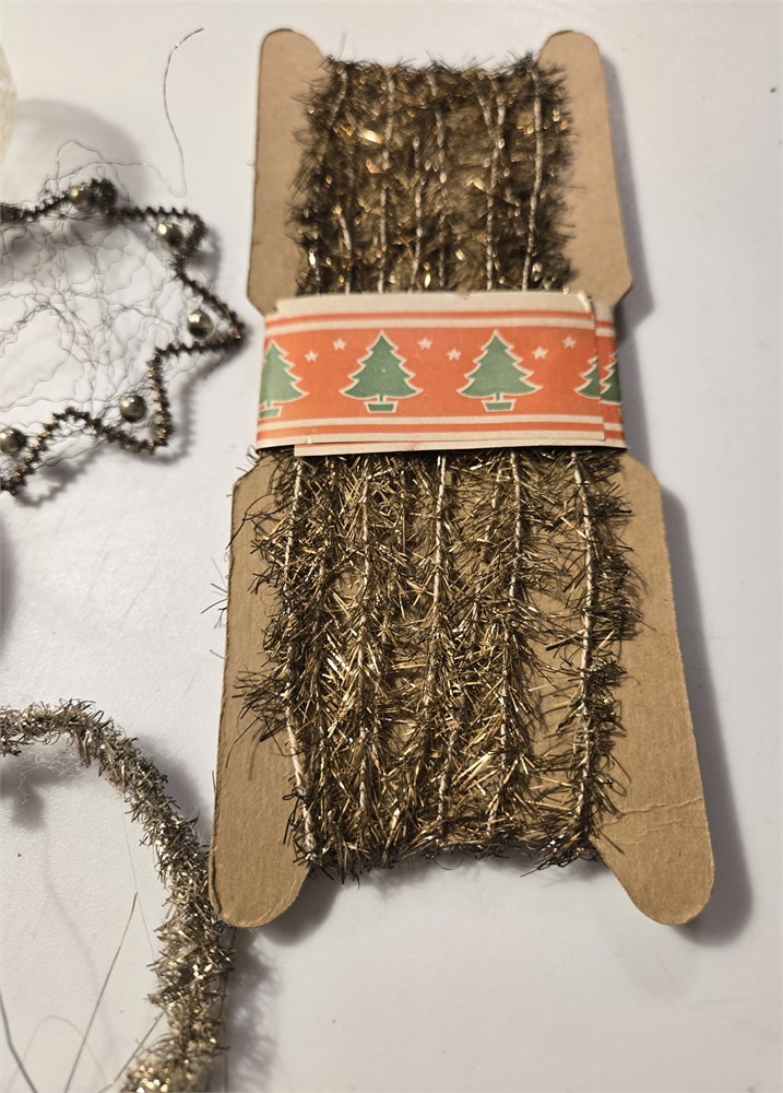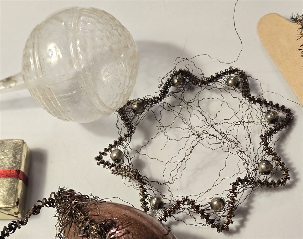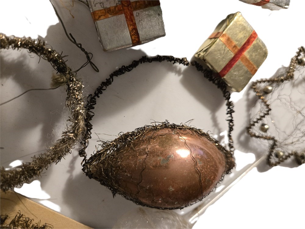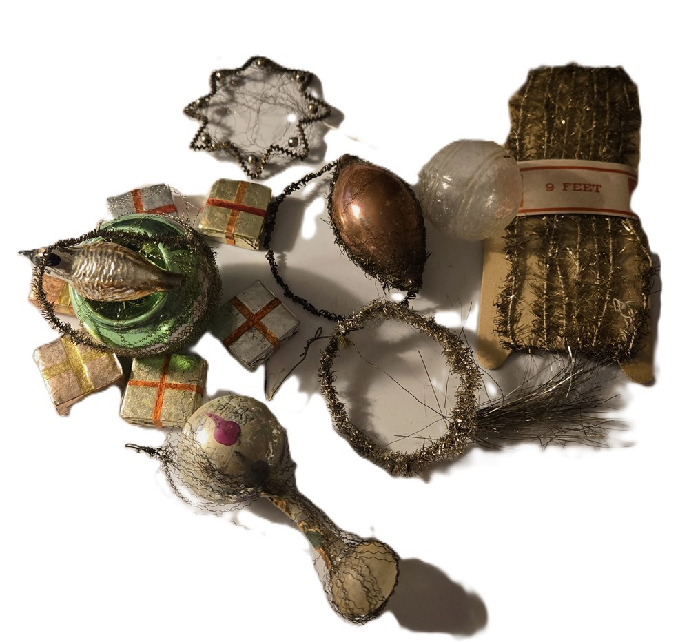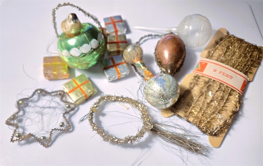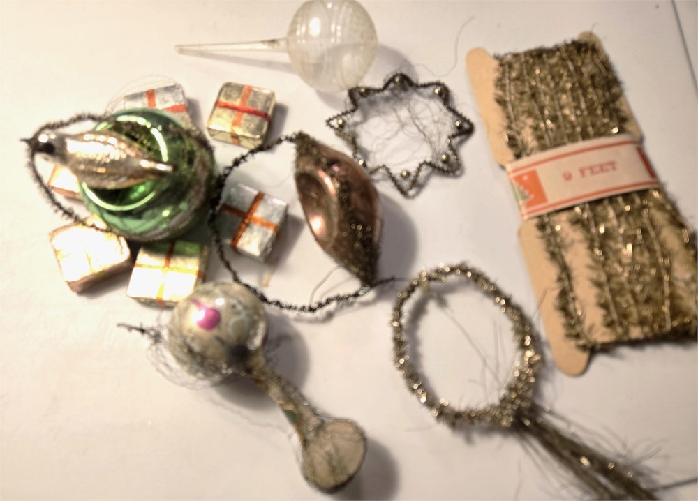Lot of ANTIQUE CHRISTMAS ITEMS, HAND BLOWN ORNAMENTS,TINSEL,AND MORE