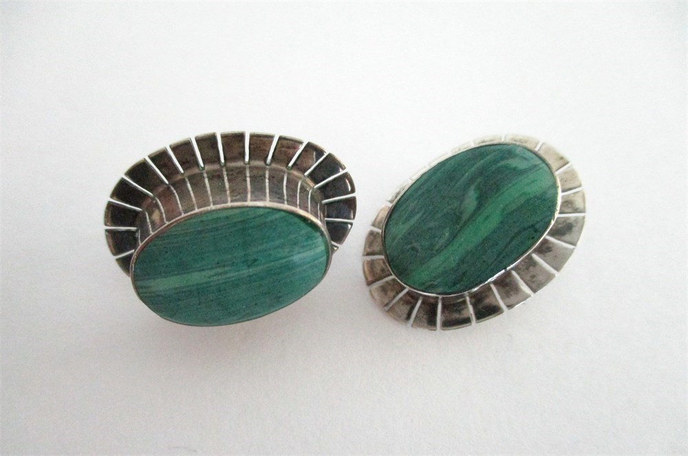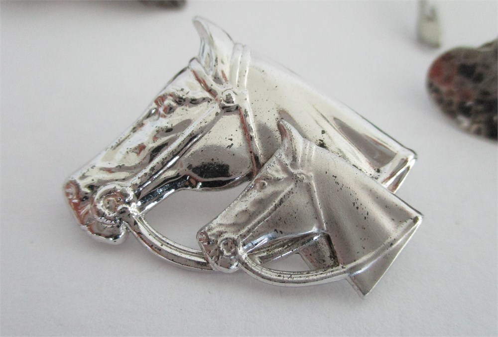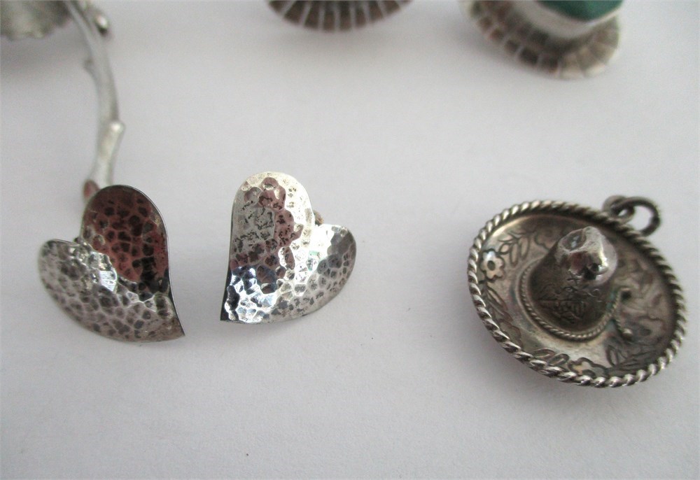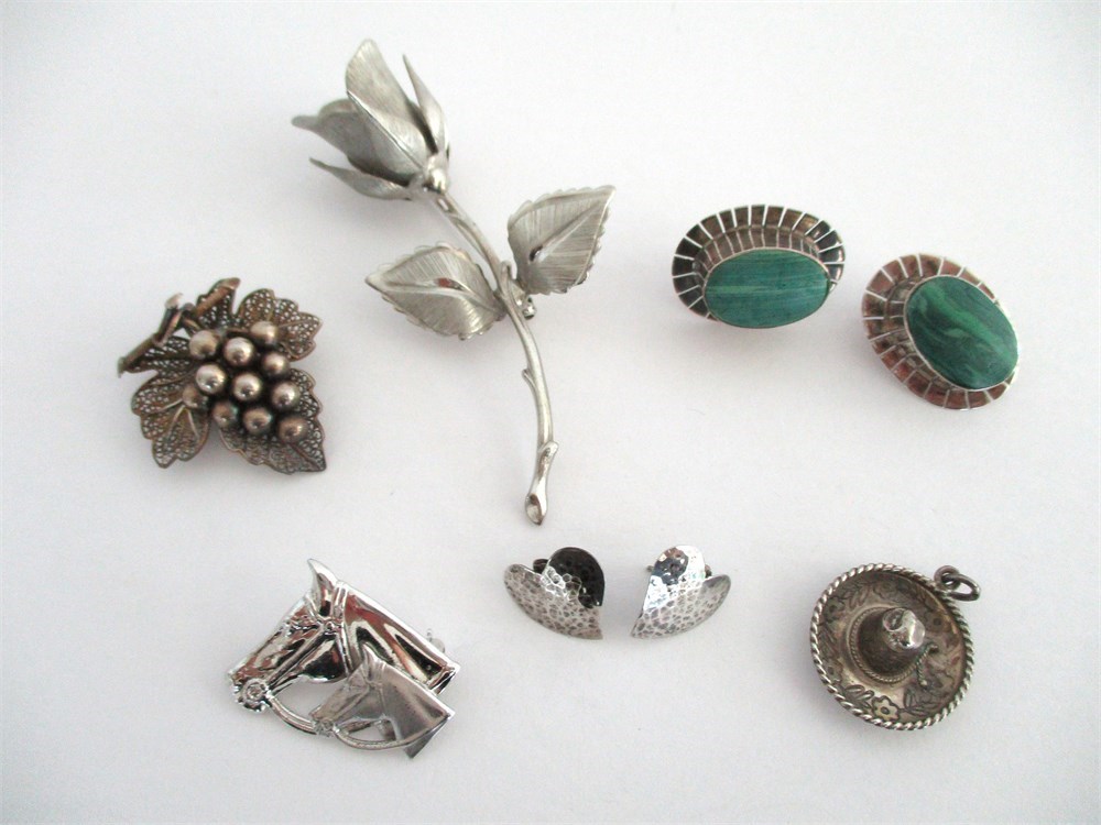 This is a lovely vintage Jewelry lot consisting of a pair of Hammered Sterling Heart post back earrings, a pair of Sterling and Malachite post back earrings Mexico, Sterling Sombreo Charm, Silver Grape and Grape Leaf Brooch, a Silver-tone Rose Brooch and a Sterling Equestrian pin.  All in very nice vintage condition!