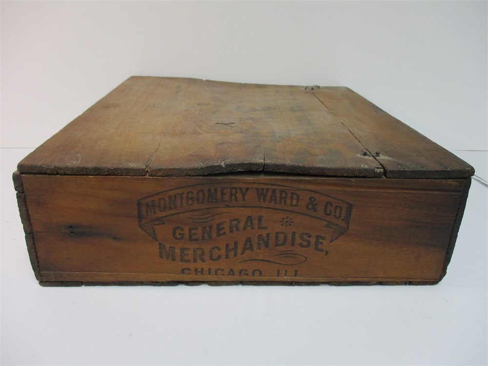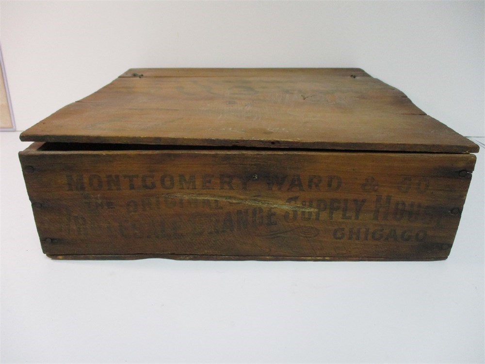 This is an original wooden shipping crate from Montgomery Ward & Co., the famous Chicago-based mail-order company that operated from the late 1800s through the 20th century. The stenciled lettering on the front reads: