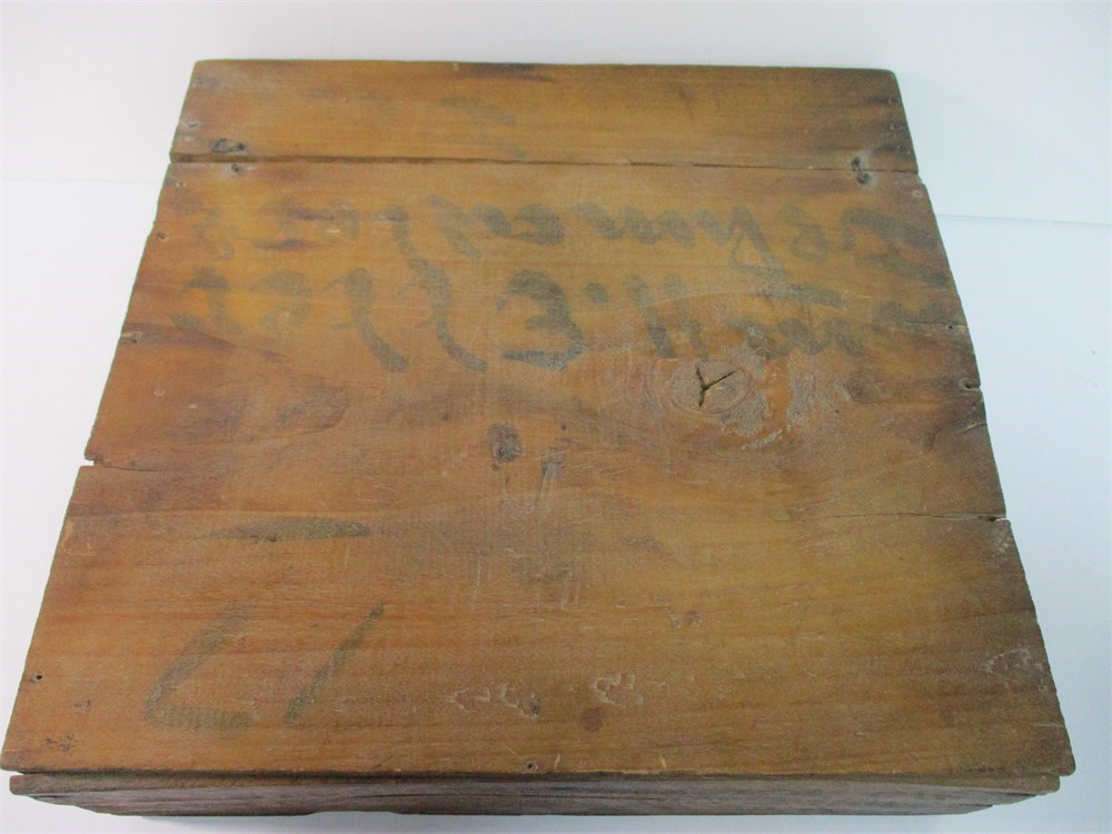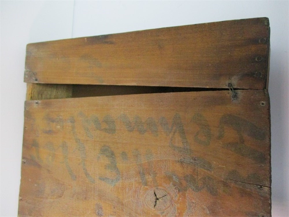 The crate is made of pine or a similar softwood, with nailed construction and an aged, naturally worn patina. The top boards appear original and show separation and age-related warp, but they are still present — a big plus for collectors, since many tops were discarded over the years.