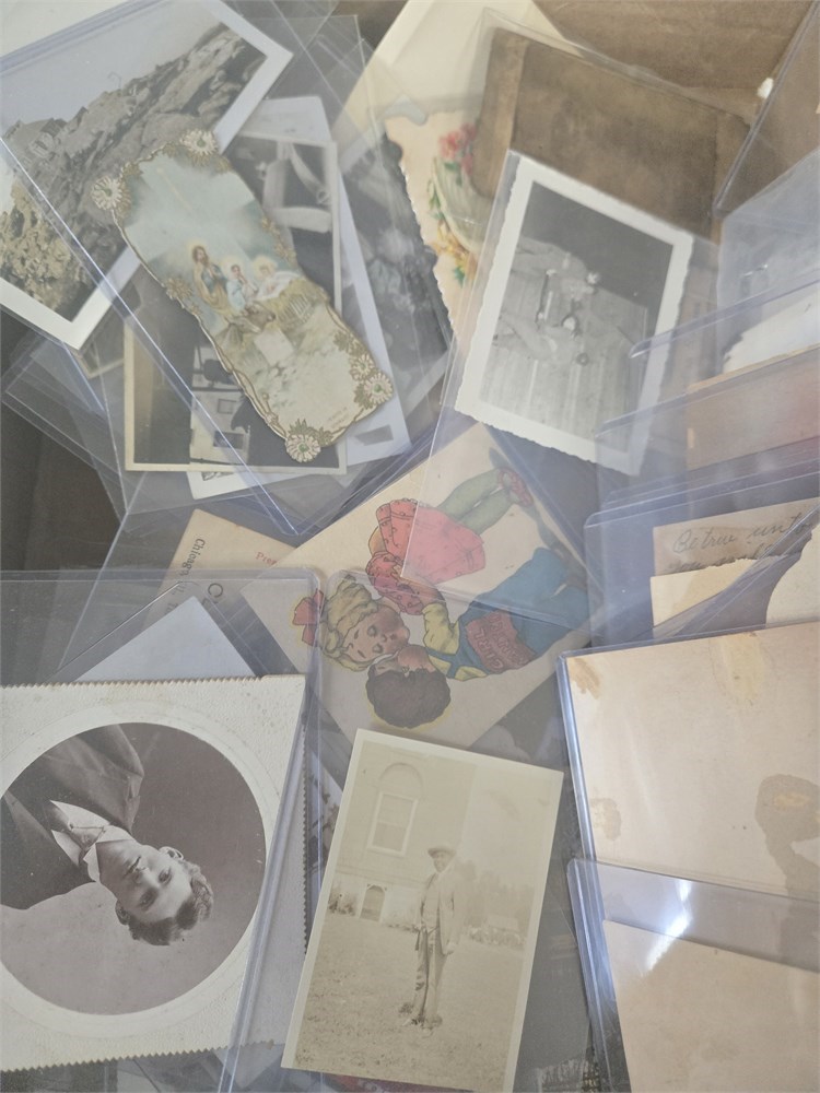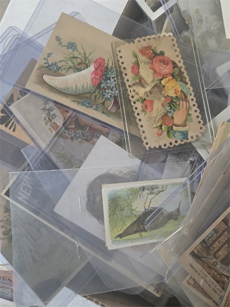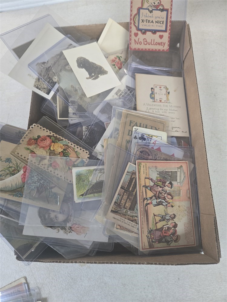 Box lot of antique paper items, cards and postcards. Nice selection.