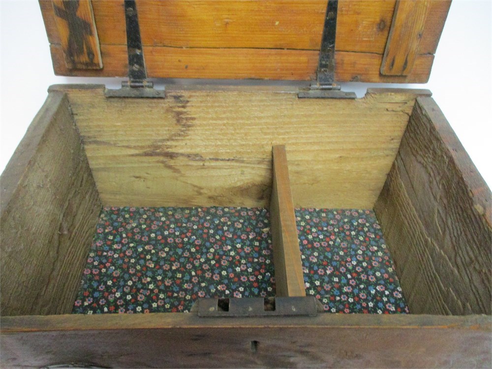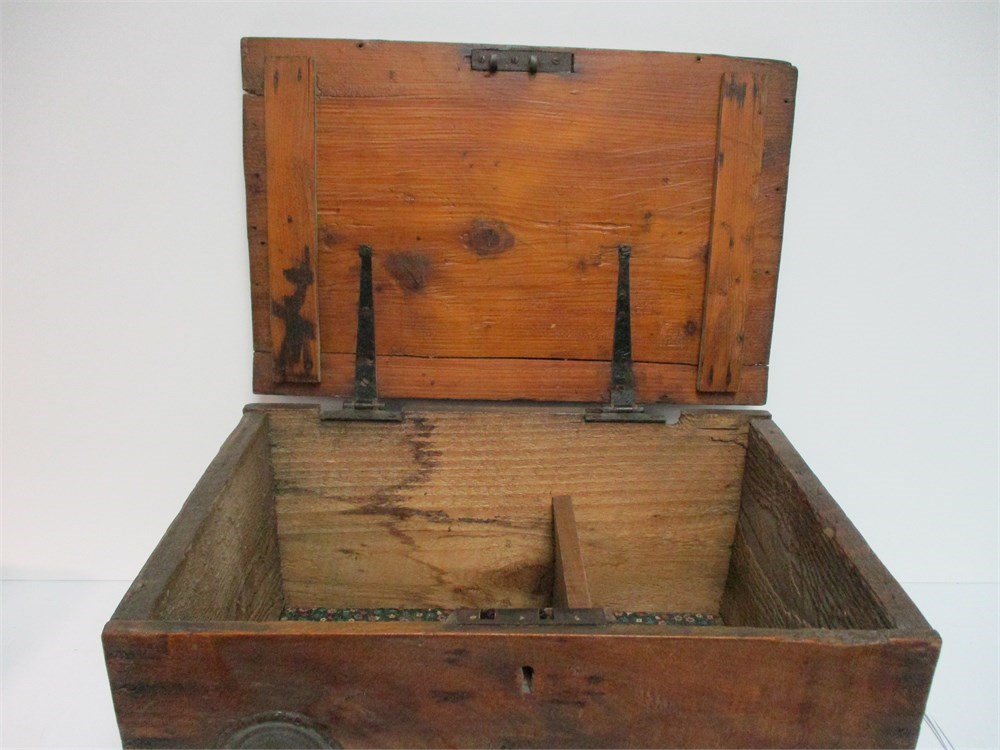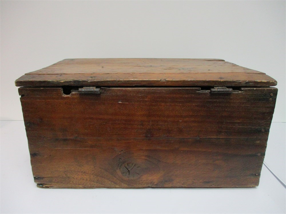 This is an old primitive wooden chest, likely handmade and used for documents, valuables, or small personal belongings. Based on construction and wear patterns, it appears to be 19th century or early 20th century.