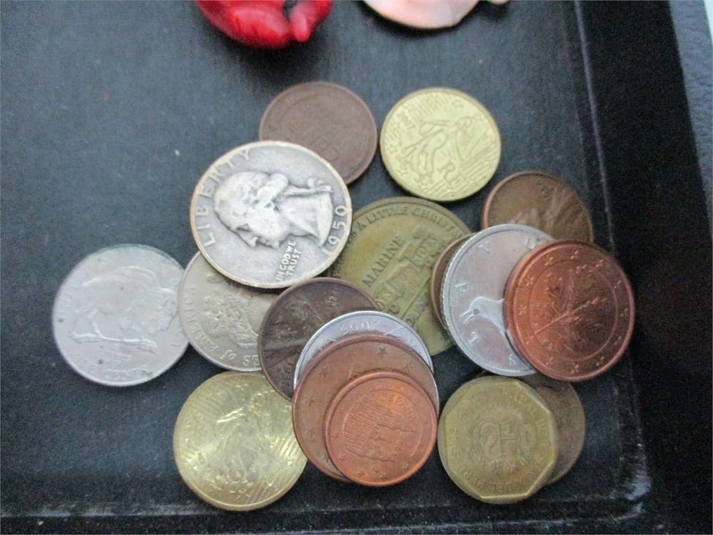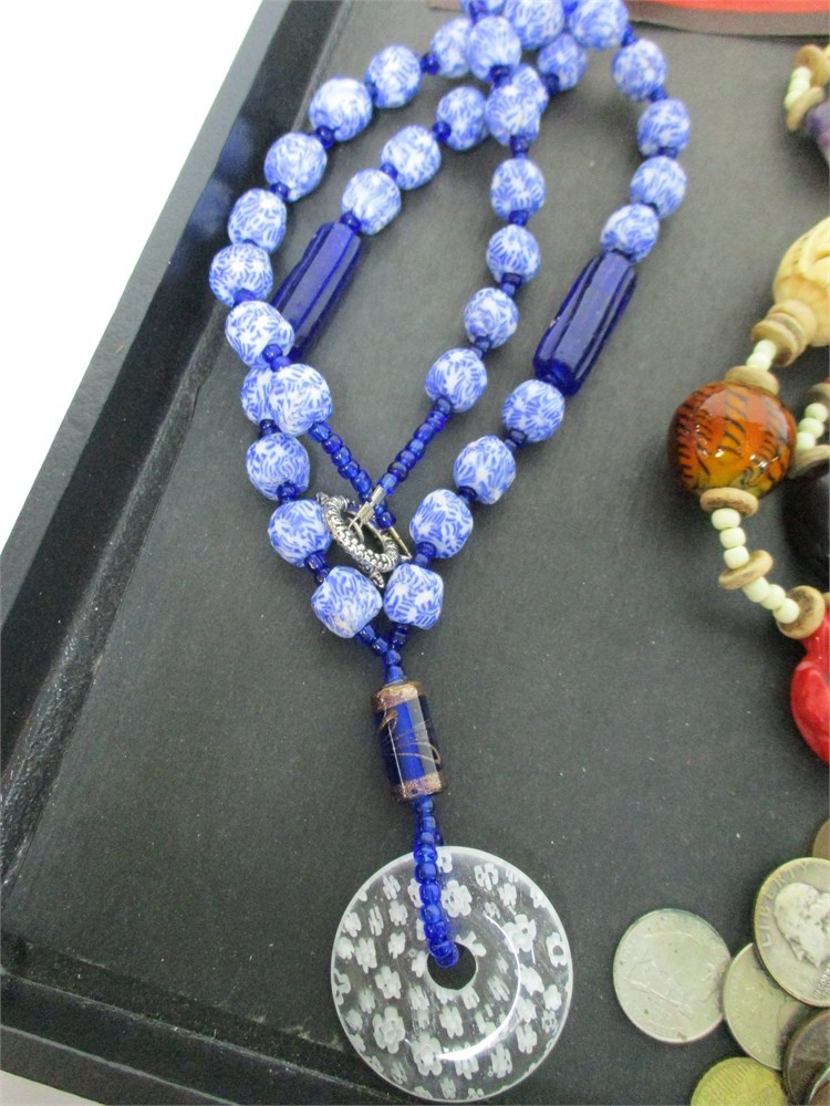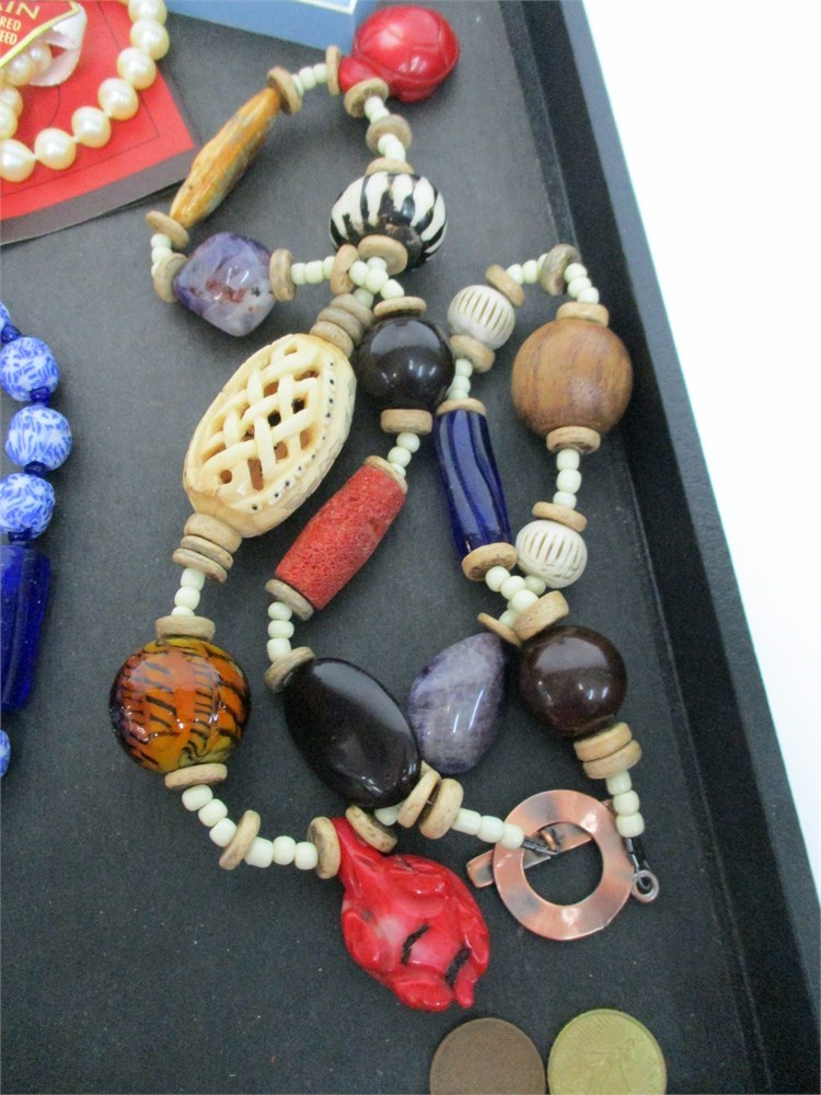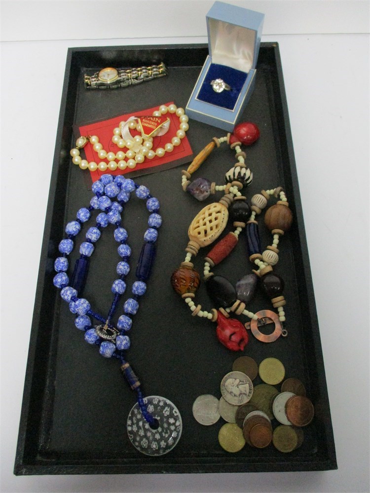 This Vintage lot consists of Costume Jewelry, Gemstone and Bead Necklace, Blue & White Ceramic and Glass Beads, Pearls of Majorca Spain, Ring Set, Miscellaneous coins, US and Foreign and a Watch.  All in nice vintage condition.  Watch is untested.