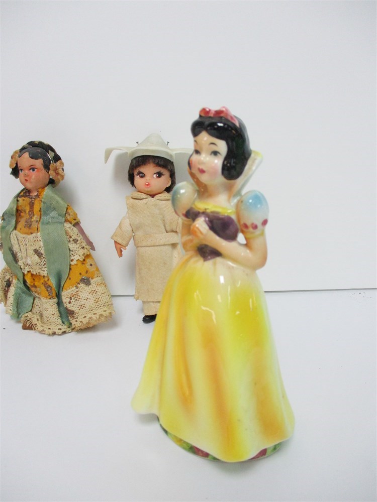 This is a miscellaneous group of vintage dolls, spanning several decades and multiple styles, including international costume dolls, a mid-century Barbie-family doll, and small porcelain figurines. Here’s a breakdown of each type: