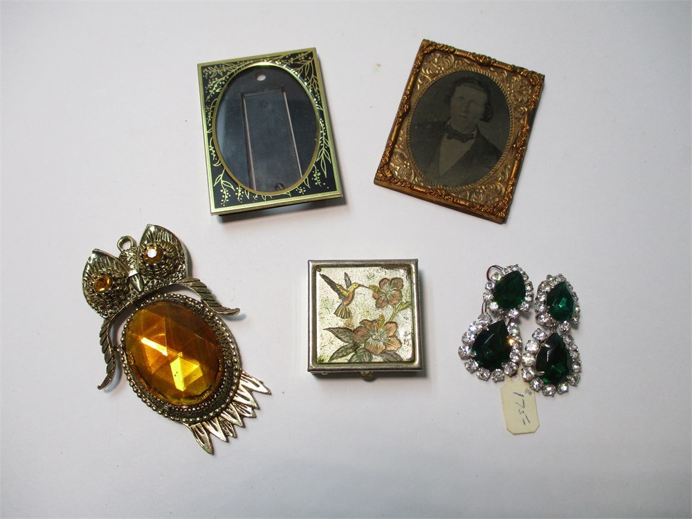 Collectibles Group with owl, old jewelry, frames and pill box.
