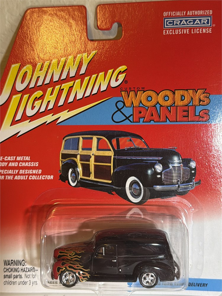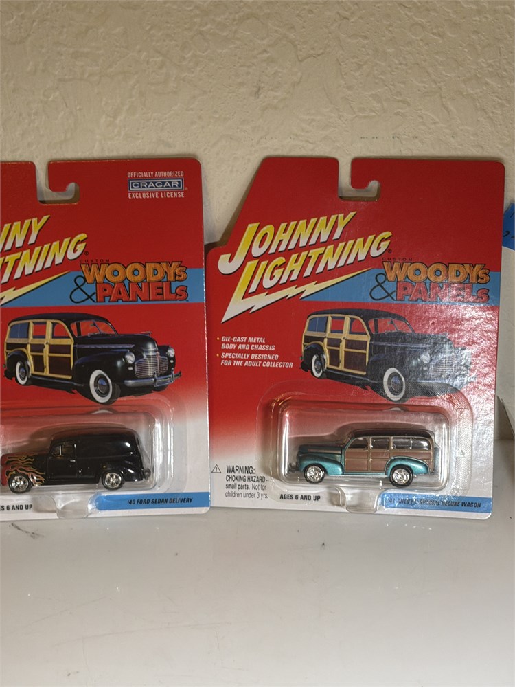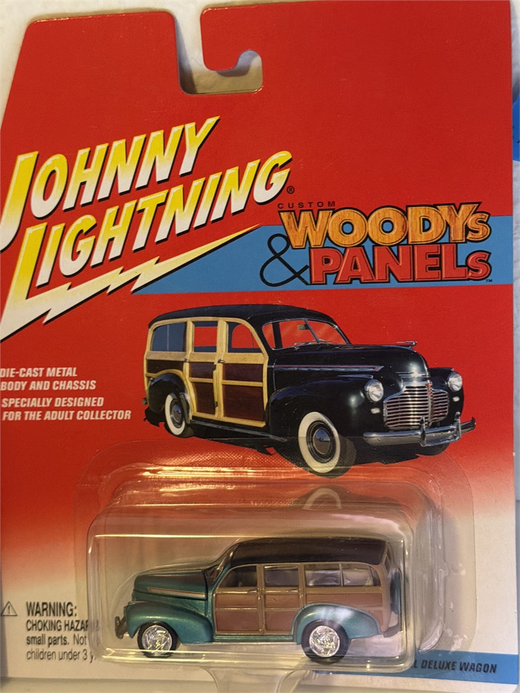 Johnny lightning custom Woodies and panels 44 sedan delivery and 41 Chevy special deluxe wagon Ones black with flames. The other ones are blue and WOOD.
