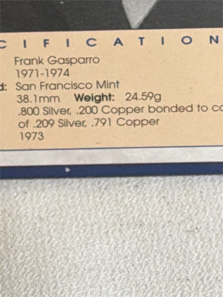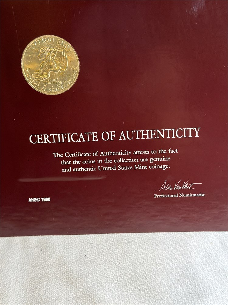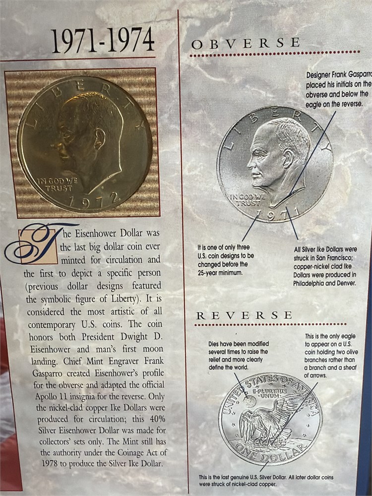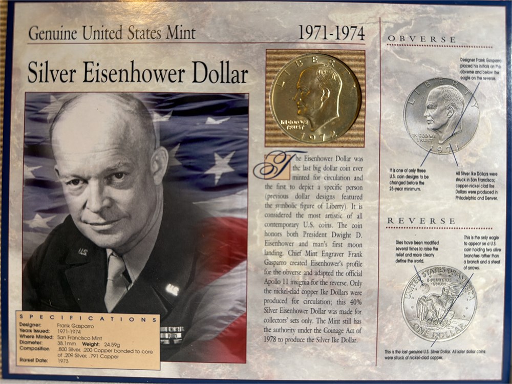 The image displays packaging for a genuine United States Mint  Eisenhower Dollar, minted between 1971 and 1974. Gold plated