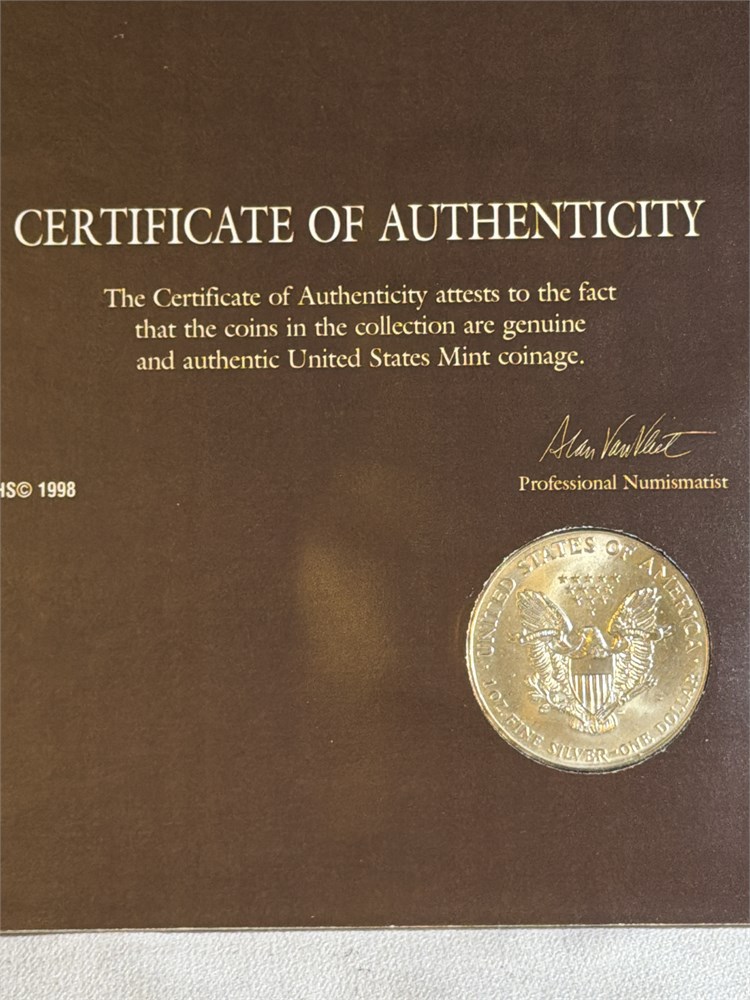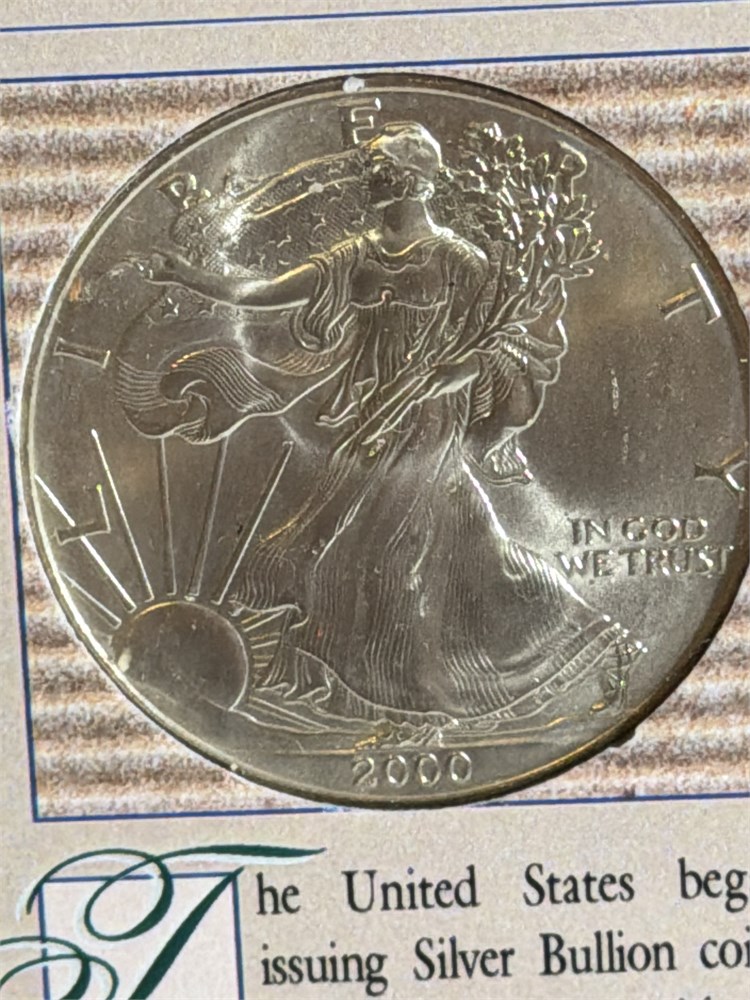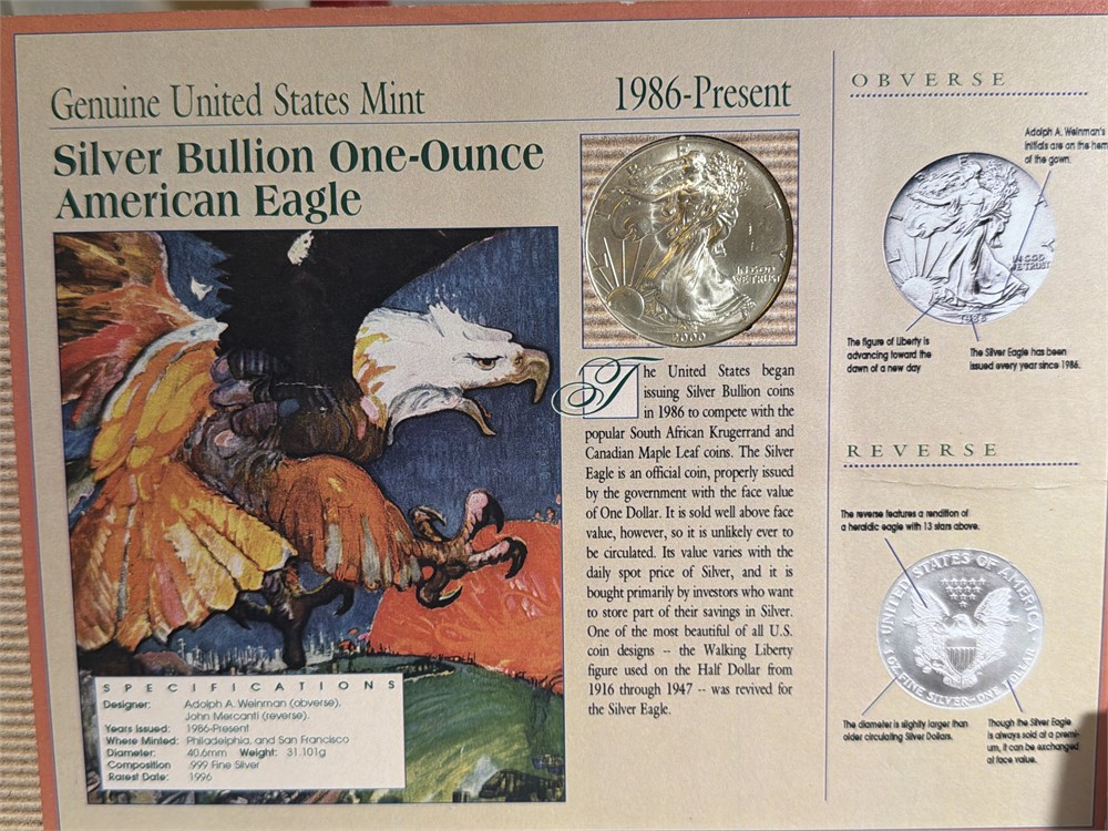 United States Mint Silver Bullion One-Ounce American Eagle coin display and information card.