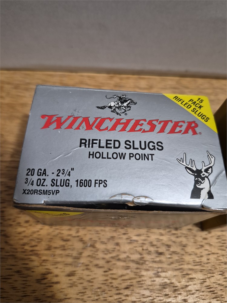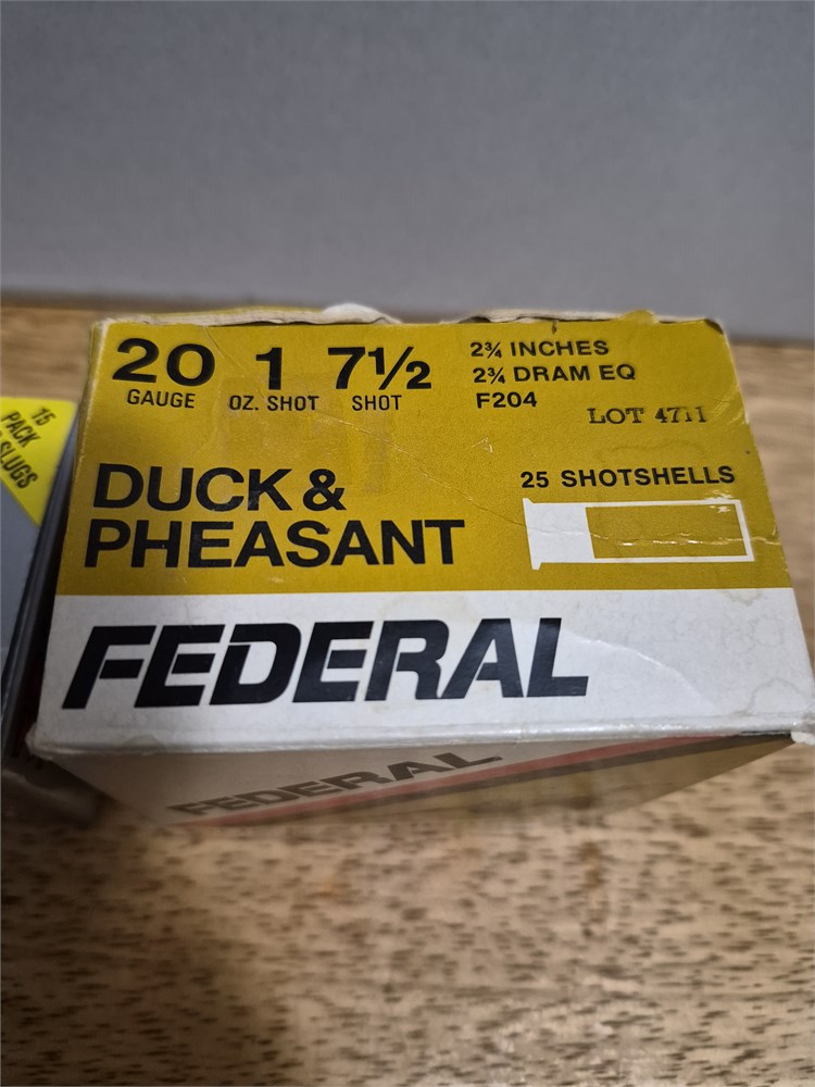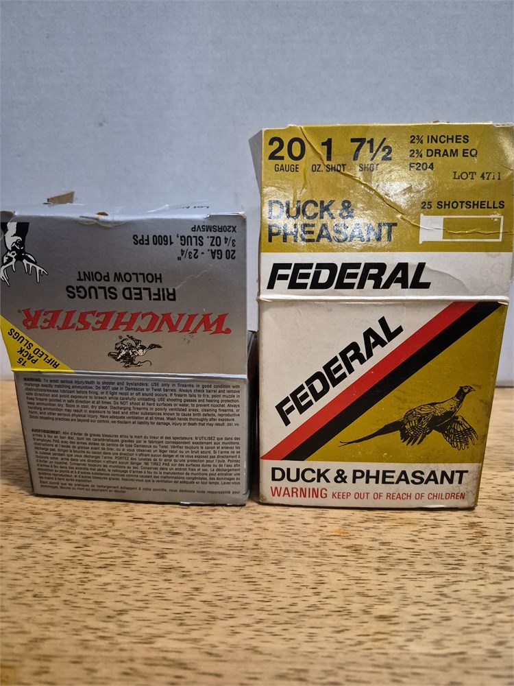 Two partial boxes of shot gun shells. Includes 12 Federal 20 Guage 1 Oz 7 1/2 and 9 20 Guage 2 3/4 slugs.