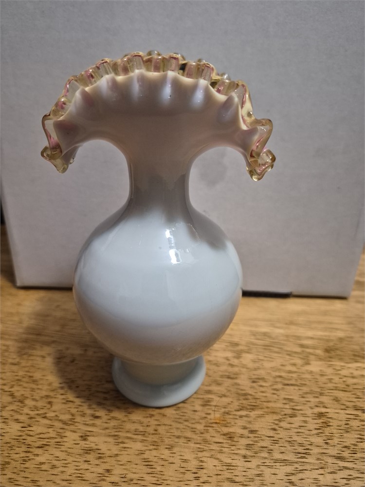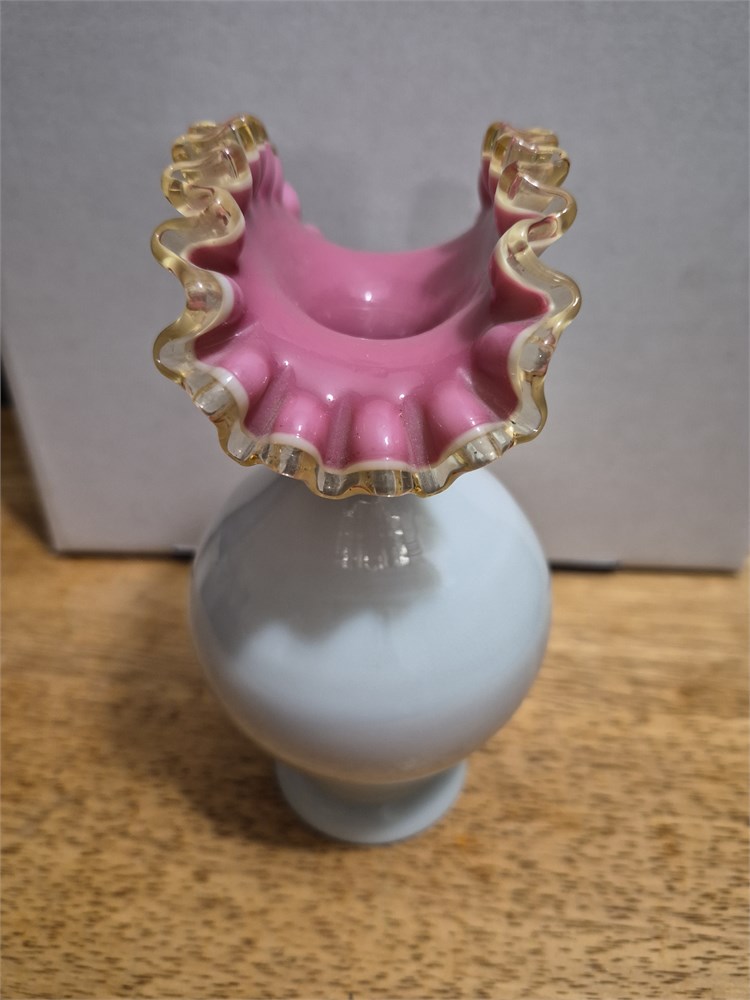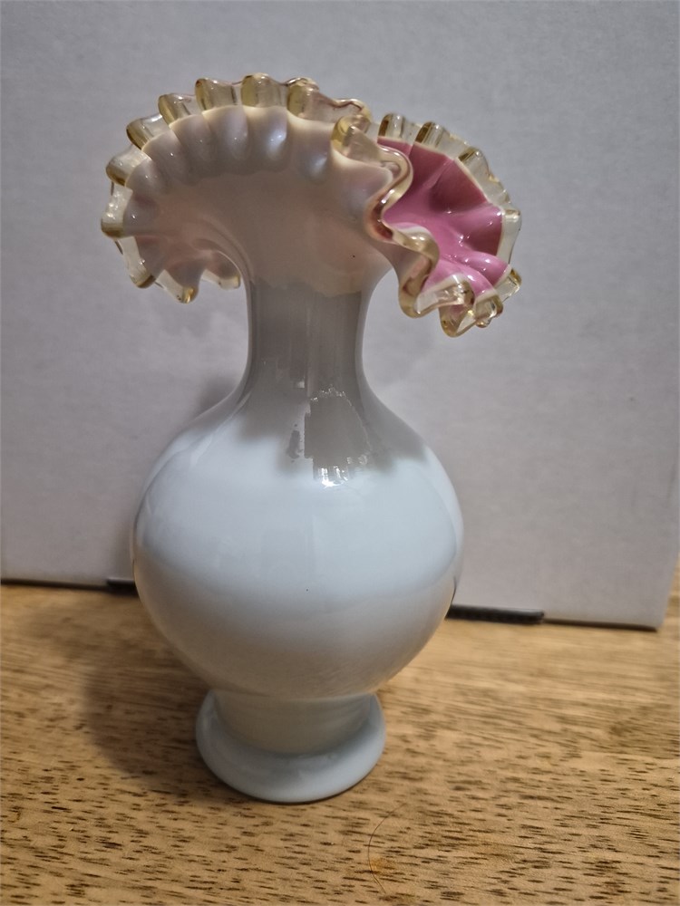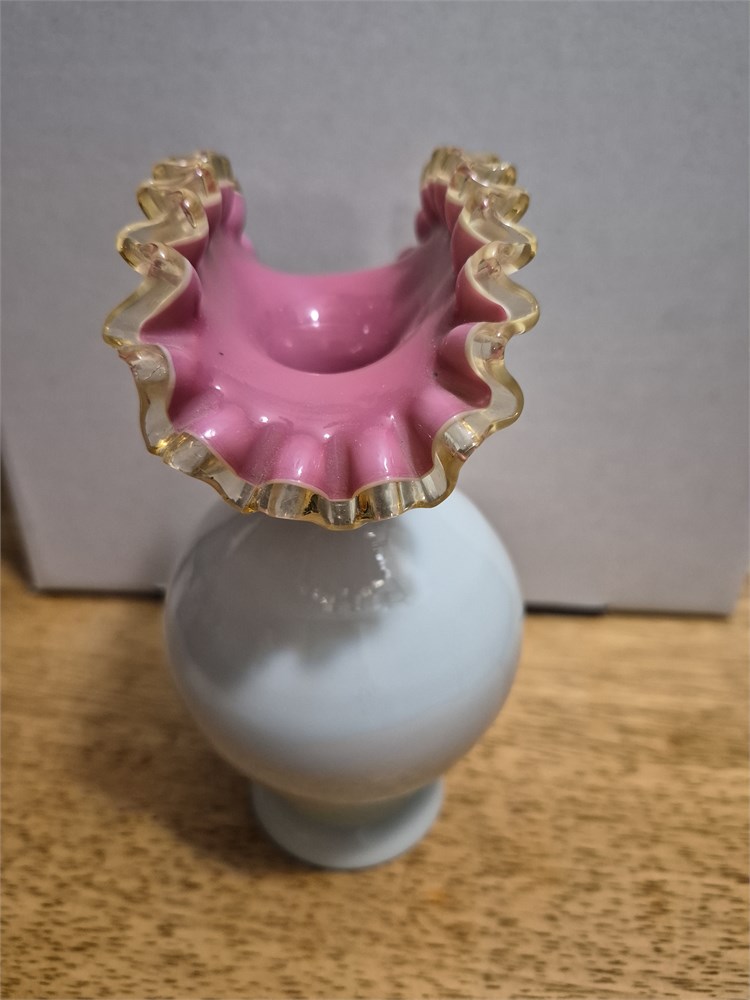 Fenton Peach Crest, Pink /White Cased Glass Vase 6" (LB)
