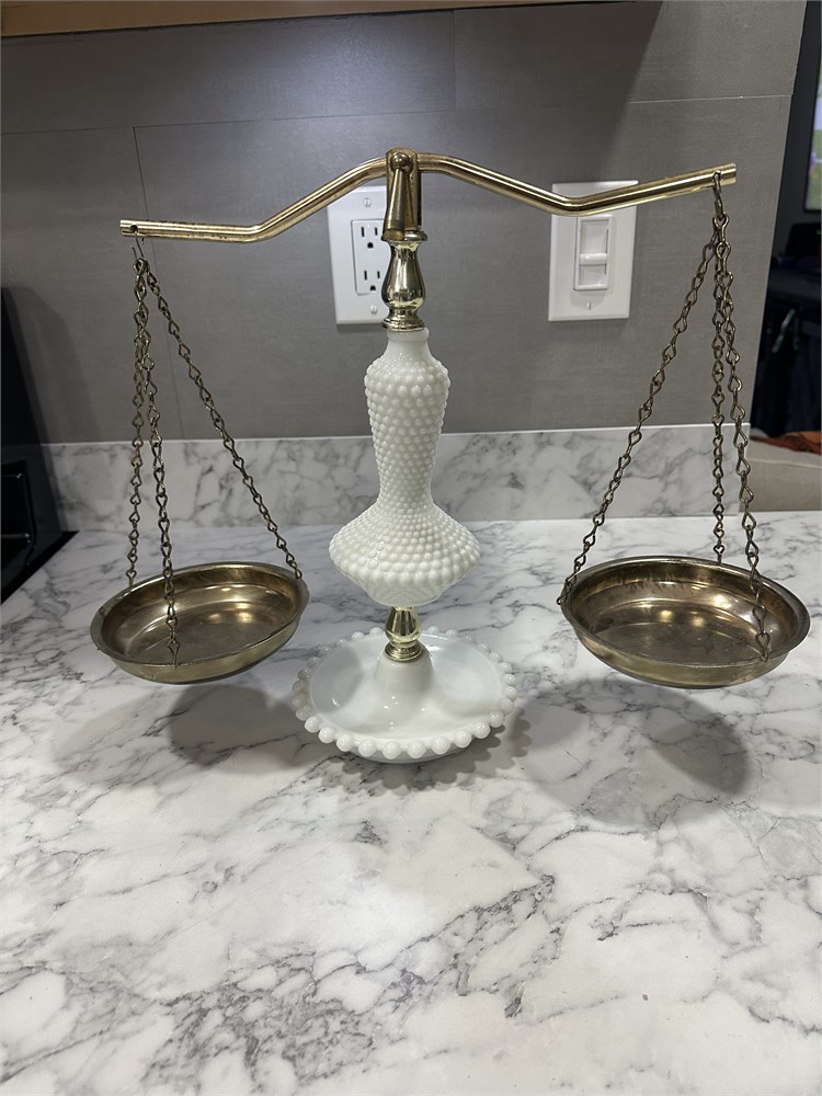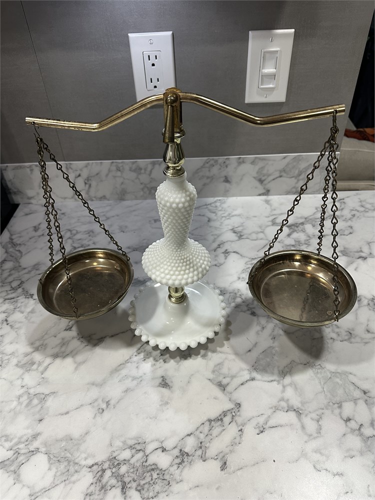 This is a vintage milk glass and brass double-pan balance scale with a hobnail pattern