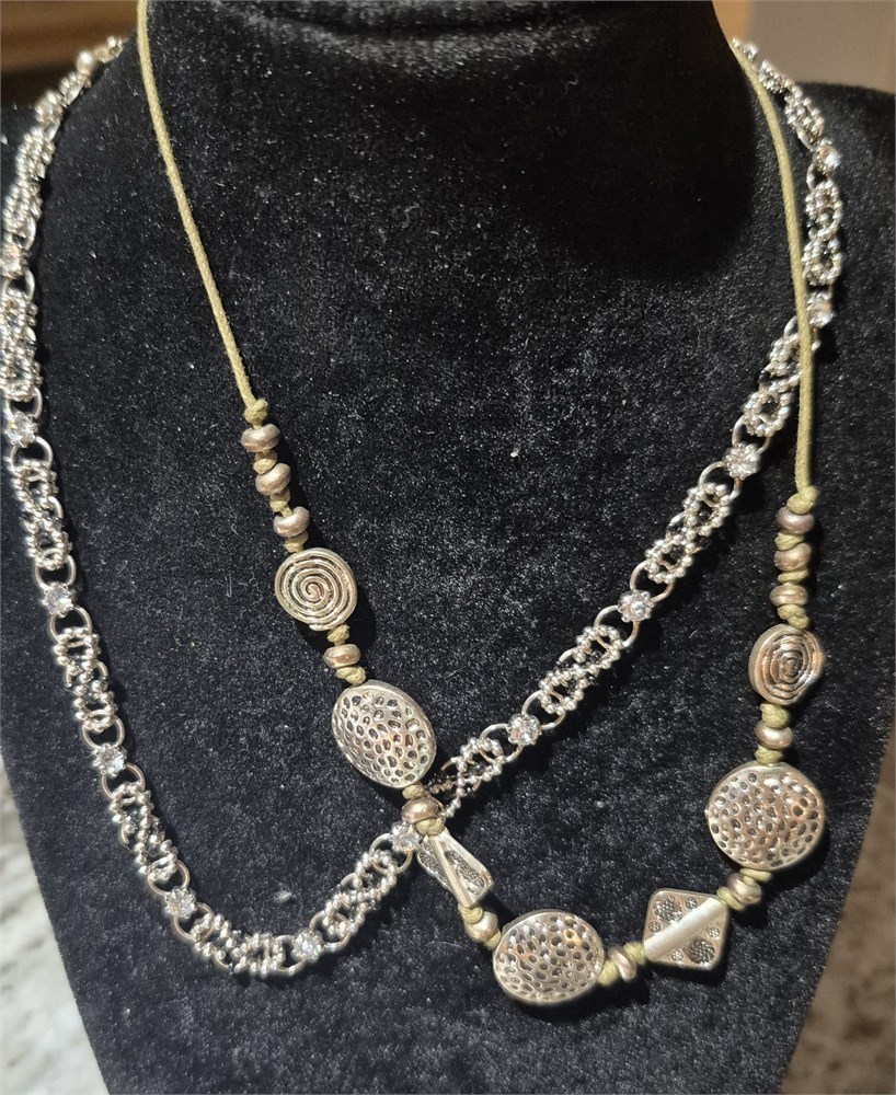 Two Silver tone Necklaces ~ Brighton style Greek & Bar 'n Chain & B&K Earrings