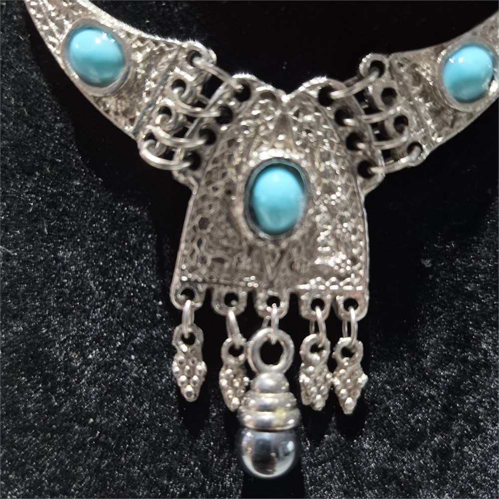 > turquoise stones in a silver tone necklace