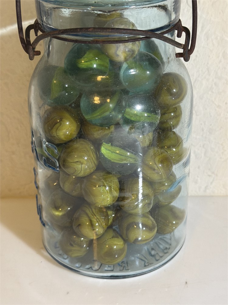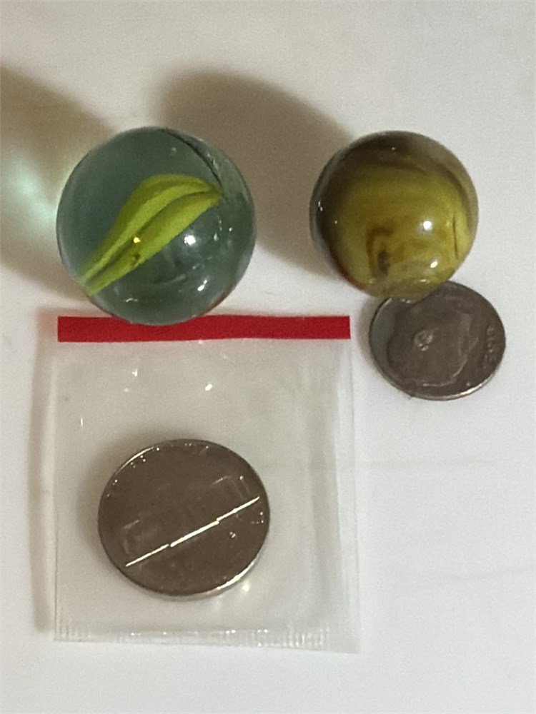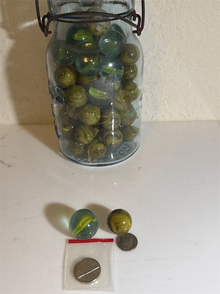 Antique SKO Wide Mouth King Marbles-quart 7“ x 4“ I put a nickel out to show you how large the marble is I put a dime out to show you how large the other one is