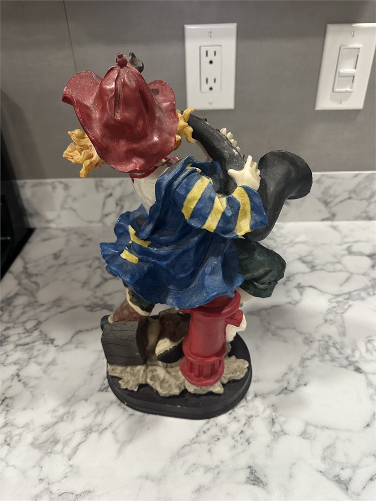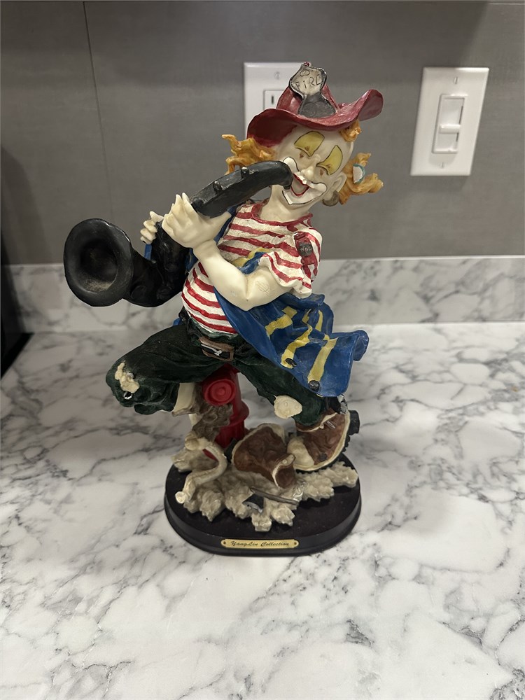 • The figurine depicts a clown dressed in a firefighter-style hat and striped shirt, playing a black saxophone-like instrument.