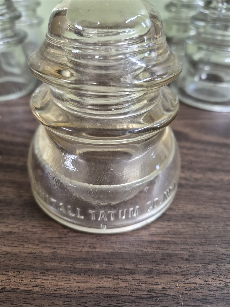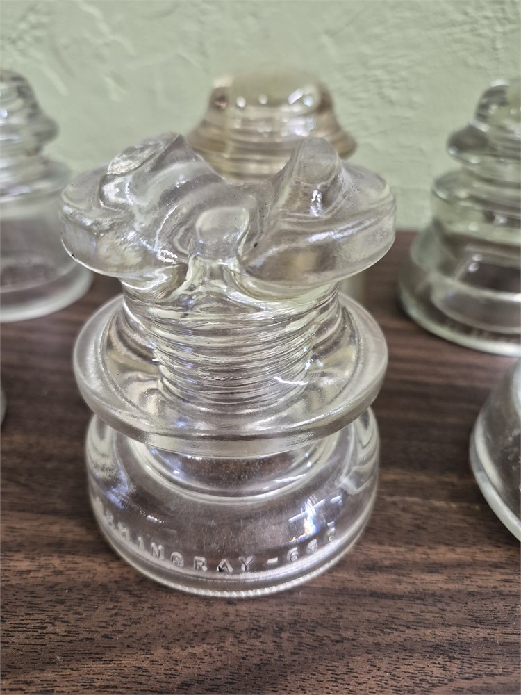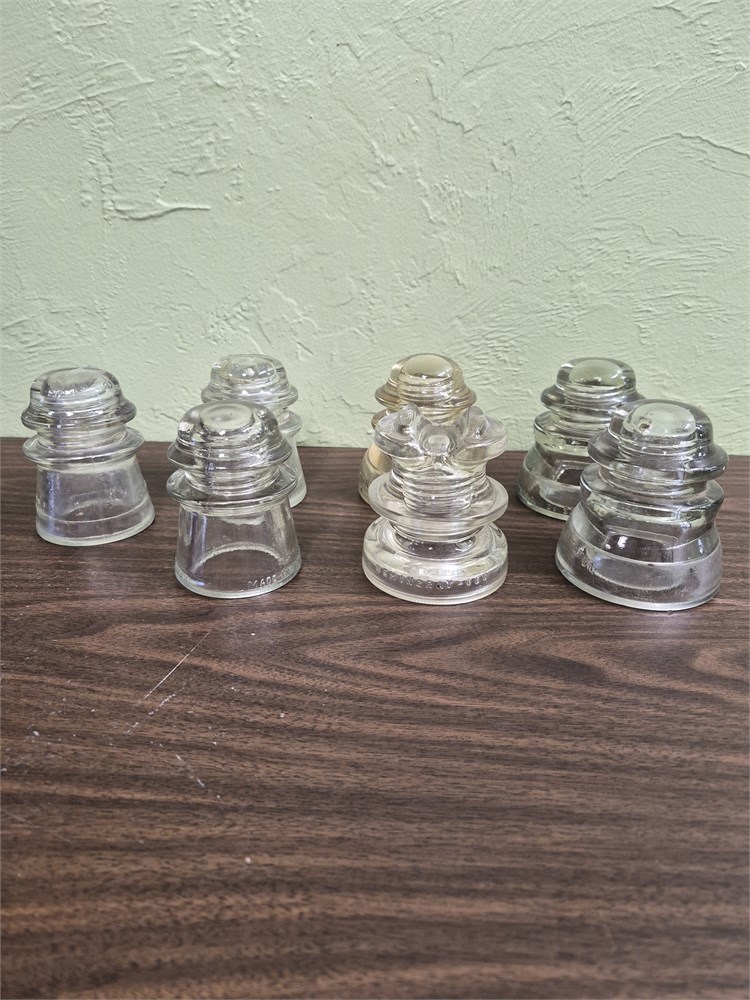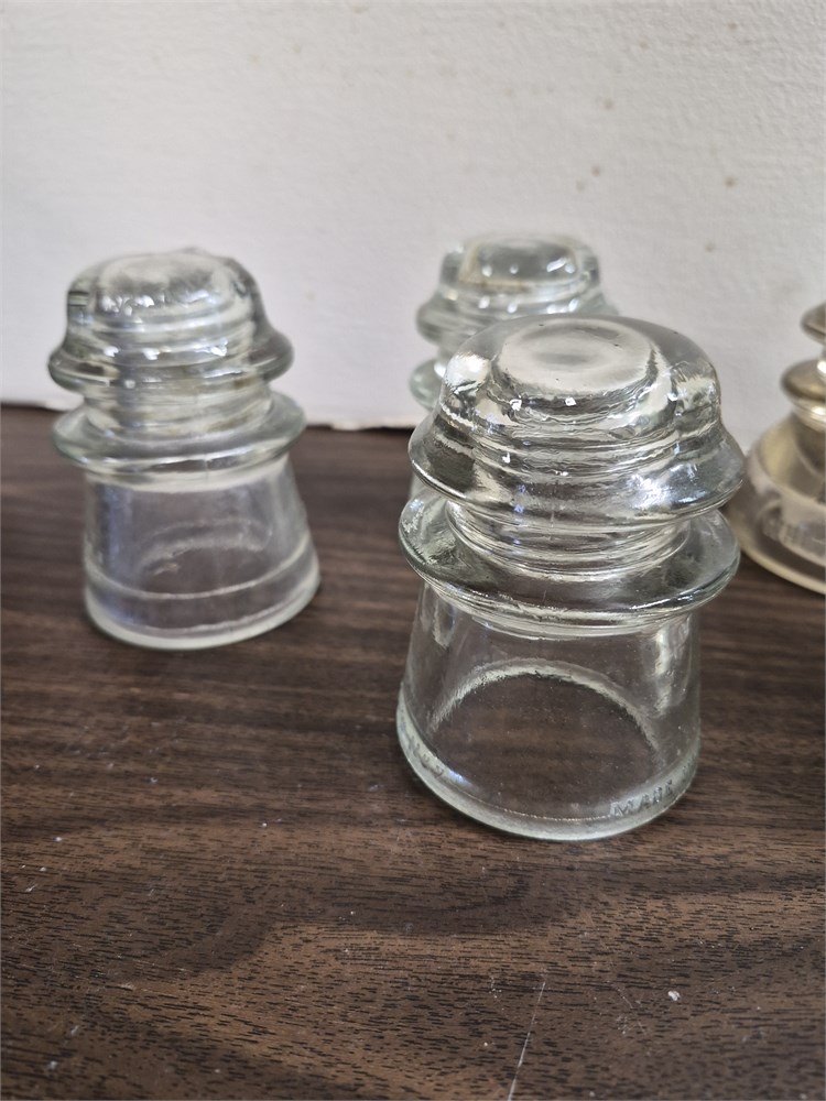 Nice lot of seven glass insulators.The taller ones stand four inches and the shorter ones are just under four inches tall period