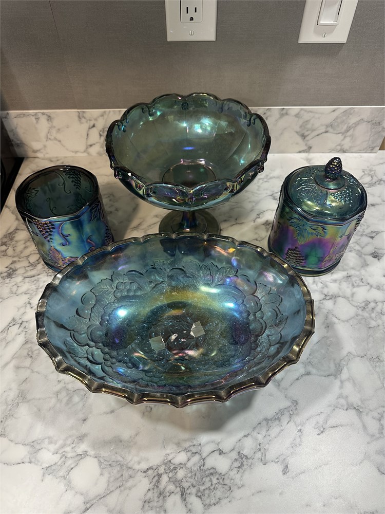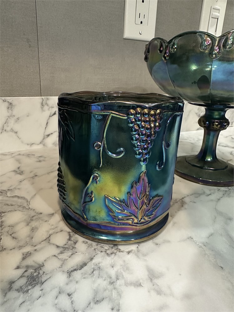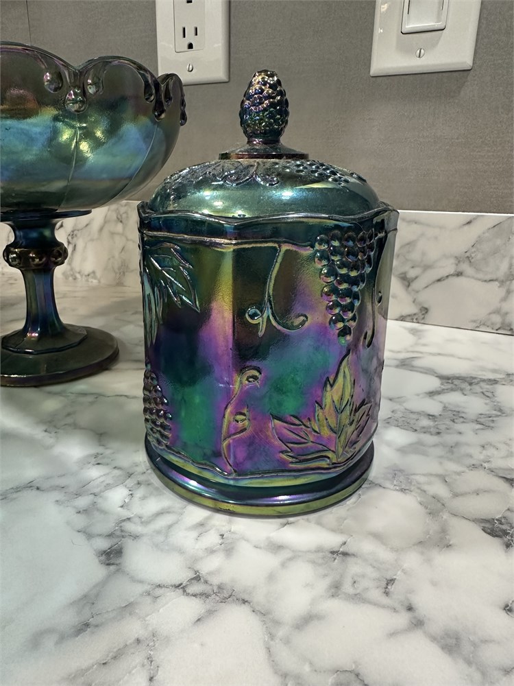 This vintage item is an Indiana Glass Harvest Grape Canister Jar in iridescent blue carnival glass.