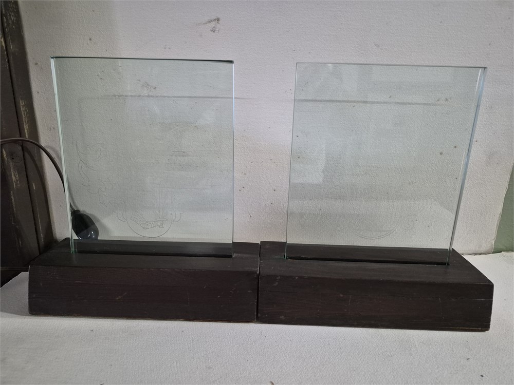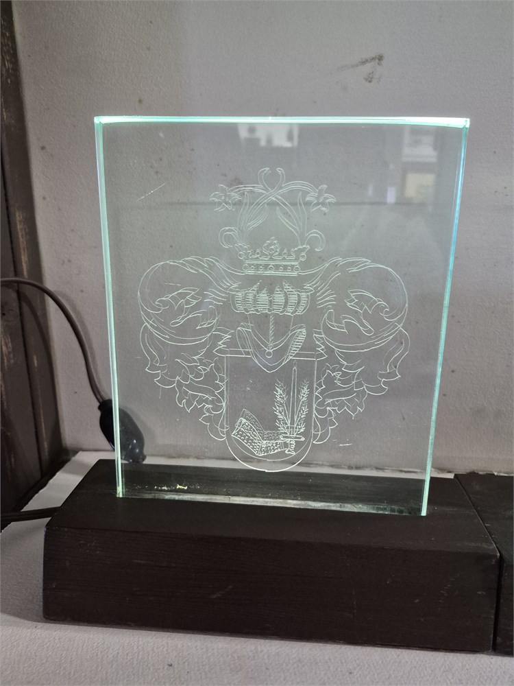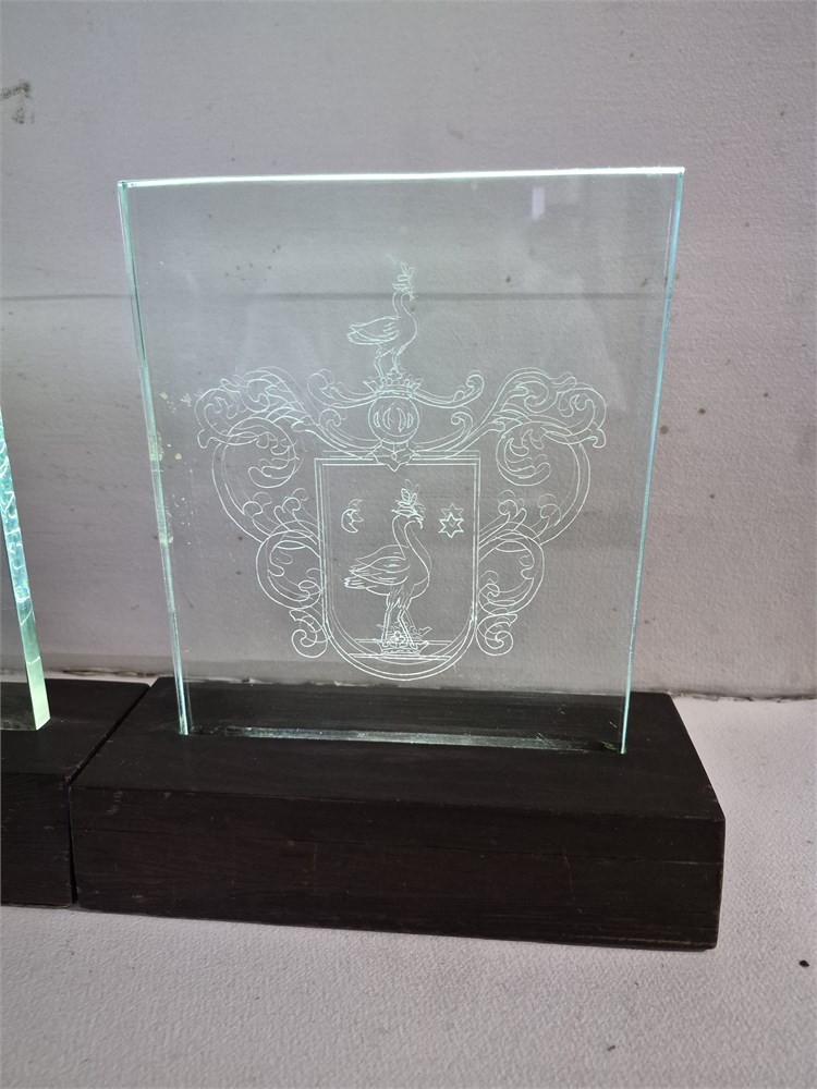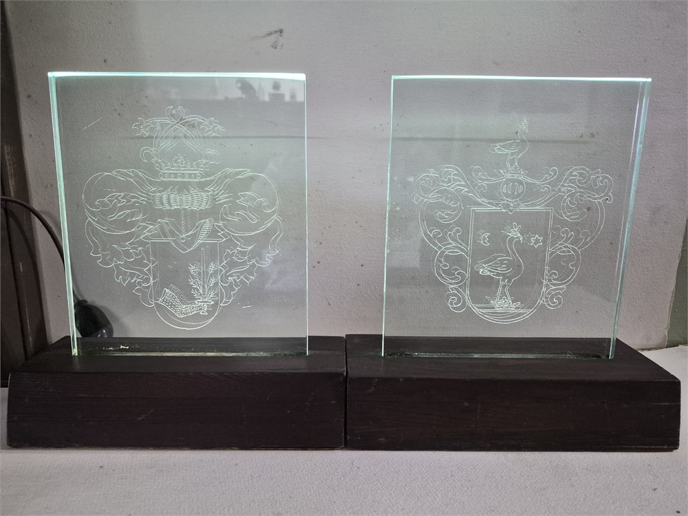 Two lighted glass family crest set in wood bases period each crest measures eight inches long and nine inches tall.