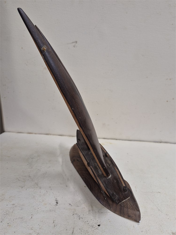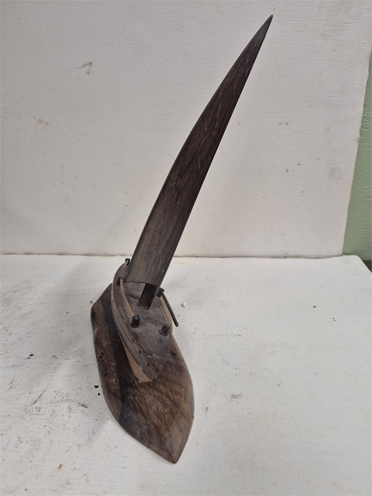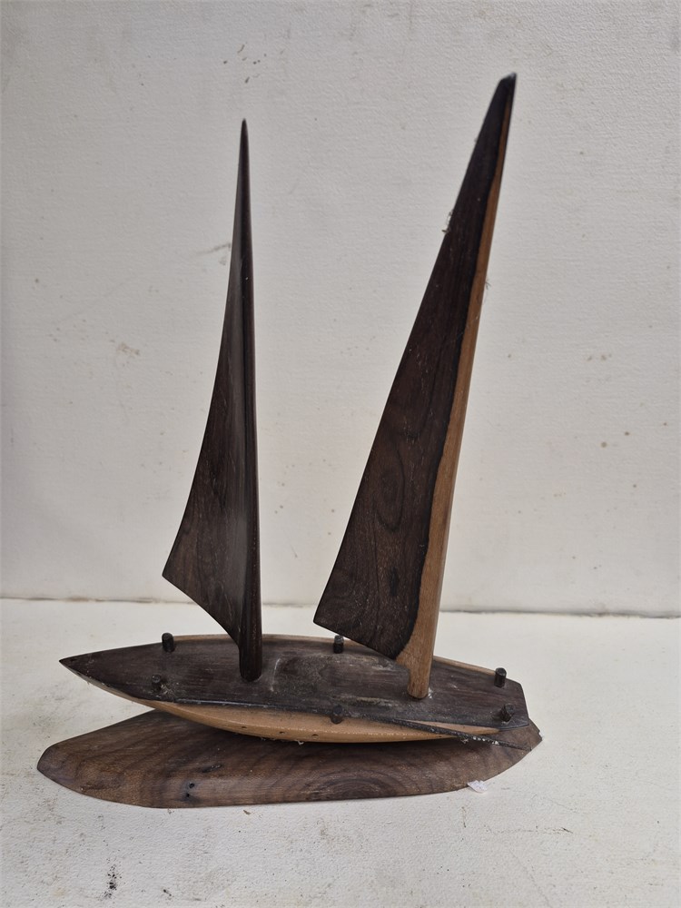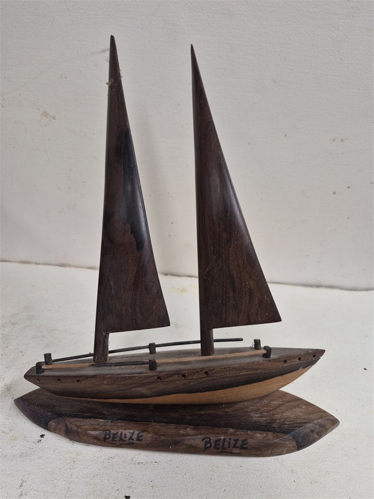 Nice Wood Carved Sailboat.  Boat is sixteen and a half inches tall to the highest sale.And just over twelve inches, long on base.
