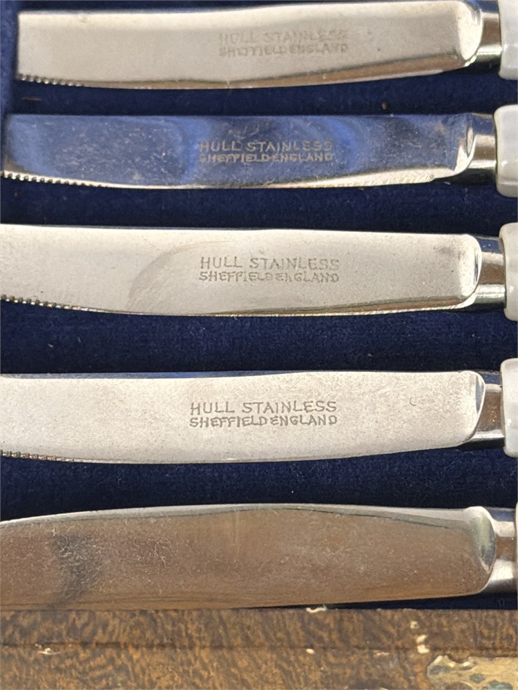 Sheffield, England  Box of 6 Eales of  Knives Sterli stainless steel with  Bolster Pearl Handle