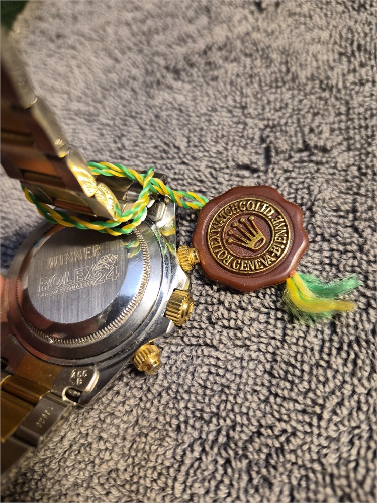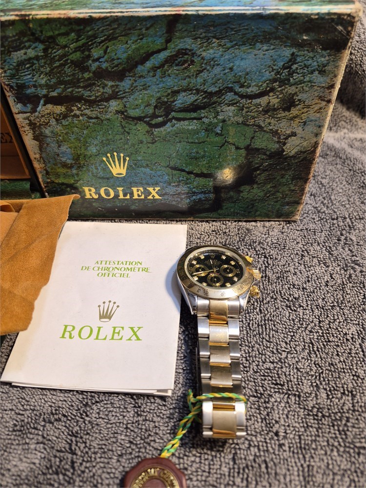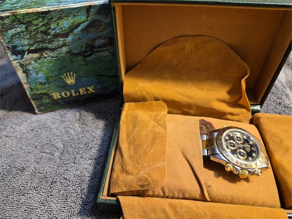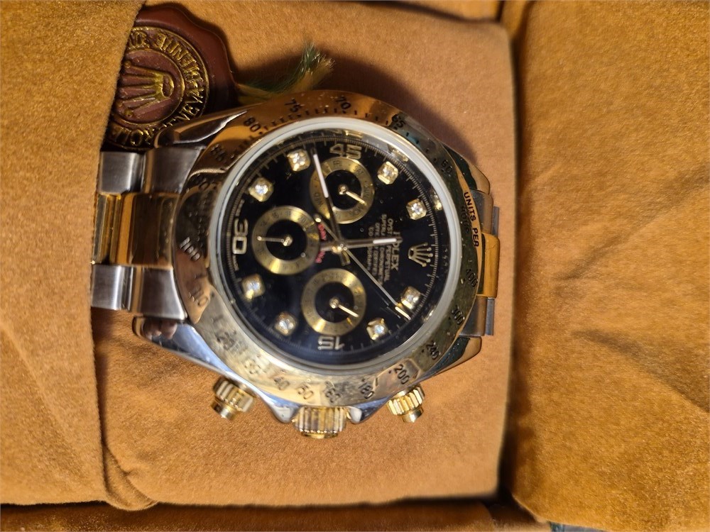 Really nice Faux Rolex Oyster perpetual. Watch still works great. Comes with box case paperwork.