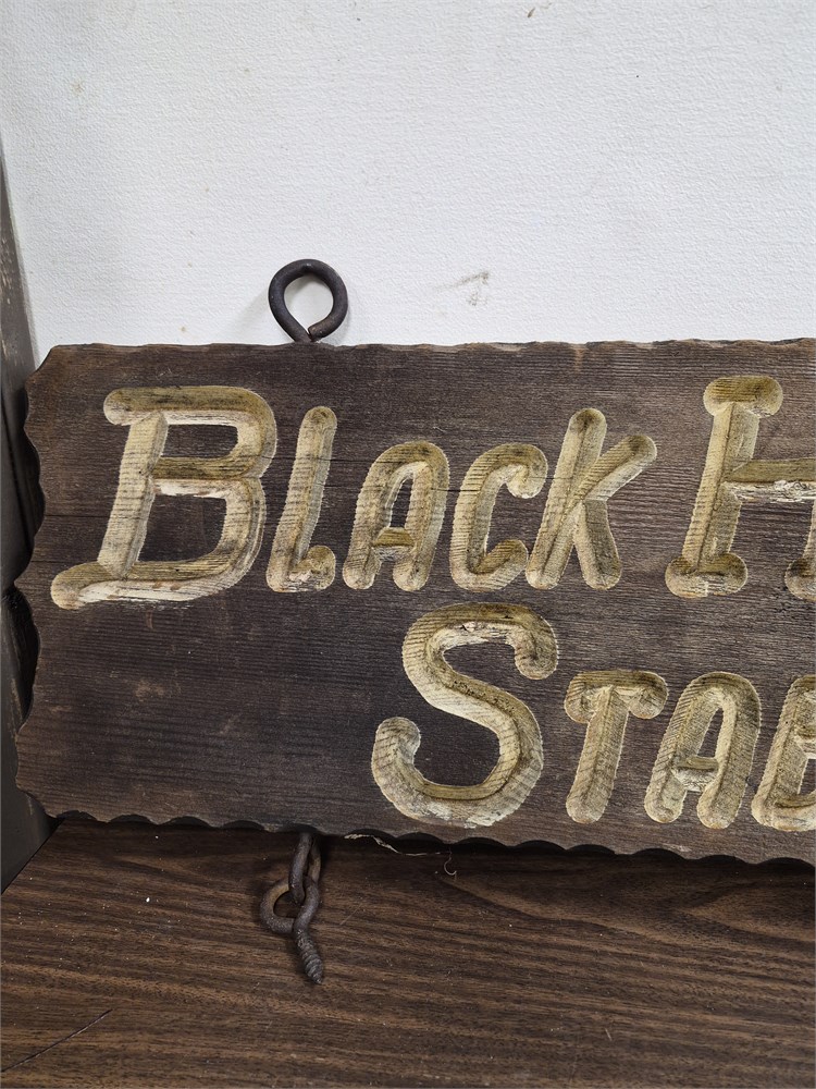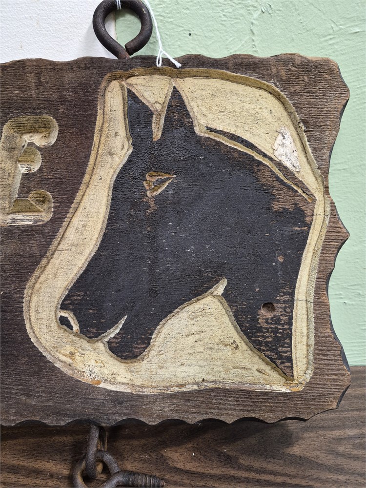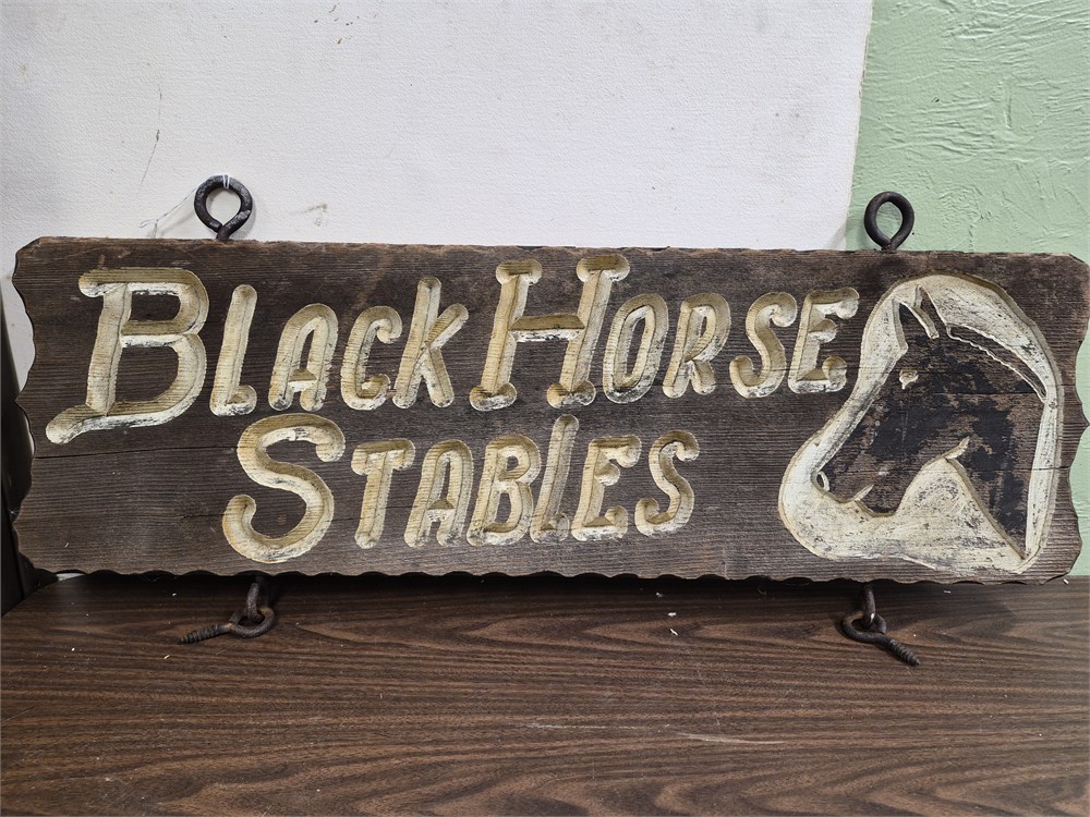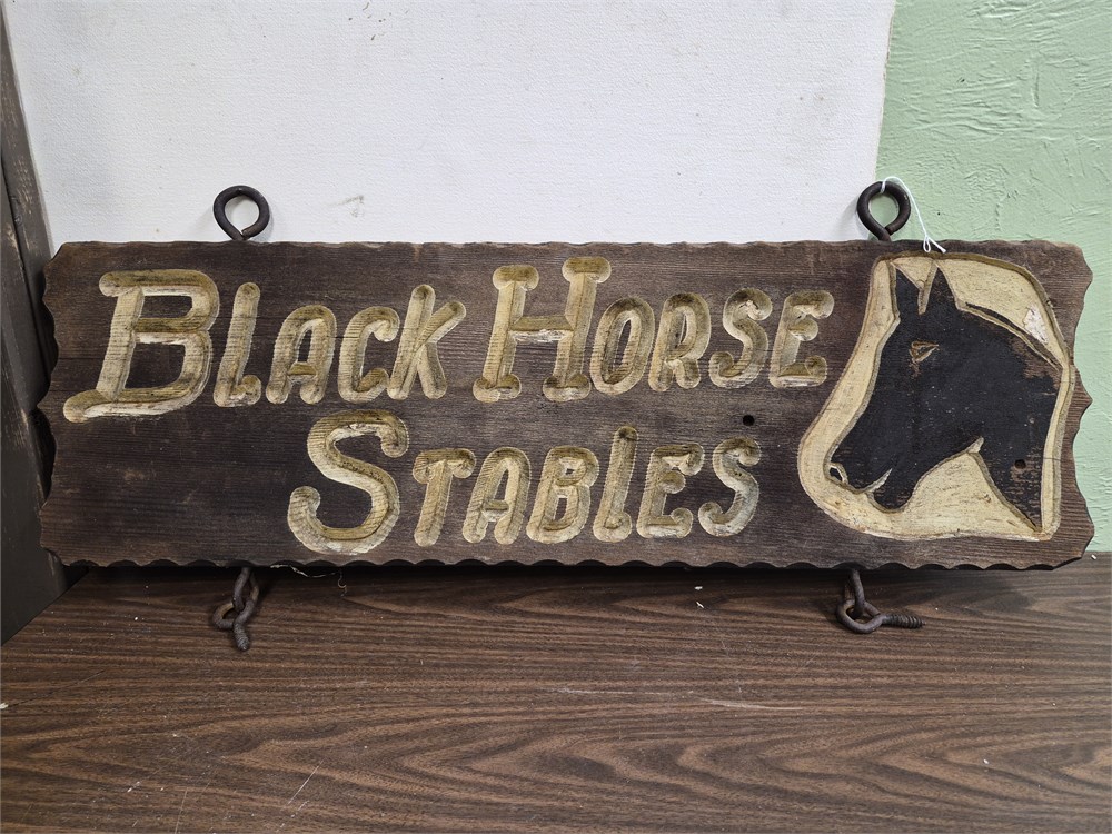 Nice vintage wooden sign.The sign is for black horse stables.Sign measures thirty six inches wide by eleven inches.Tall still has the metal hooks and screws to hang