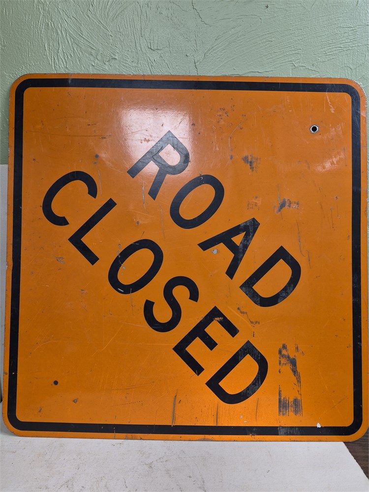 DOT Orange 30" by 30" road closed sign. Has wear and tear from being in use