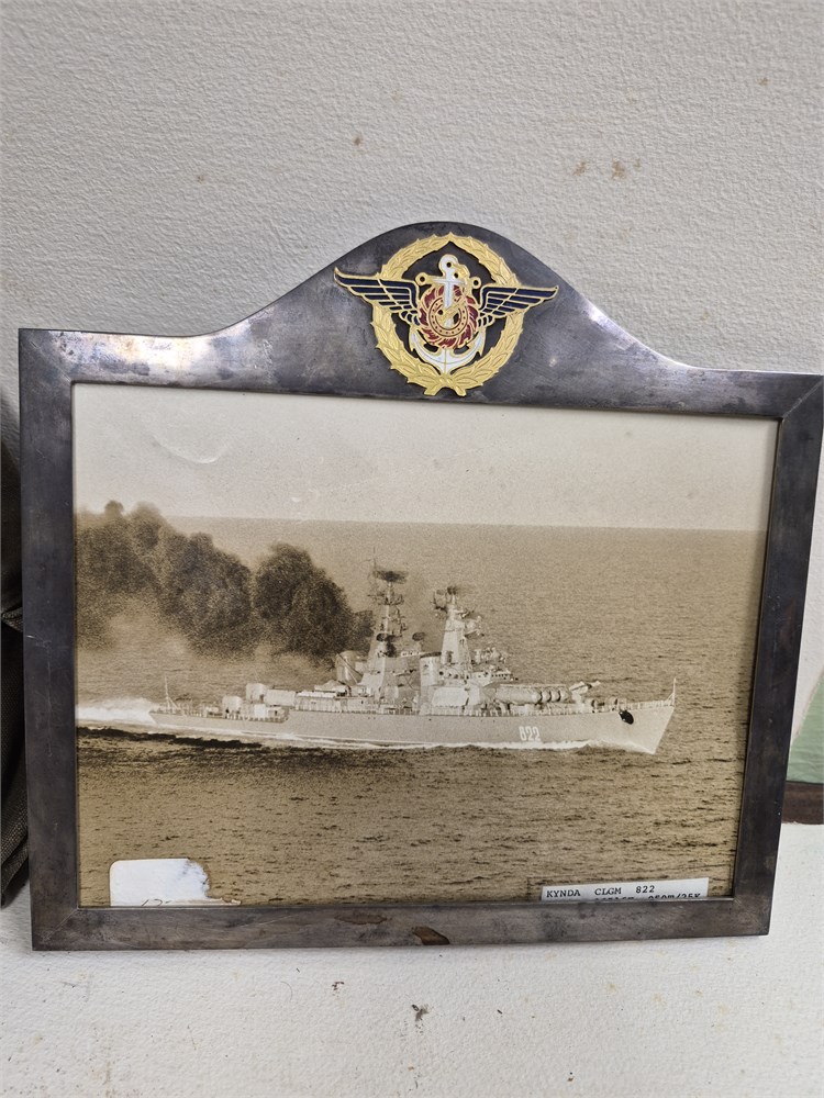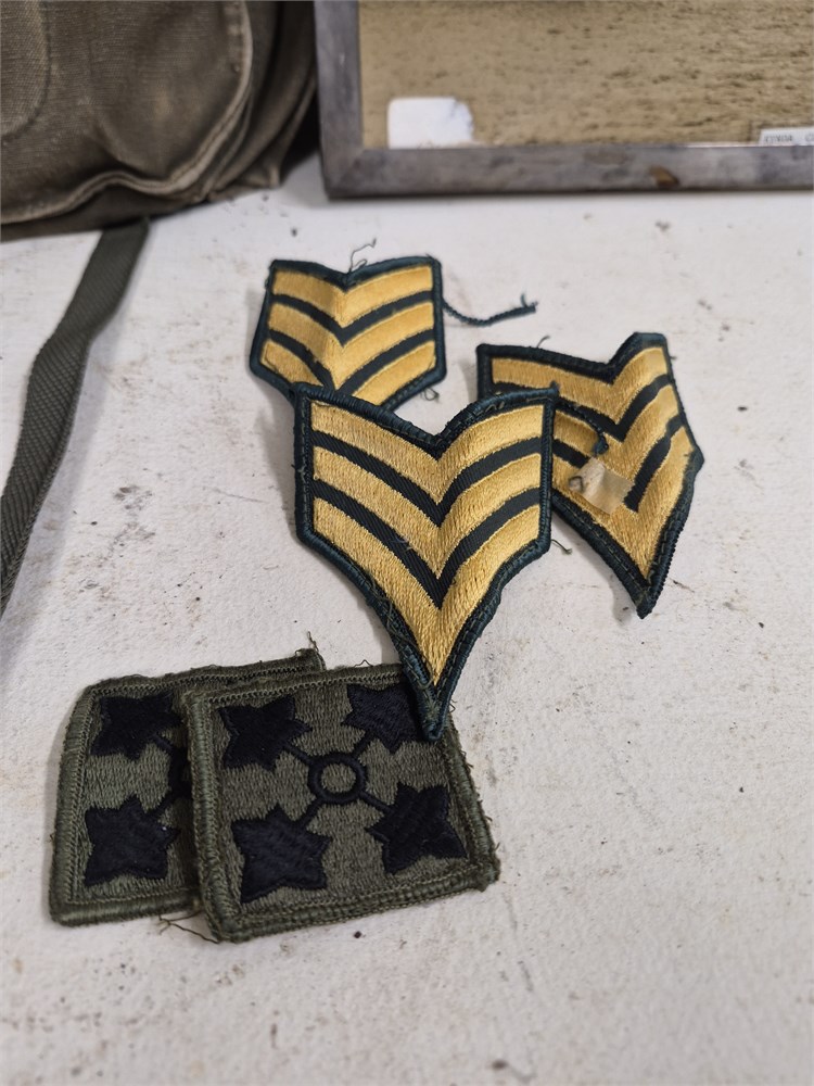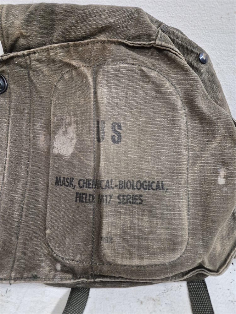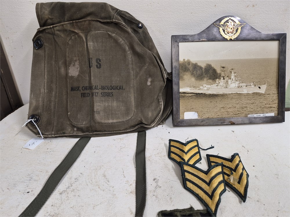 Lot of military items includes gas, mask, bag, ship picture and pachos