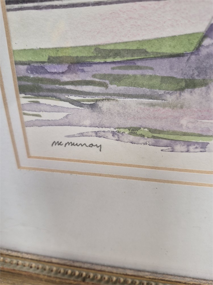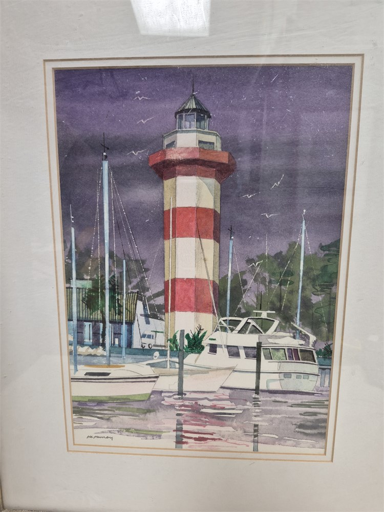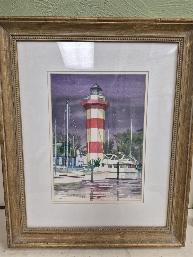 Nice framed, and artists signed watercolor lighthouse with boats.