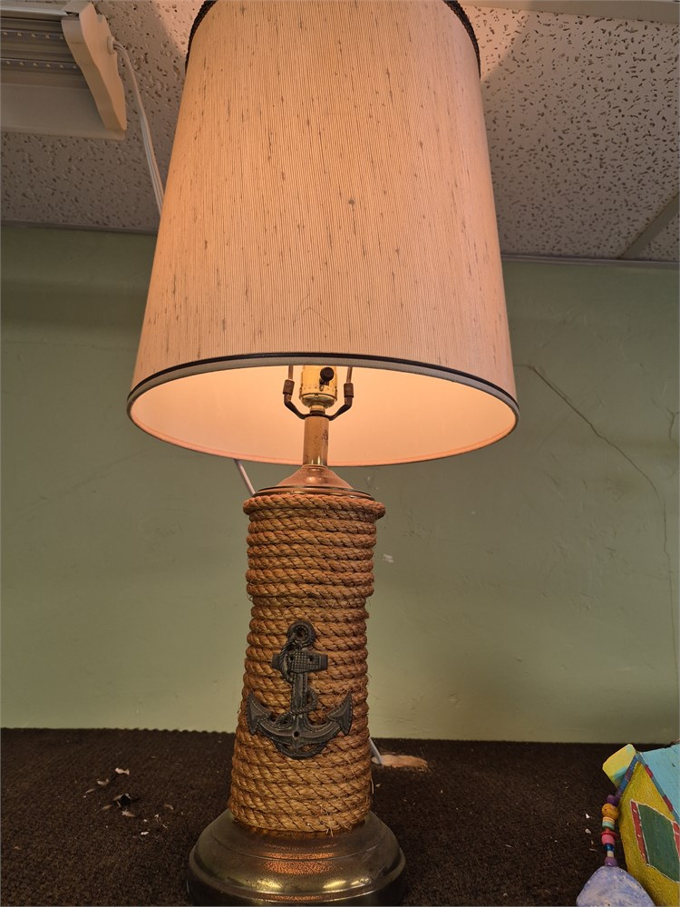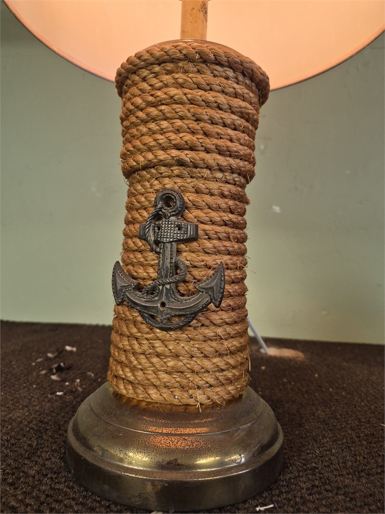 Vintage lamp with a base looking like rope and an anchor fixed on the rope.