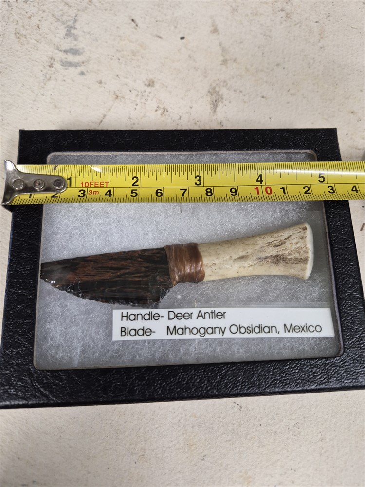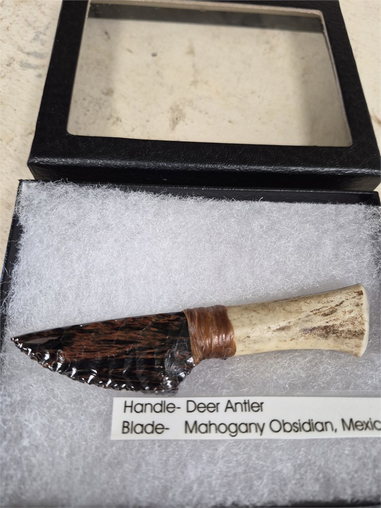 Very cool little deer antler knife with a mahogany obsidian blade. Comes in cool little.display box.