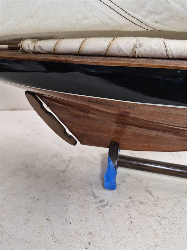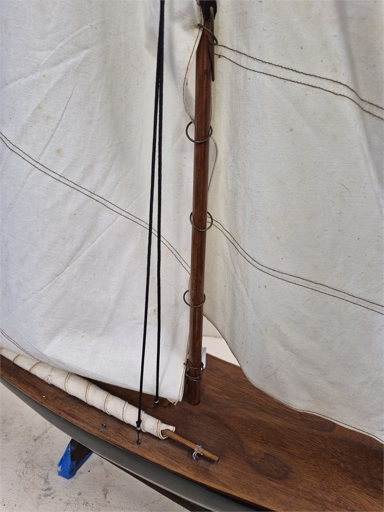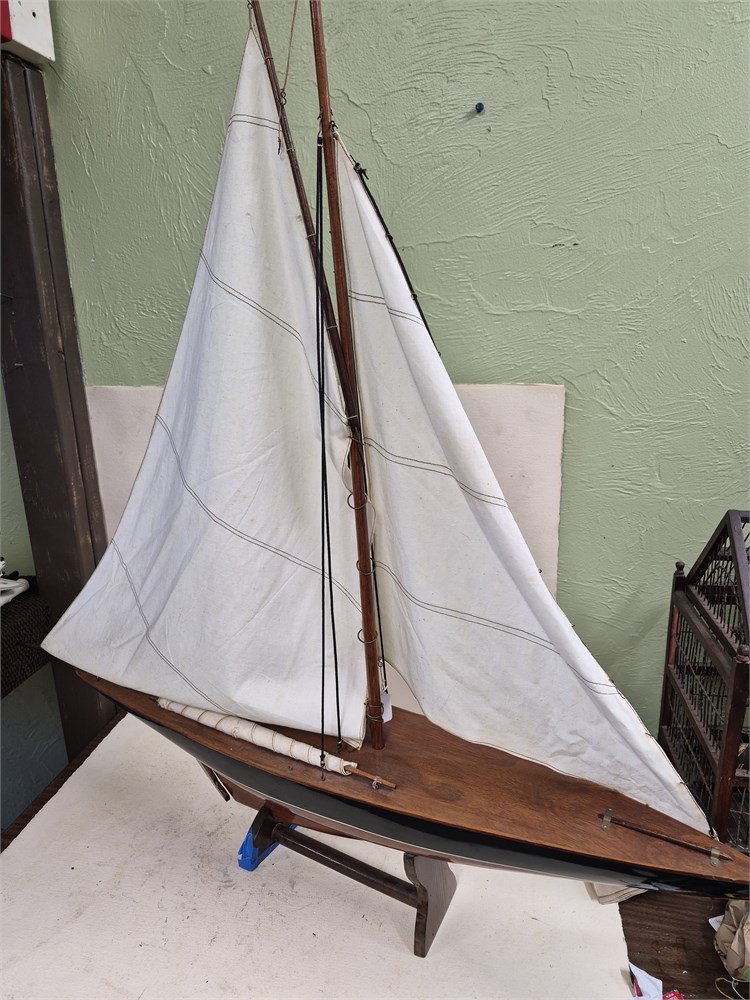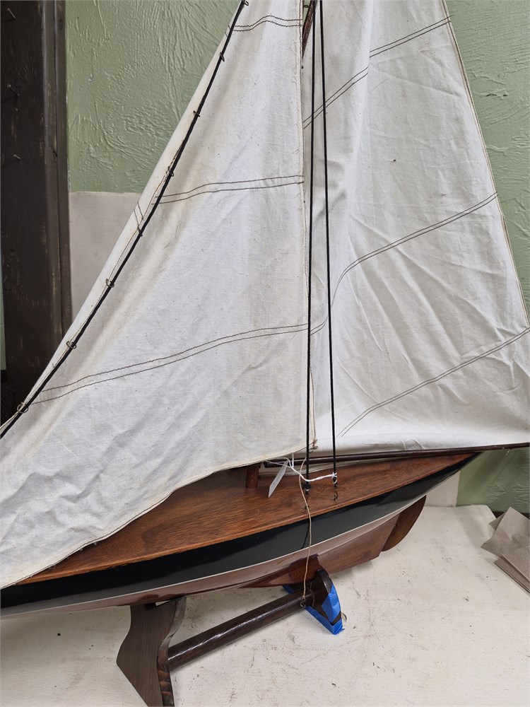 Nice, large wooden model sailboat.Sailboat measures thirty two inches long and stands forty inches tall to the top of the sail.Boat is in good condition.Stand and need some repairs.There may need some little touch ups here and there.