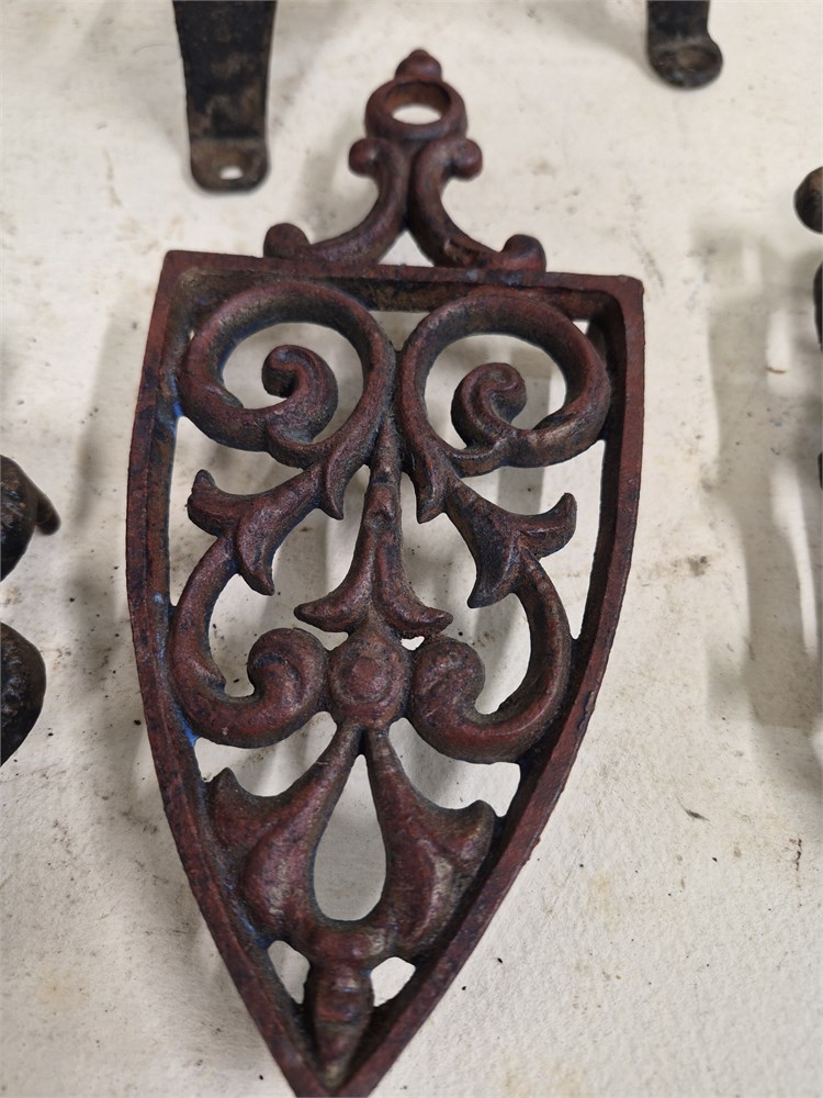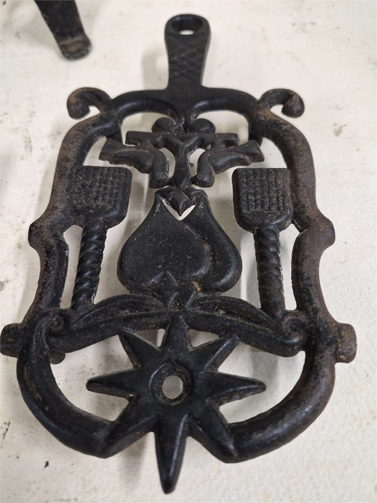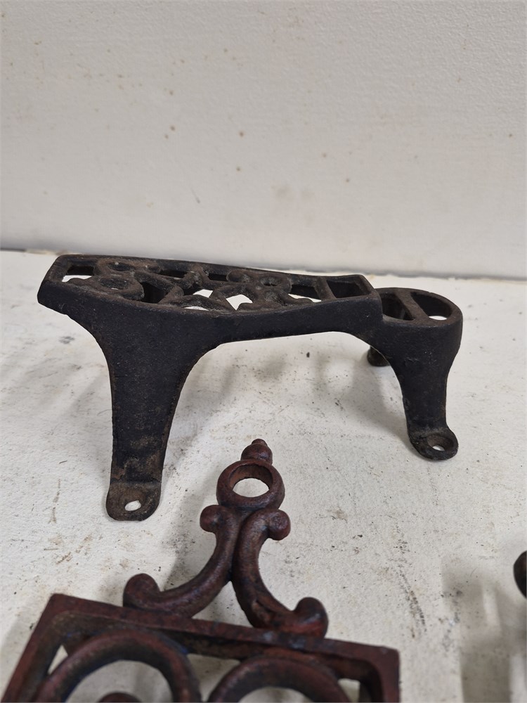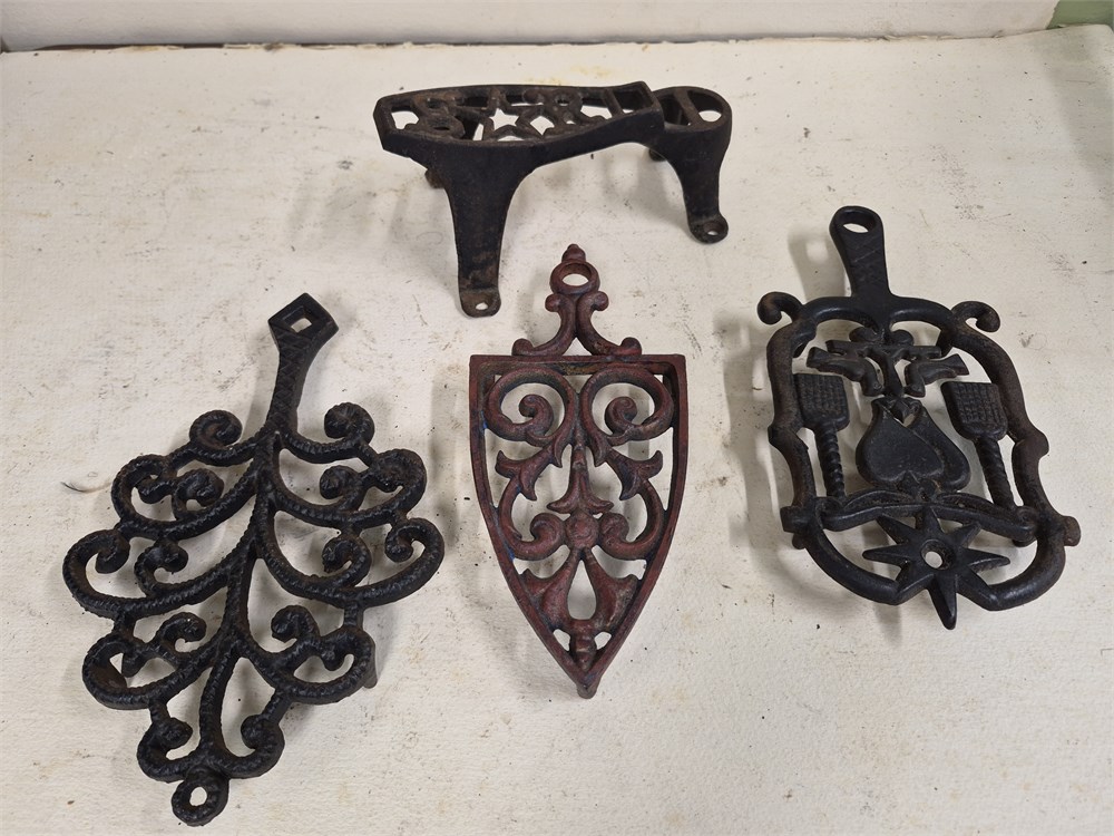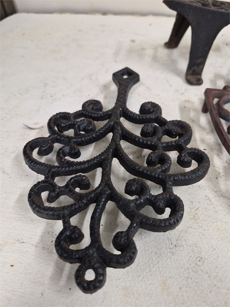 Cast iron lot looks to be three trivets, and possibly a shoe cobbler piece.